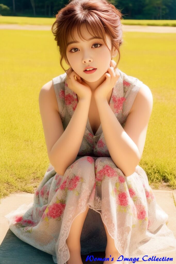 この画像は、緑豊かな自然の中で過ごすリラックスした雰囲気を捉えた一枚です。女性はシンプルでありながらもエレガントな白いドレスを着ており、その軽やかな風合いと、ナチュラルで落ち着いた表情が印象的です。春から夏にかけての温かな季節にぴったりのスタイルで、日常的なコーディネートにも特別なイベントにも適した魅力的なアイテムです。女性らしさを引き出すシンプルなデザインが、どんなシーンにも自然に馴染みます。