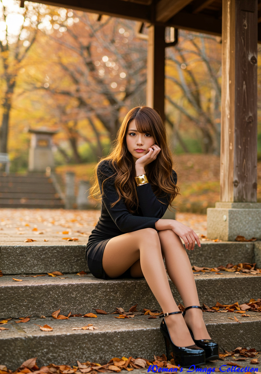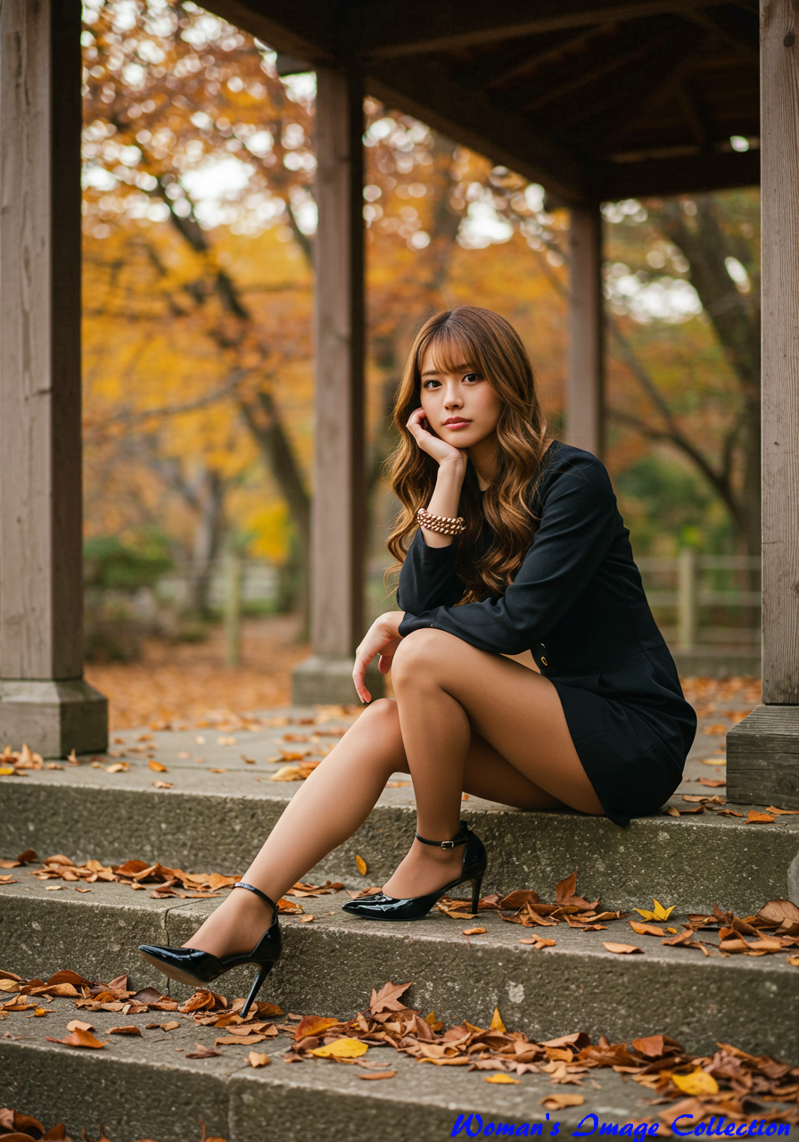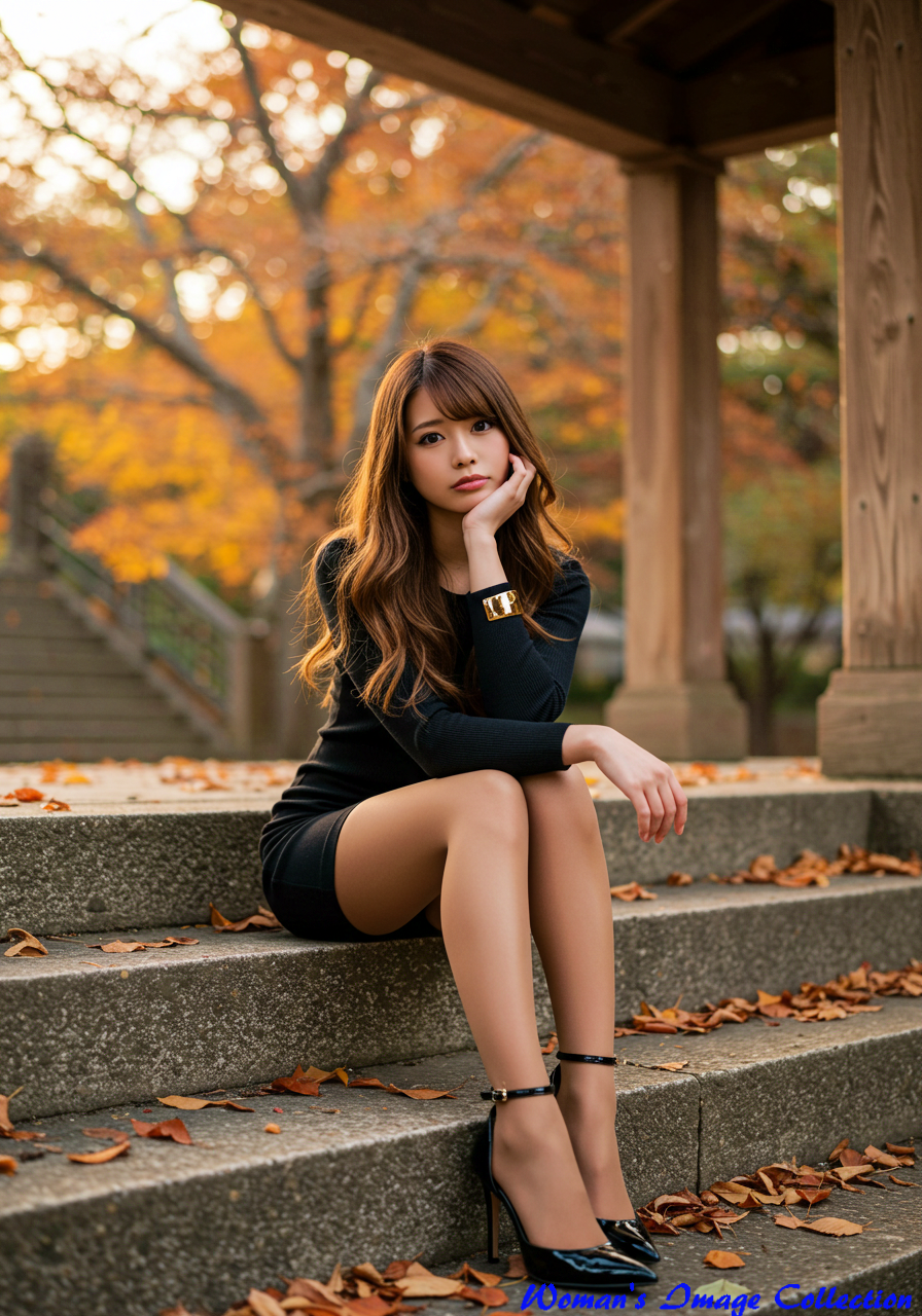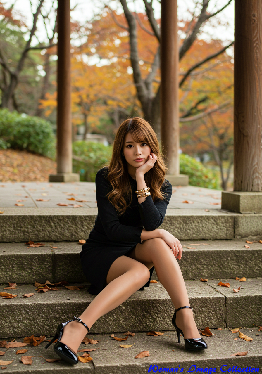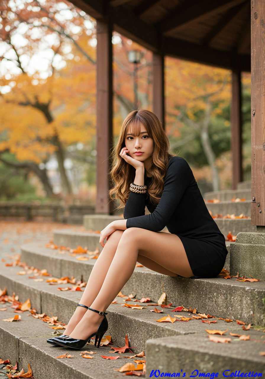 Emotion / Pose: 頬杖をつき、少し物憂げで思慮深い表情、階段に両足を広げて座り、エレガントでありながらリラックスしたポーズ