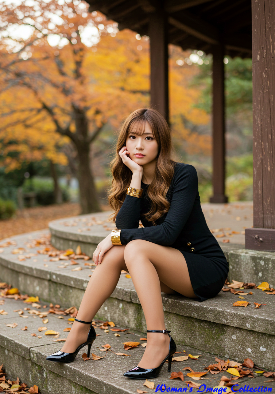 Clothing / Equipment: フィット感のある黒のミニドレスまたはミニスカート、足首にストラップのある光沢のある黒のハイヒール、手首にはゴールドの太めのバングル