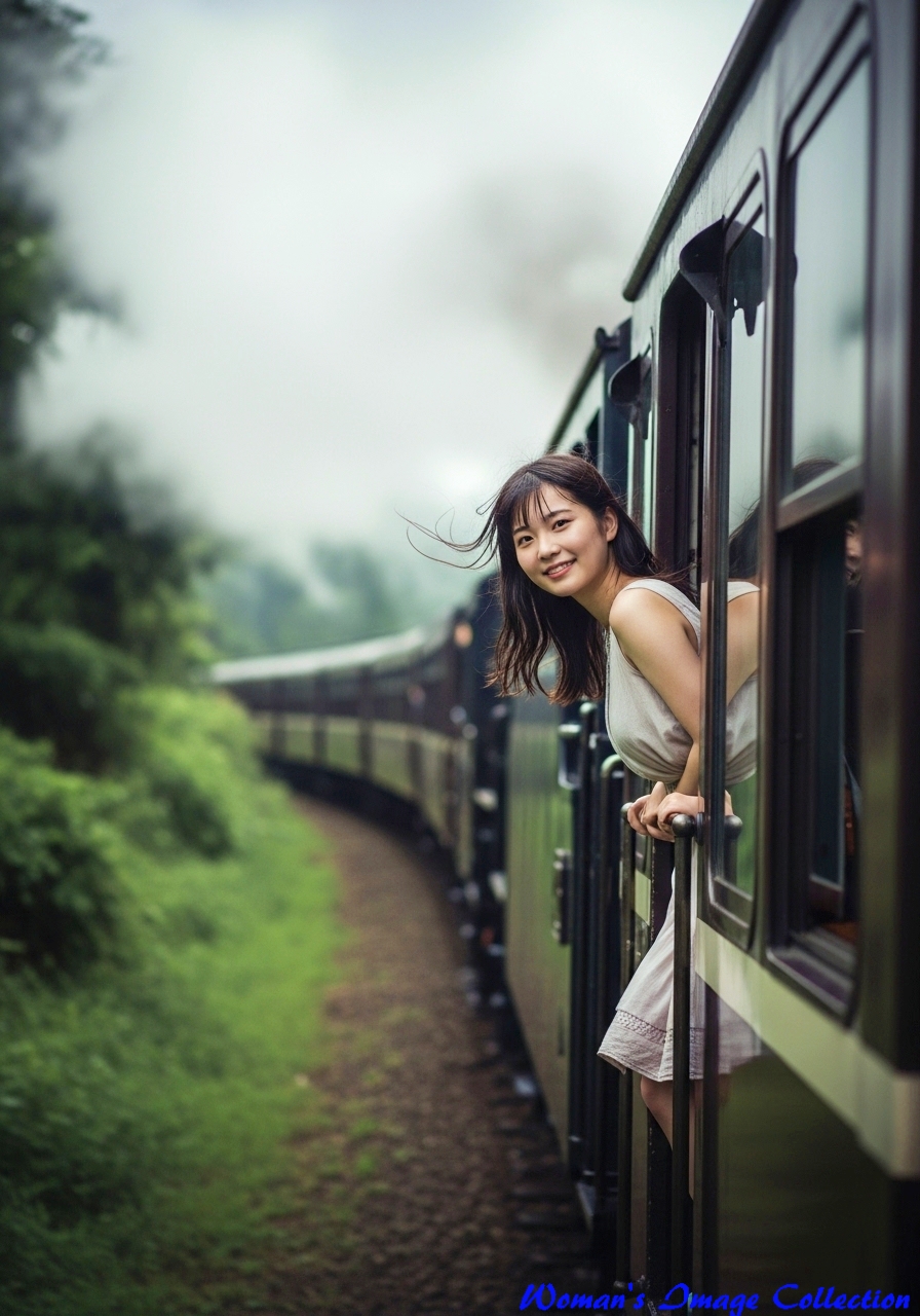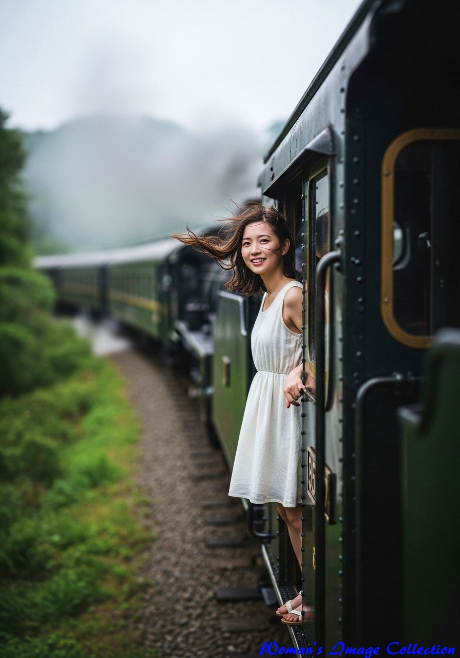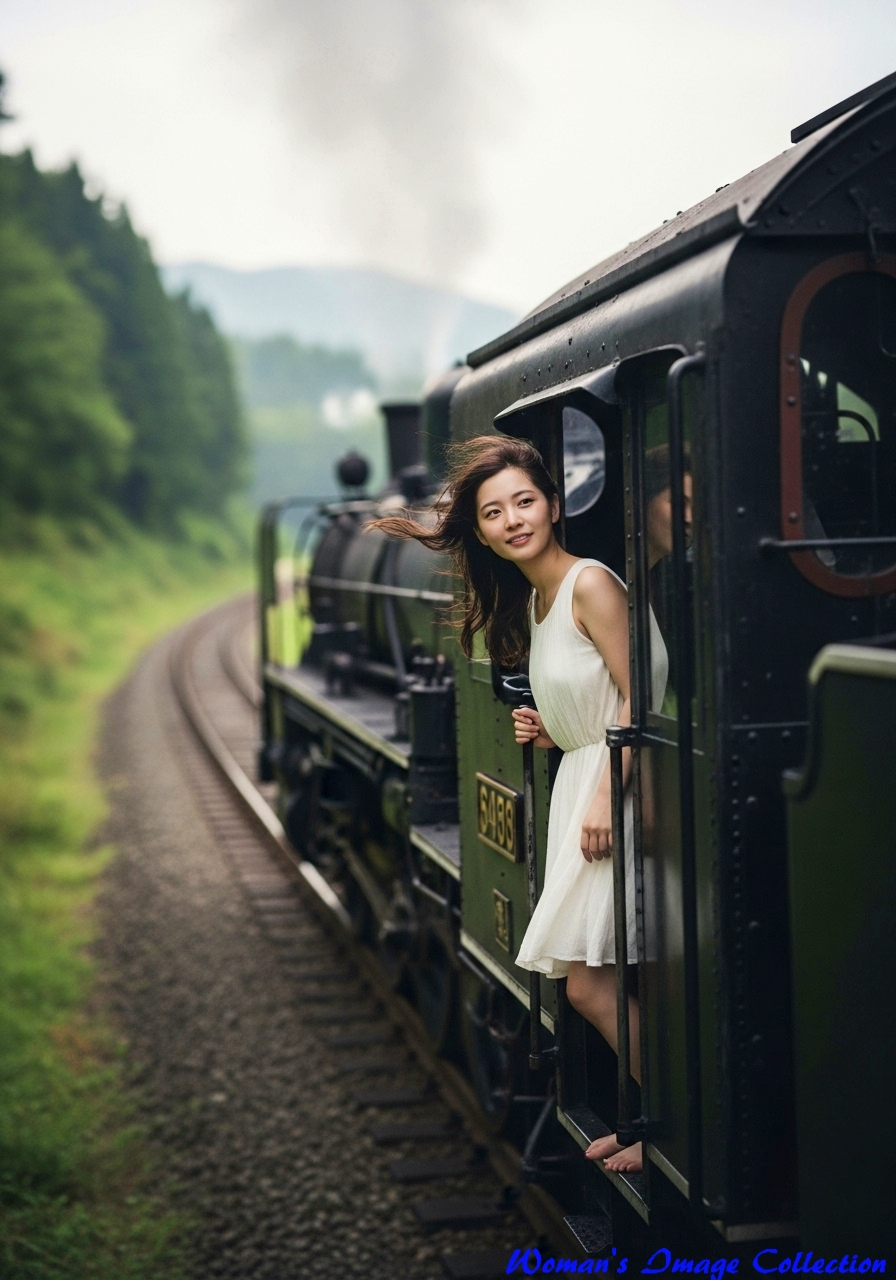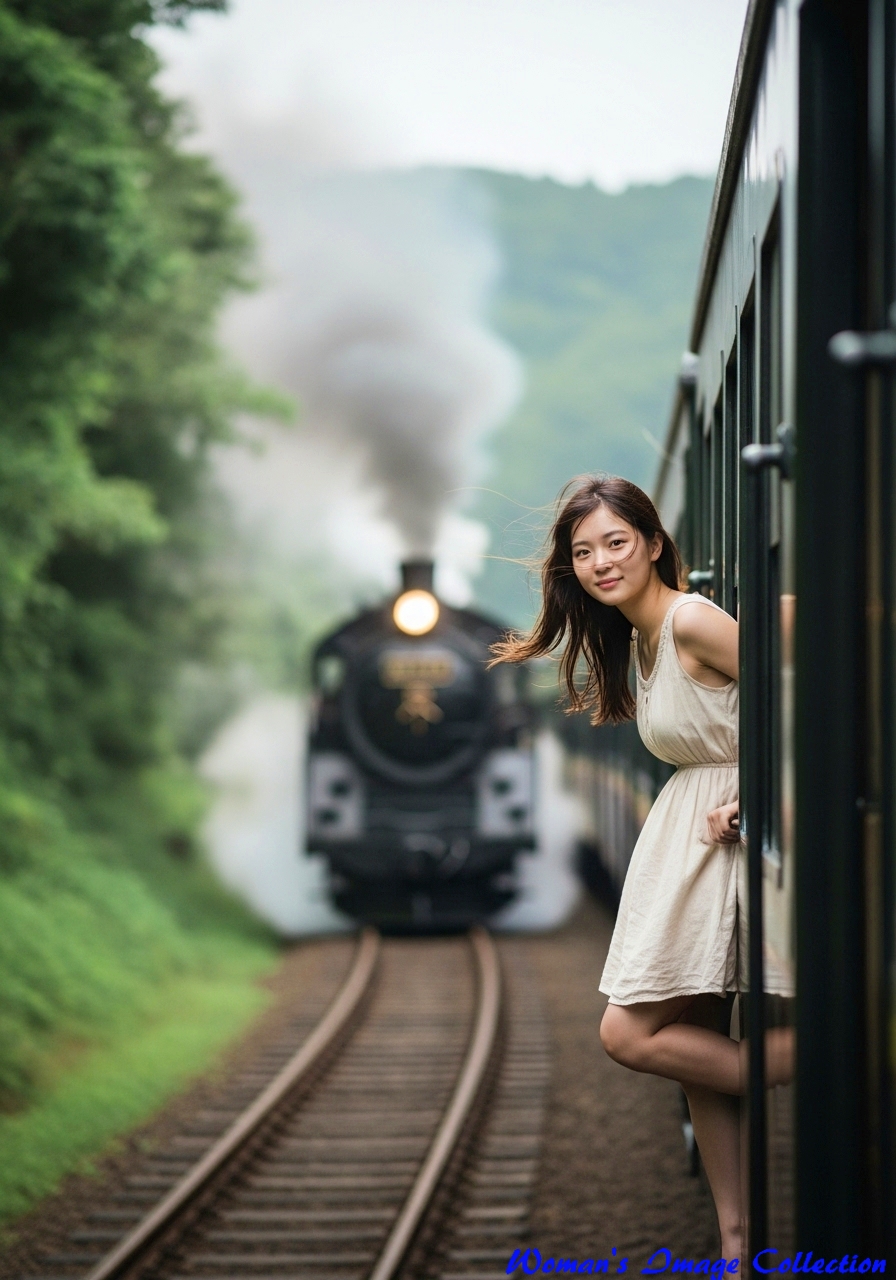 蒸気機関車のドアから外の景色を見ている女性のプロンプト
