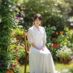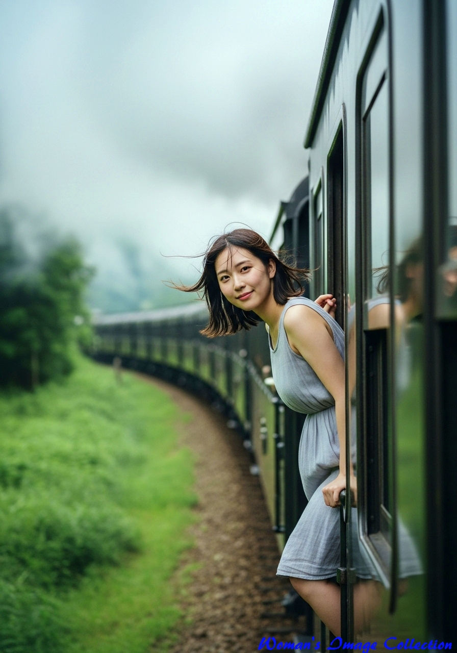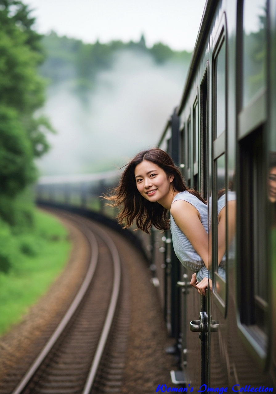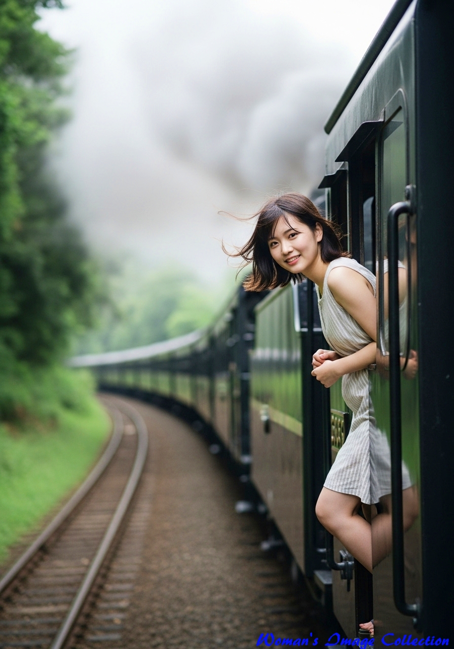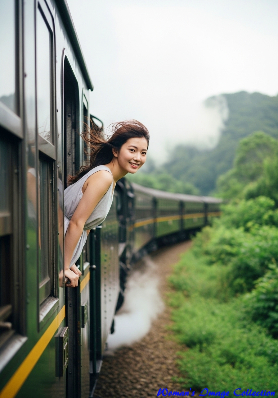 蒸気機関車のドアから外の景色を見ている女性のプロンプト