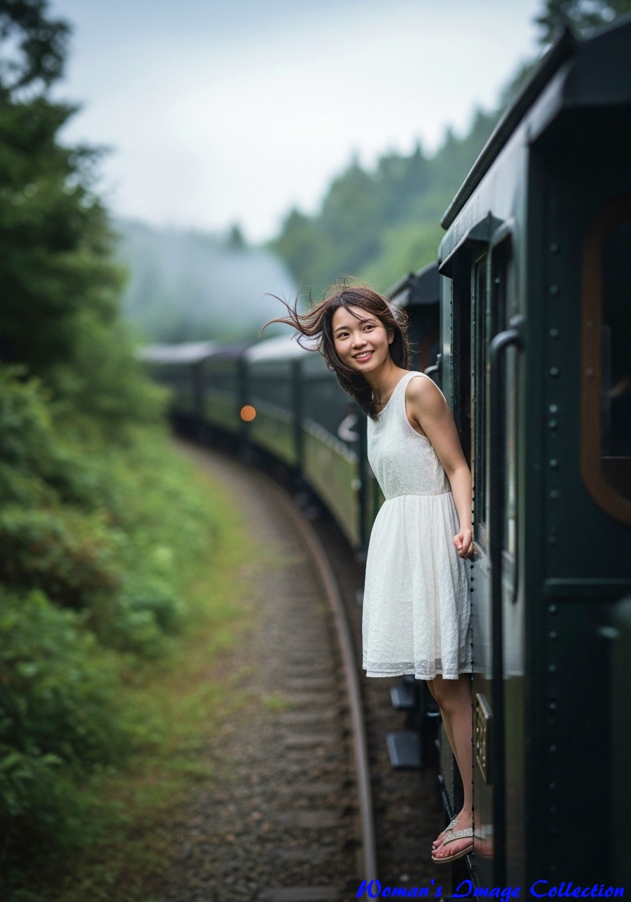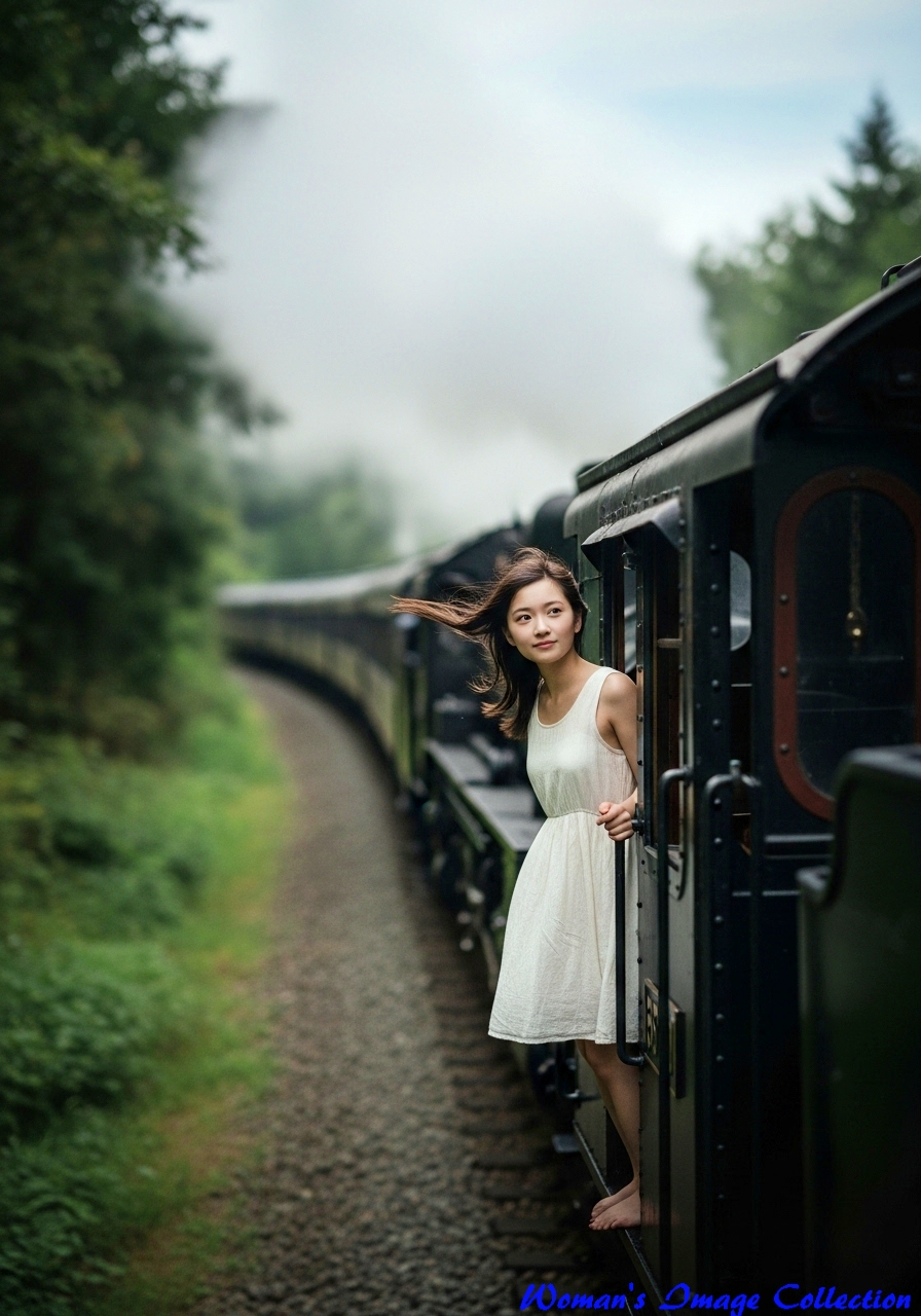 少女を中心にチルトシフト効果を使って少女を幻想的に表現する。かわいい笑顔、アーモンド形の瞳、小さな鼻、色白、小顔の日本人の少女。カーブを疾走する古い蒸気機関車。開いた古びた機関車のドアから上体だけを少し外に乗り出し、強い風を体に感じながら遠くの景色を笑顔で見つめている10代前半の白い夏らしいシンプルでゆったりとしたノースリーブのミニワンピースを着た少女。強い風が顔に当たり大きくなびく髪、深い森、ドラマチックな構図。目線はカメラ。ミニチュア。