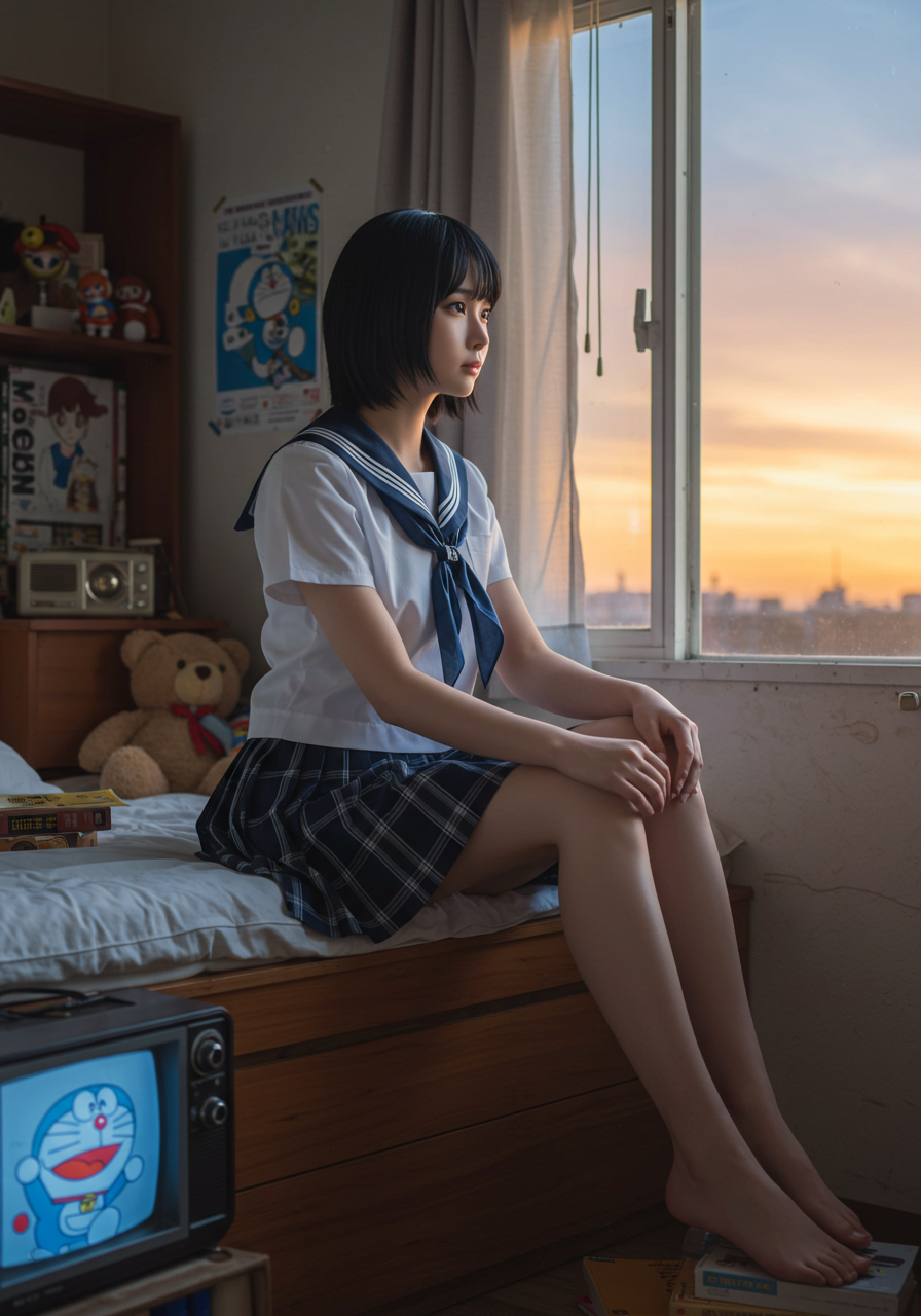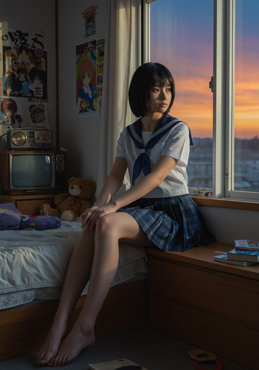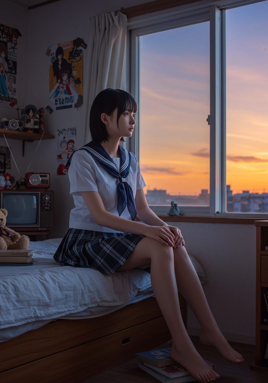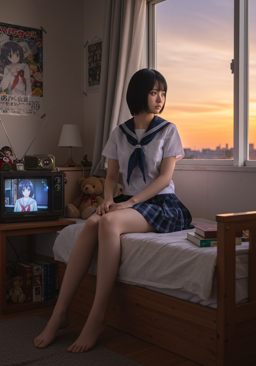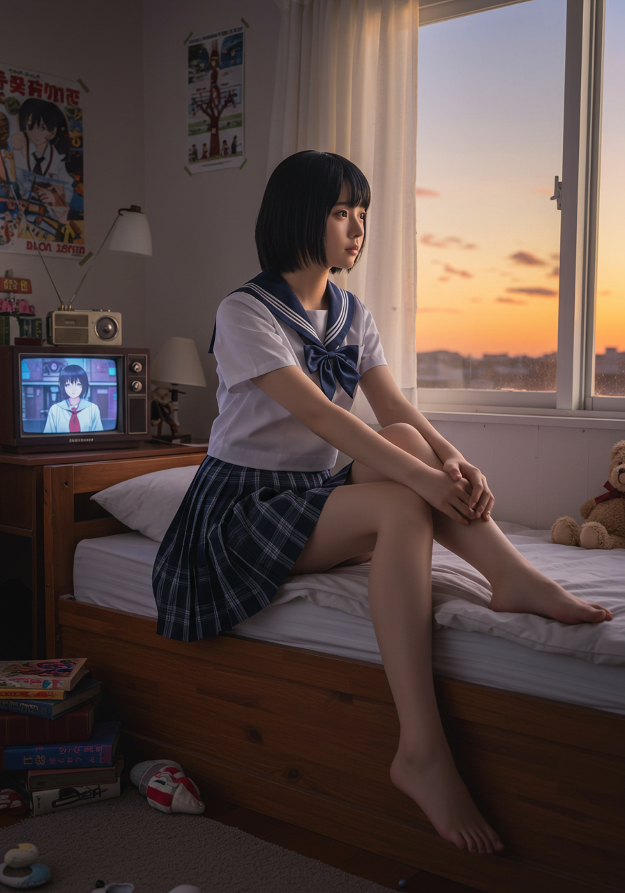 Background Details: 木製のベッドフレーム、白い壁。右奥の窓からは夕焼けのオレンジと紫のグラデーションが見える。左手にはレトロなテレビ、ラジオ、アニメのポスター。ベッドの上にはクマのぬいぐるみと数冊の本。