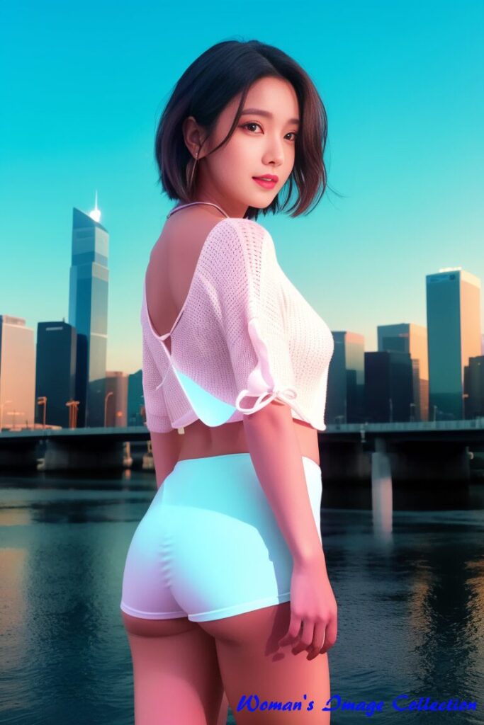 この画像が描くスタイルは、都会的で洗練された雰囲気を持つホワイトコーディネートの魅力が詰まっています。背後に広がる美しい夜景に溶け込むような、シンプルながらも女性らしさを引き立てるデザインが印象的です。このファッションは、涼やかで清潔感のある白を基調としながら、さりげないディテールが魅力を一層高めています。夏の夜を楽しむ場面や、特別なひとときを過ごす際にぴったりのスタイルです。