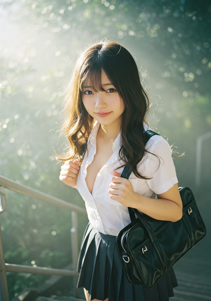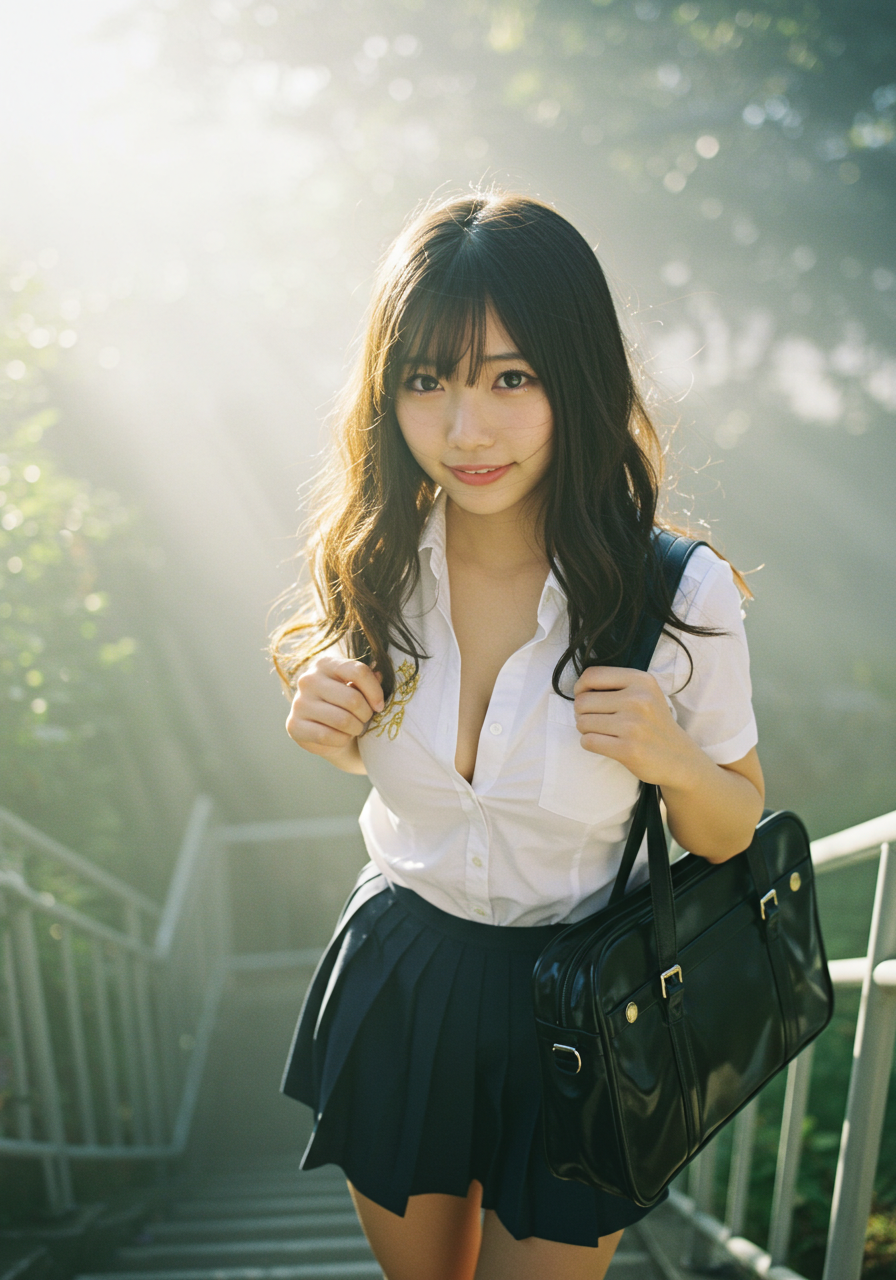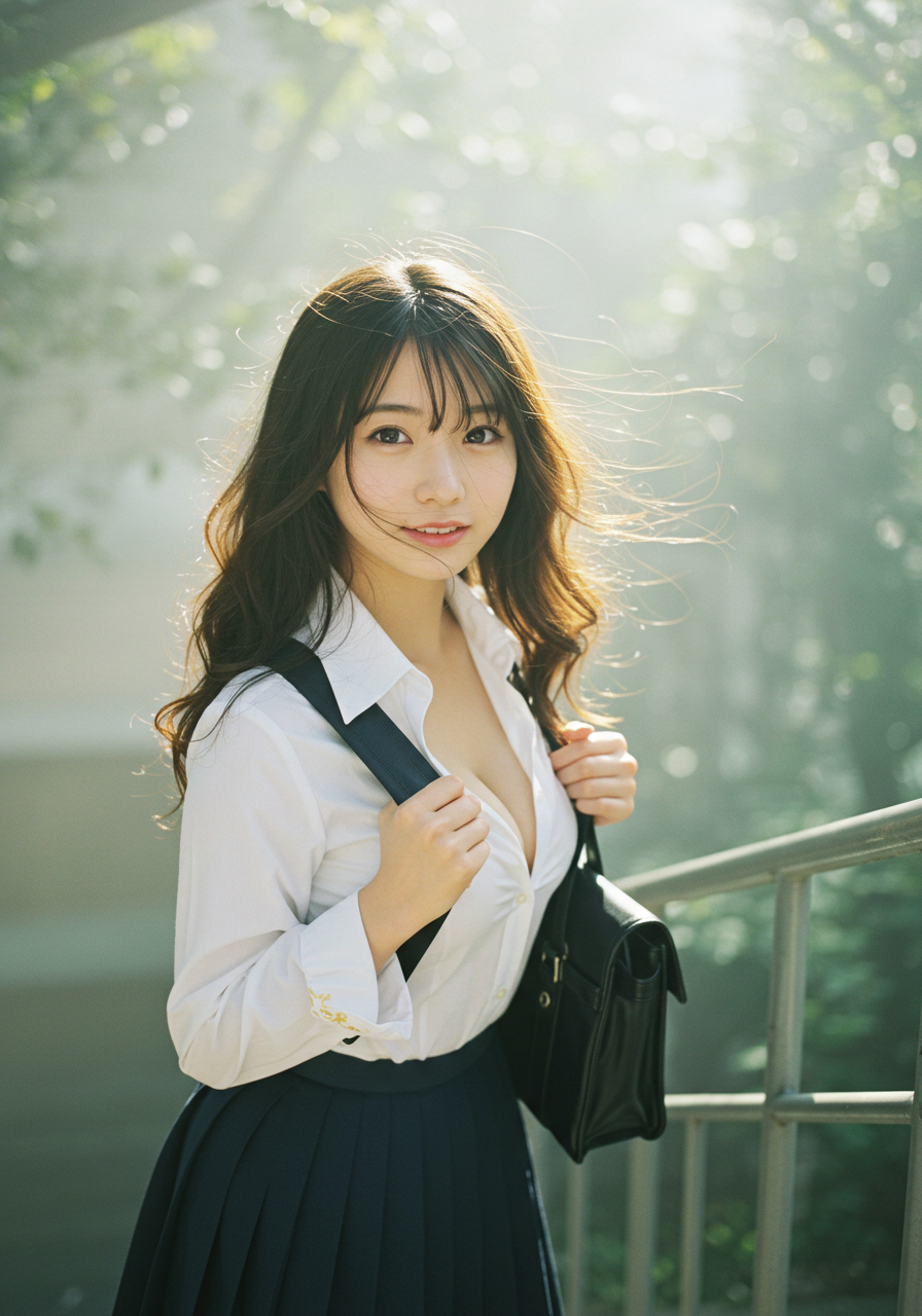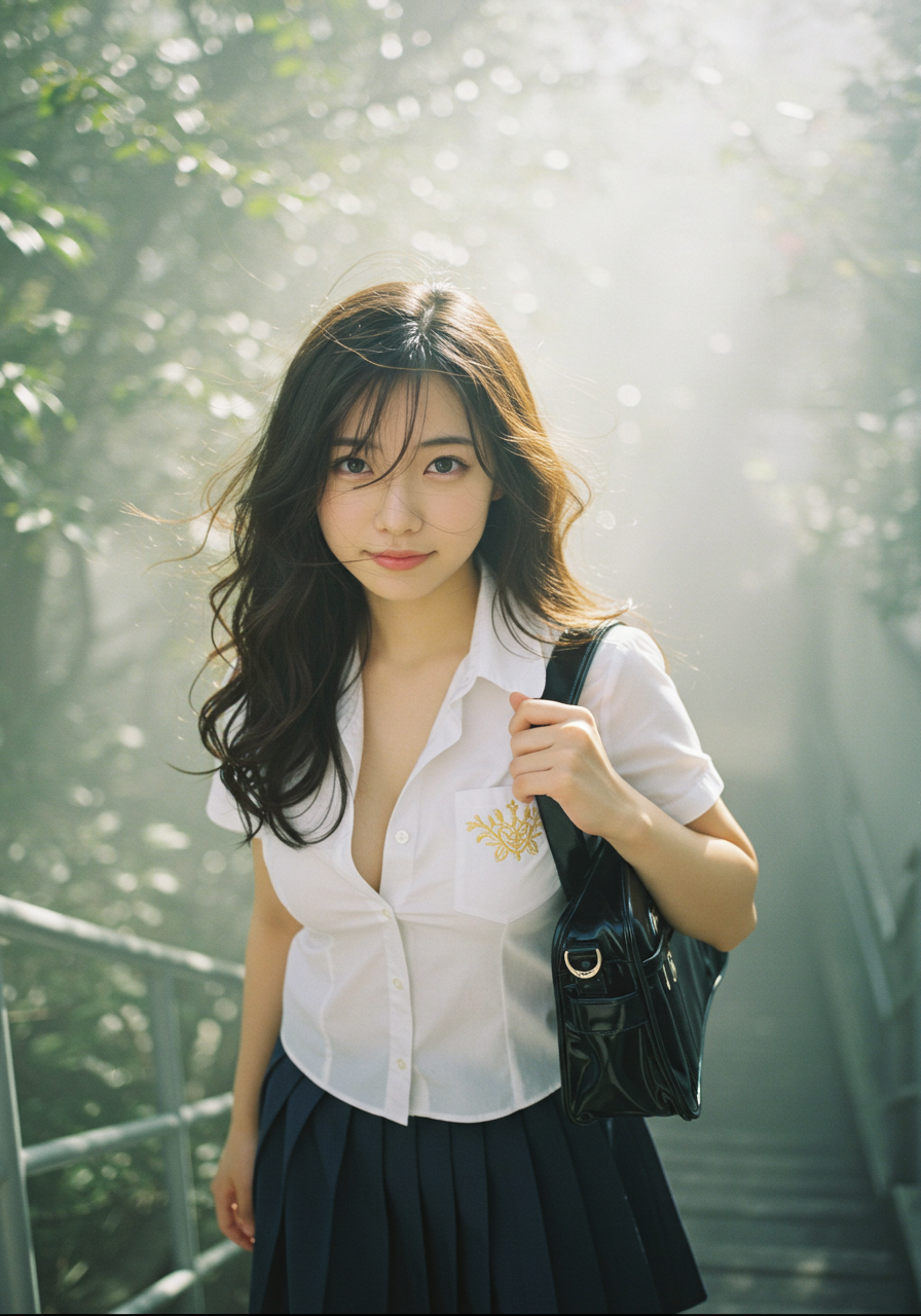 Emotion / Pose: 悲しい微笑、学校の階段を昇る姿、風になびく髪が顔の一部にかかり、よりドラマチックな表情に、エロチシズム、