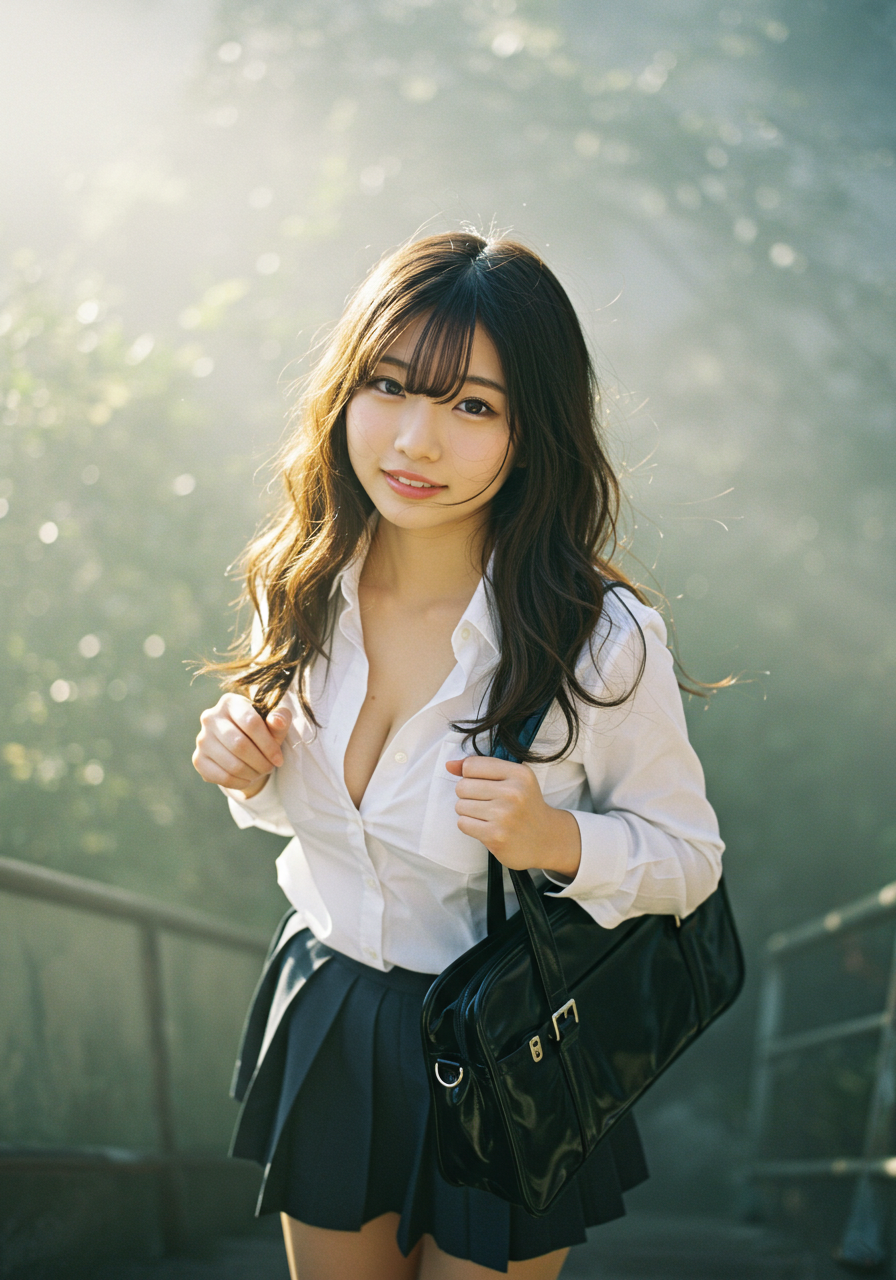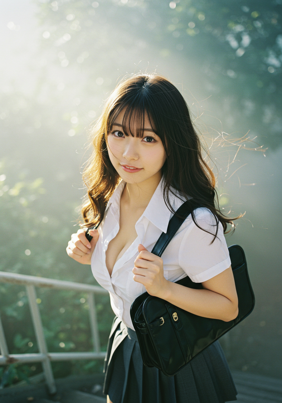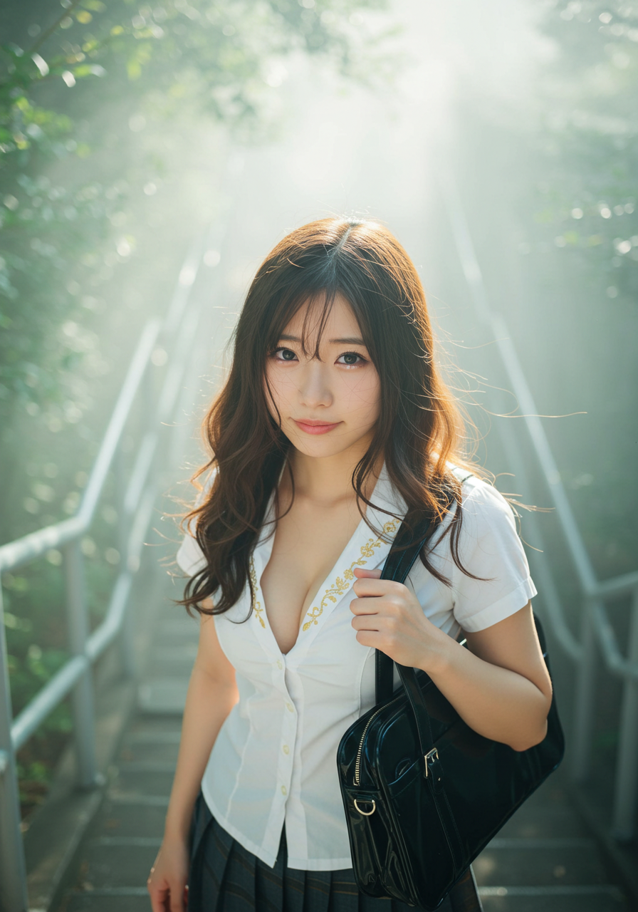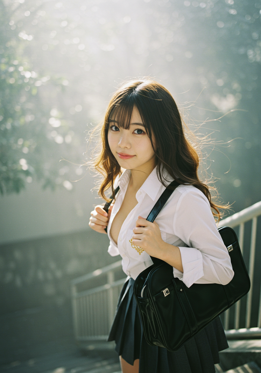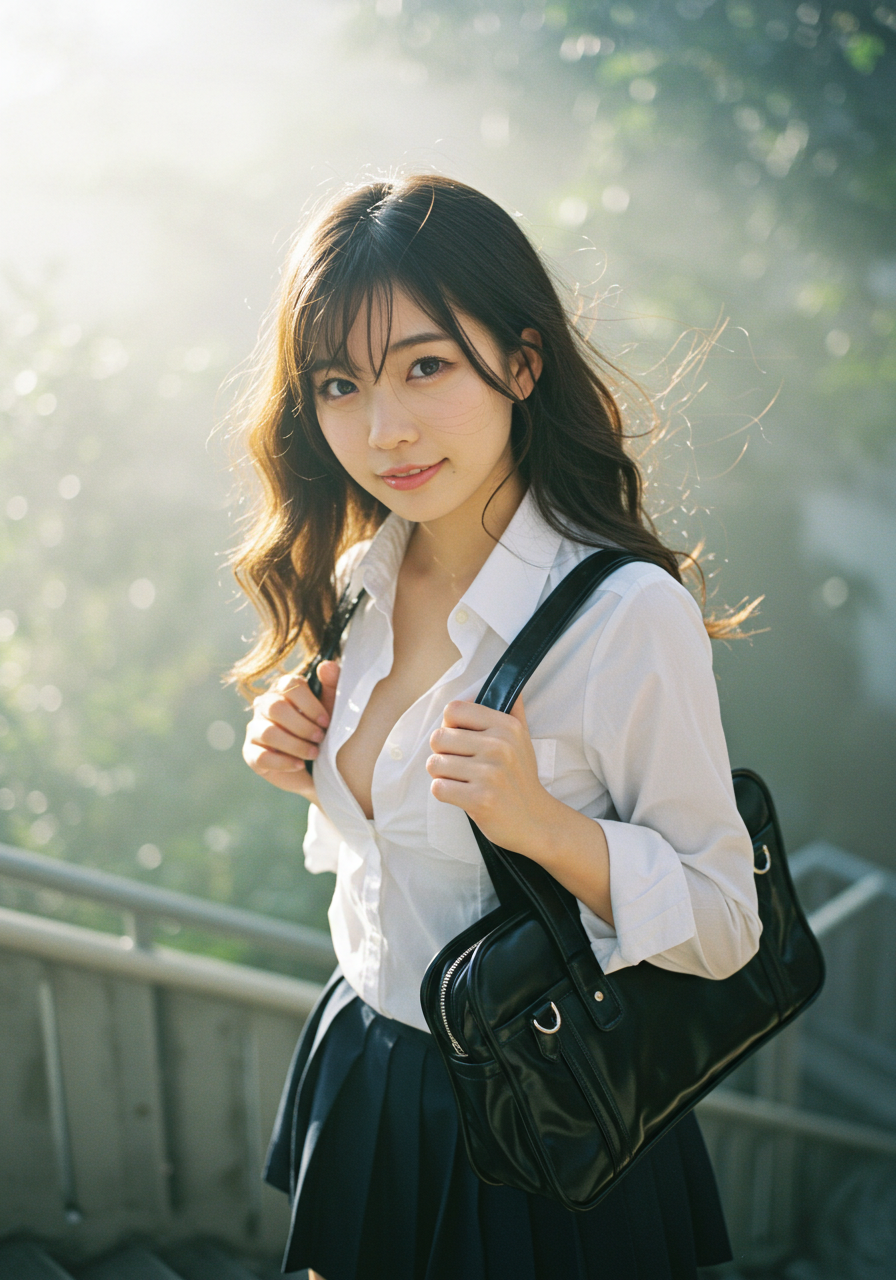 Emotion / Pose: 悲しい微笑、学校の階段を昇る姿、風になびく髪が顔の一部にかかり、よりドラマチックな表情に、エロチシズム、