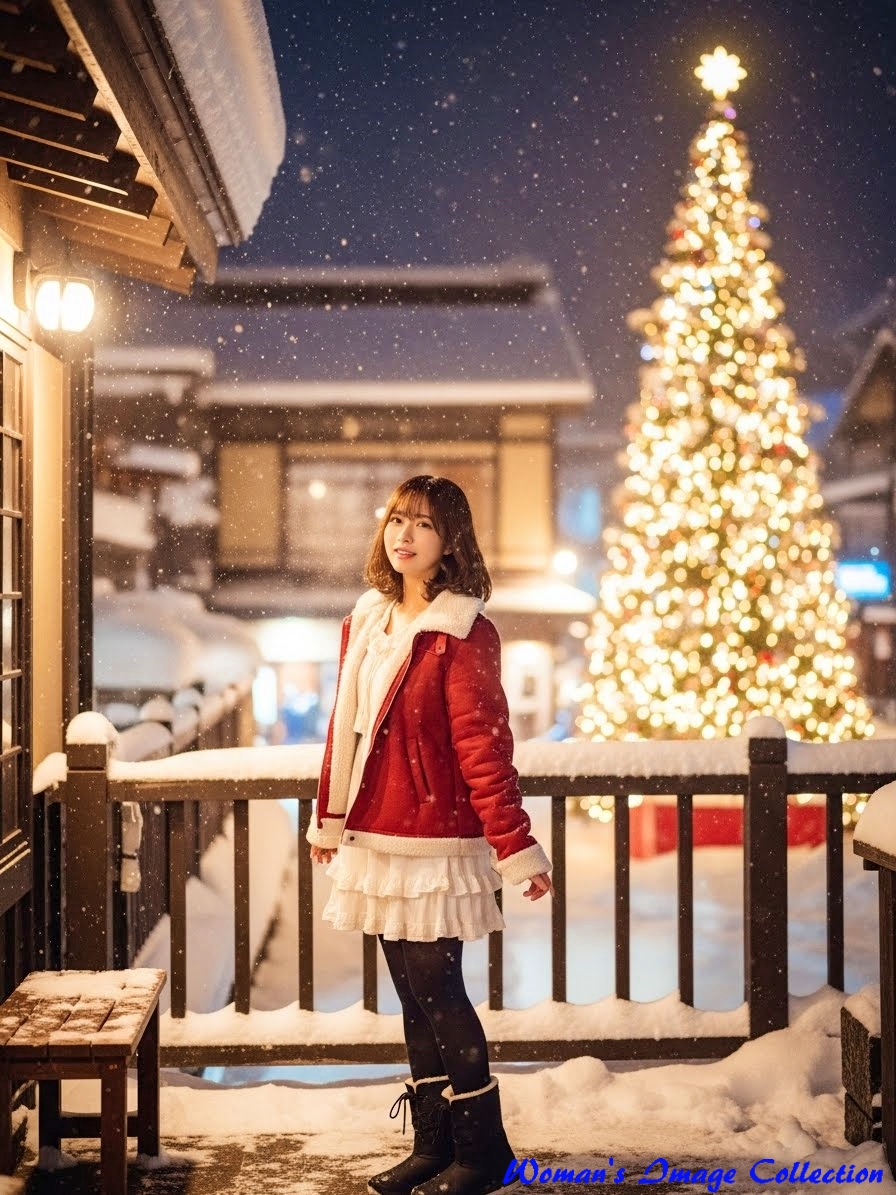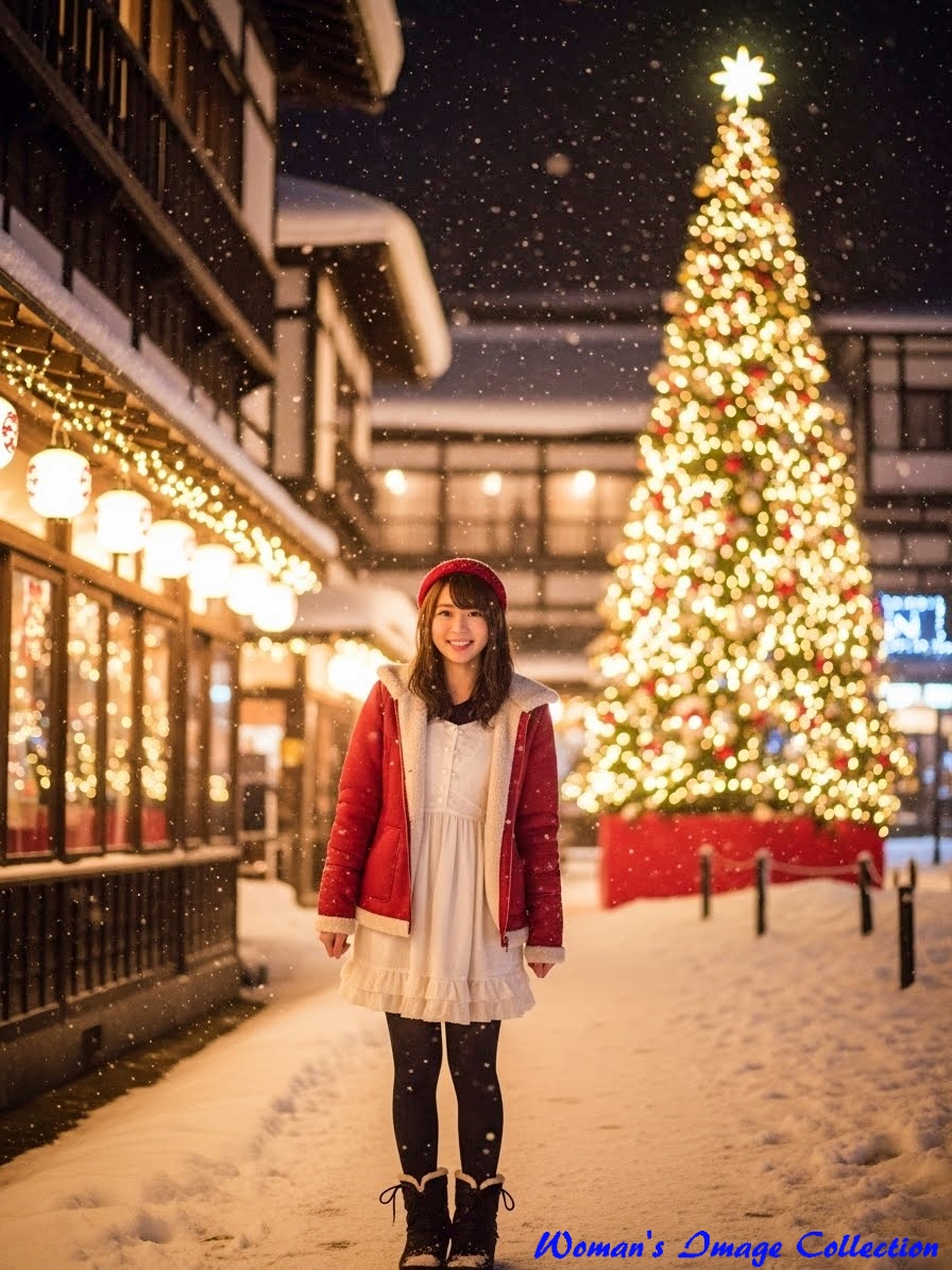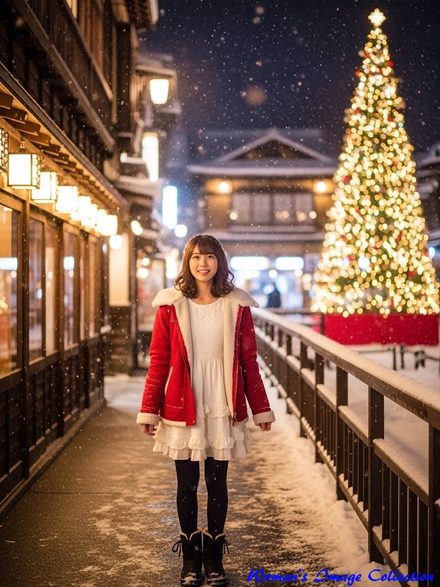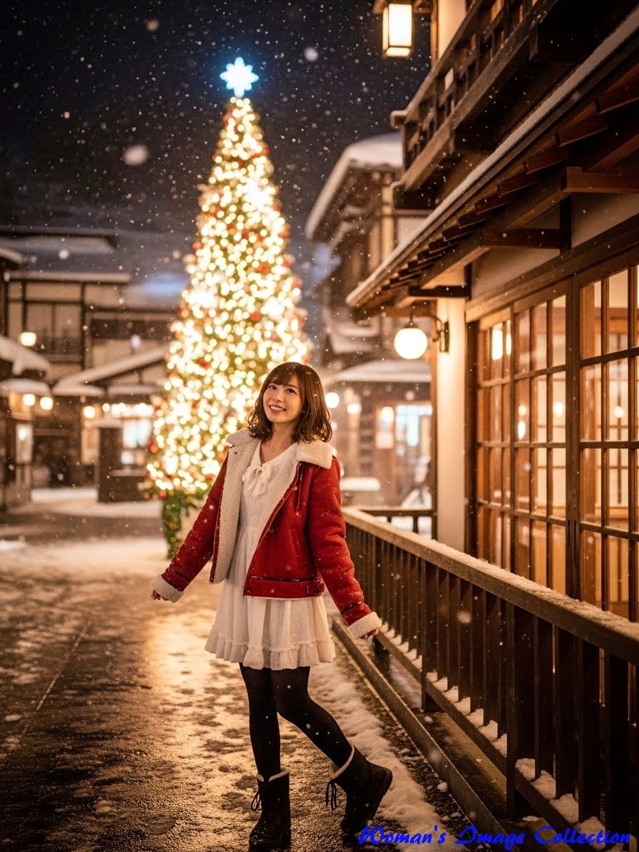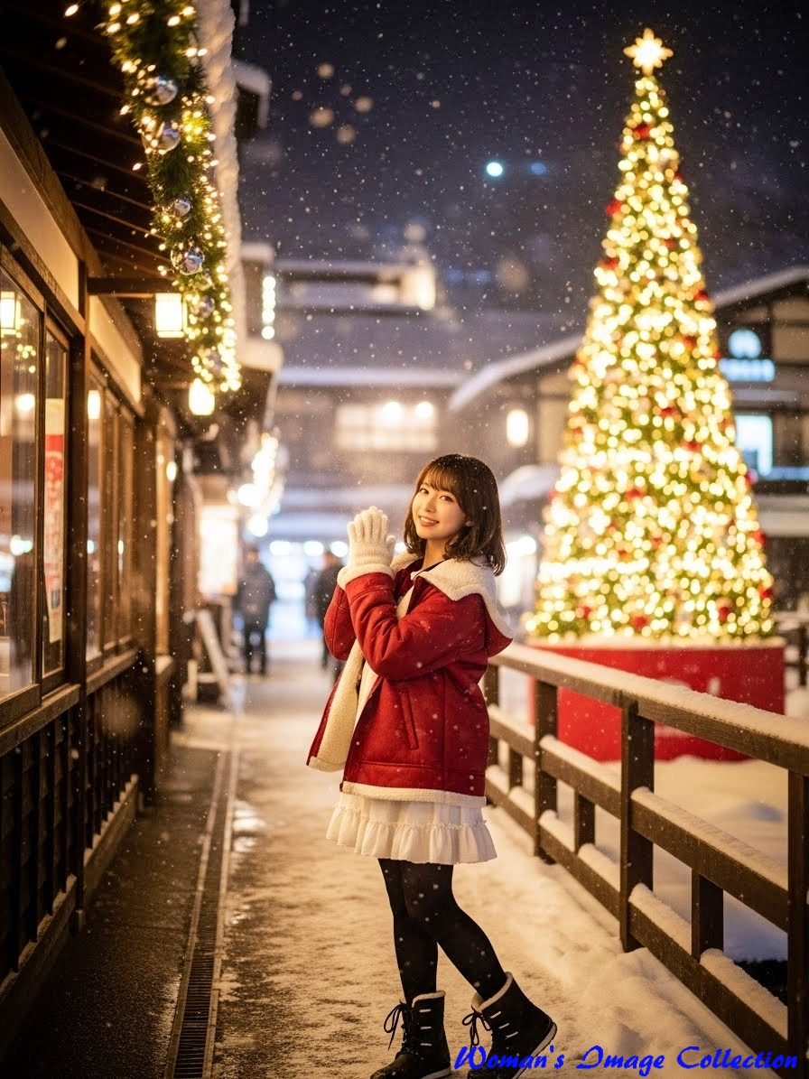 背景 (日本の歴史的な木造建築の温泉街, 雪が積もった屋根と手すり, 煌びやかに装飾された巨大なクリスマスツリー, 舞い落ちる雪, 賑やかなクリスマスの雰囲気),