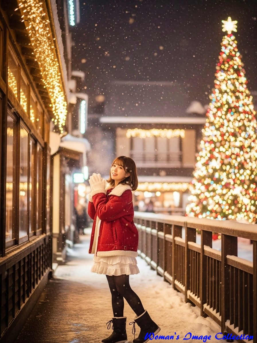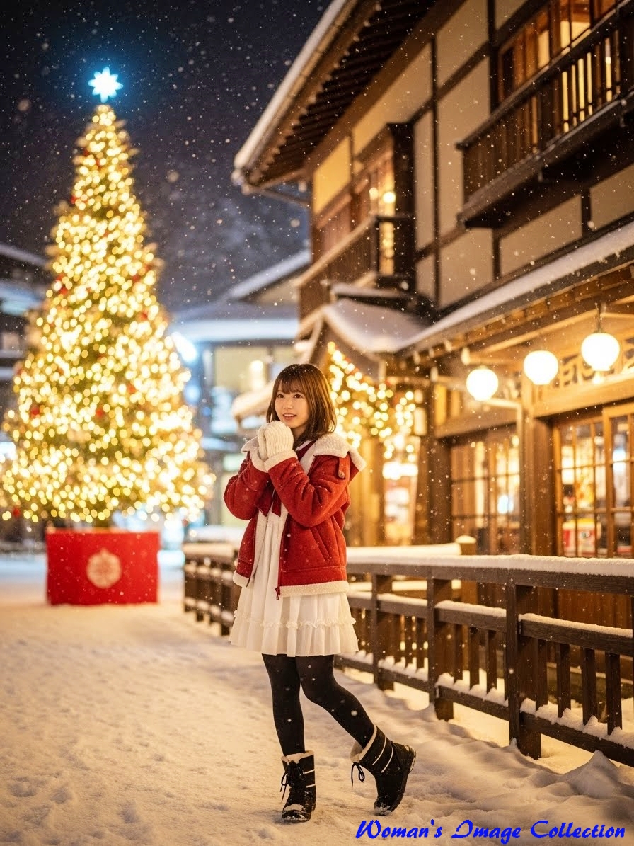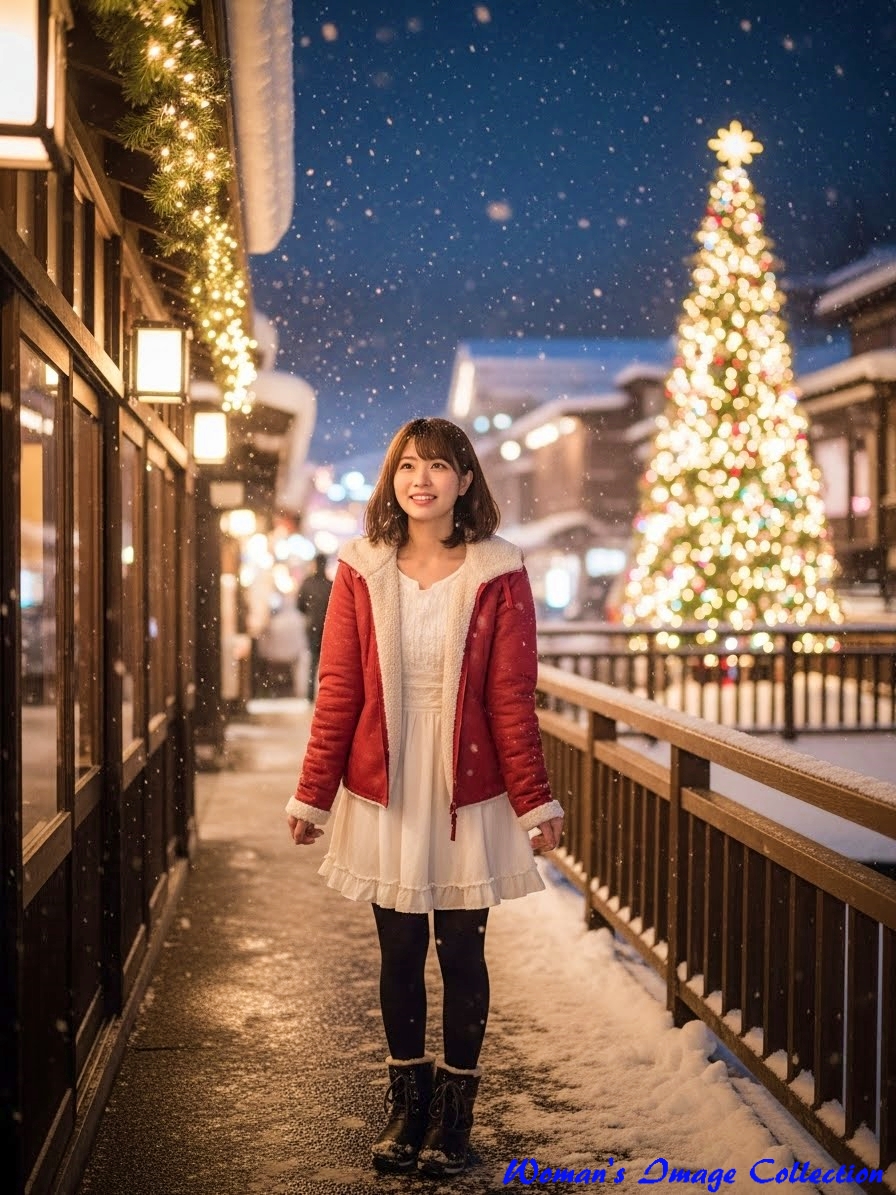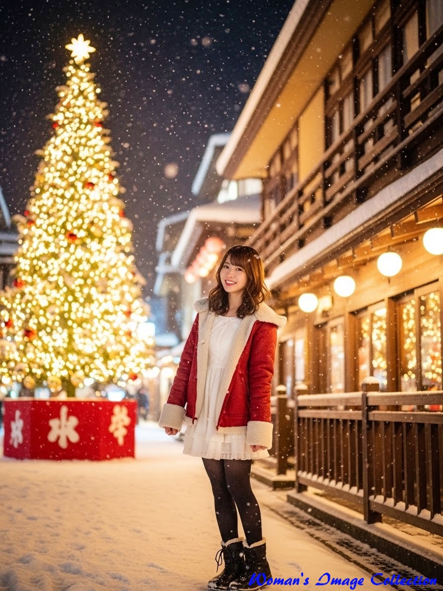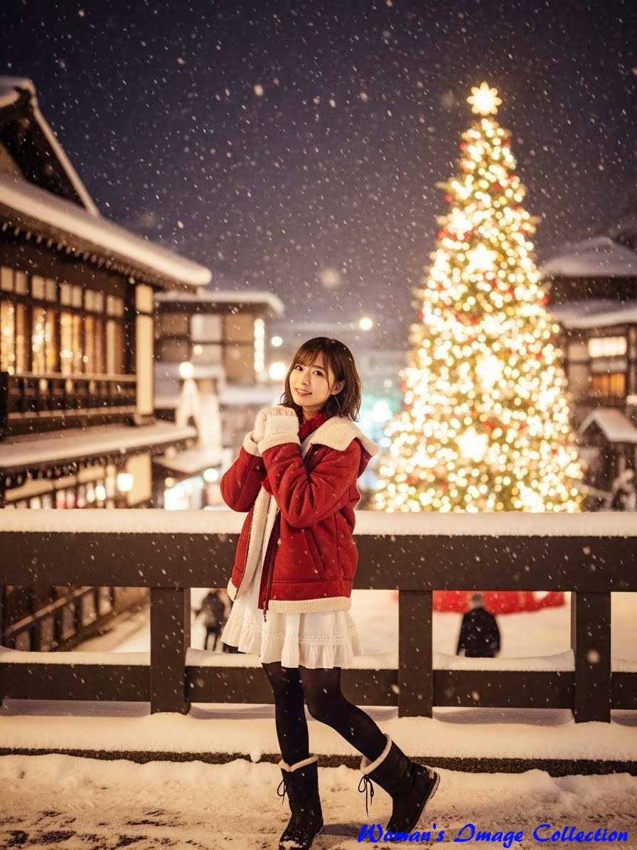 背景 (日本の歴史的な木造建築の温泉街, 雪が積もった屋根と手すり, 煌びやかに装飾された巨大なクリスマスツリー, 舞い落ちる雪, 賑やかなクリスマスの雰囲気),