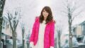 被写体 (10代後半の若くかわいい肌の白い日本人女性, 茶色のミディアムヘア, 喜びの表情, 厚手のボア付きの赤いジャケット, 白いフリルのあるワンピース, 黒いタイツ, スノーブーツ),