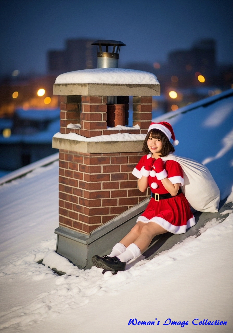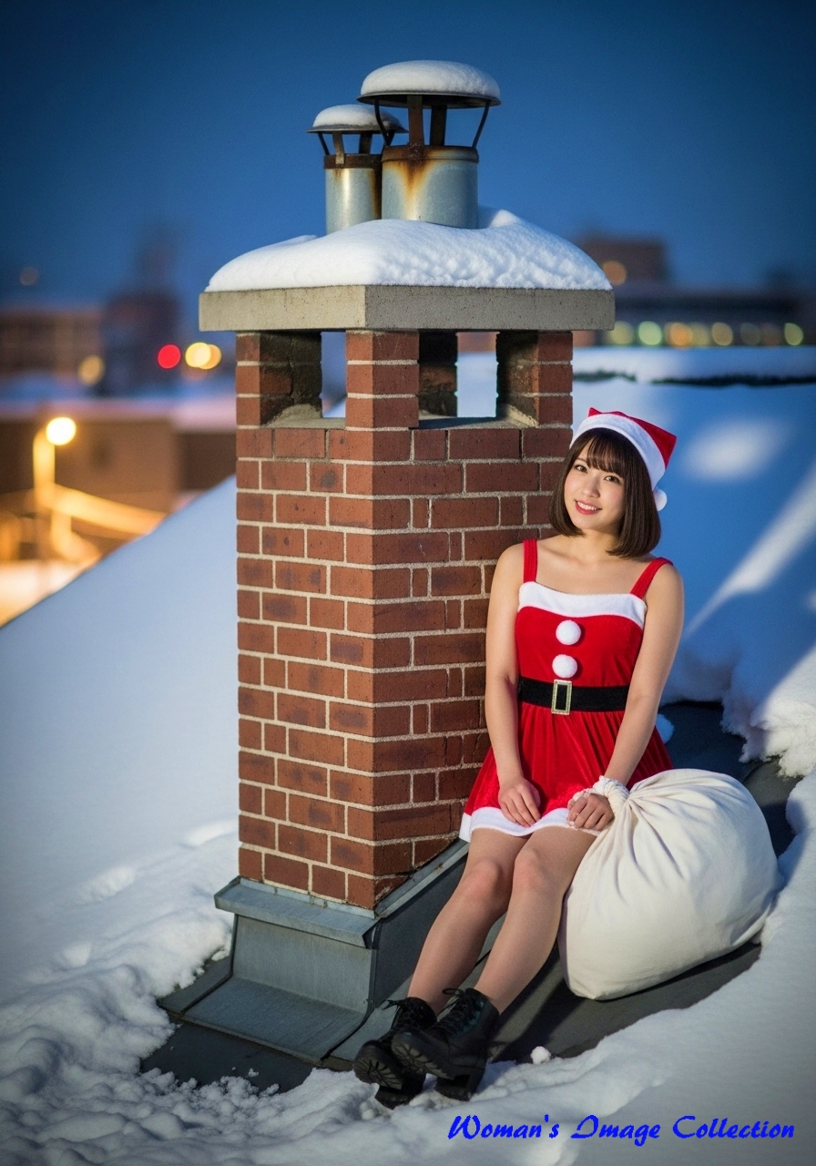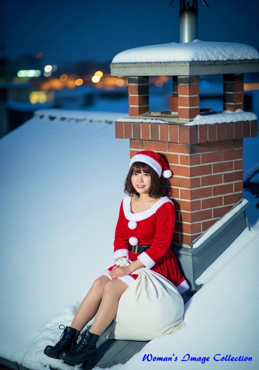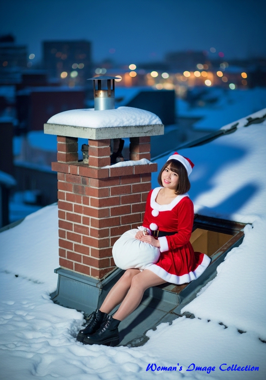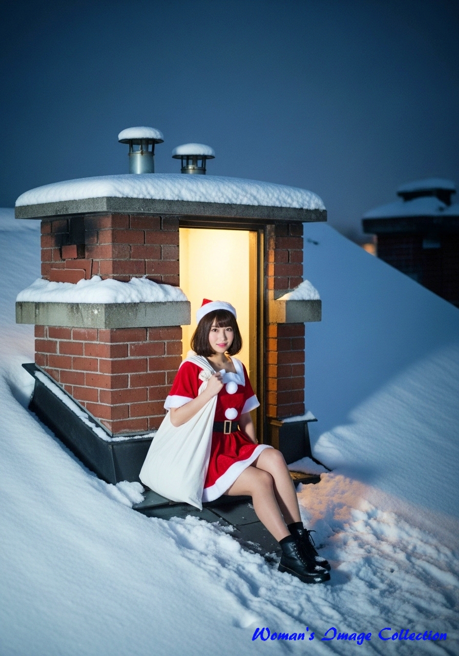 今回は12月も近いことから女性のサンタの画像です。衣装はサンタの衣装を手直ししたミニドレスという感じで、サンタといえば煙突なので雪の降る中、屋根と煙突に積もった雪を背景にしてみました。初めは、煙突の横に立たしたのですがイメージした絵ずらにならなかったので、煙突の横に座らせてみました。