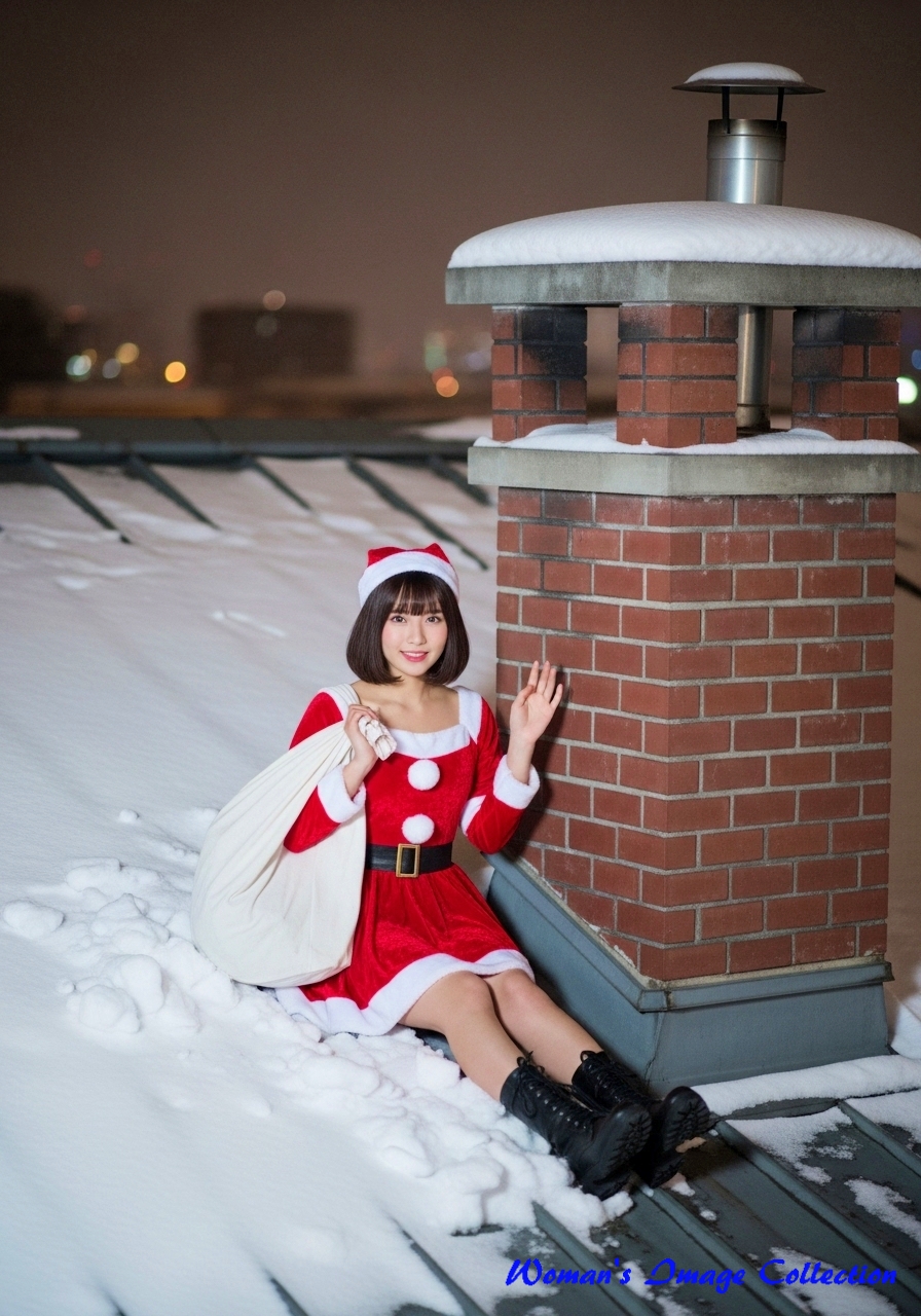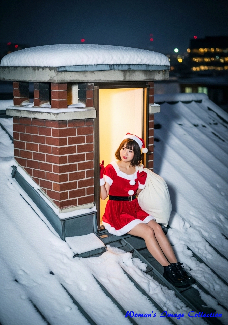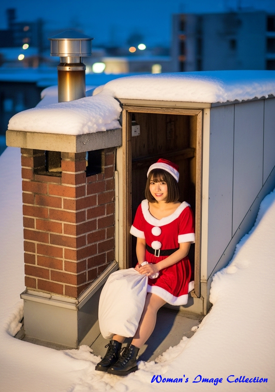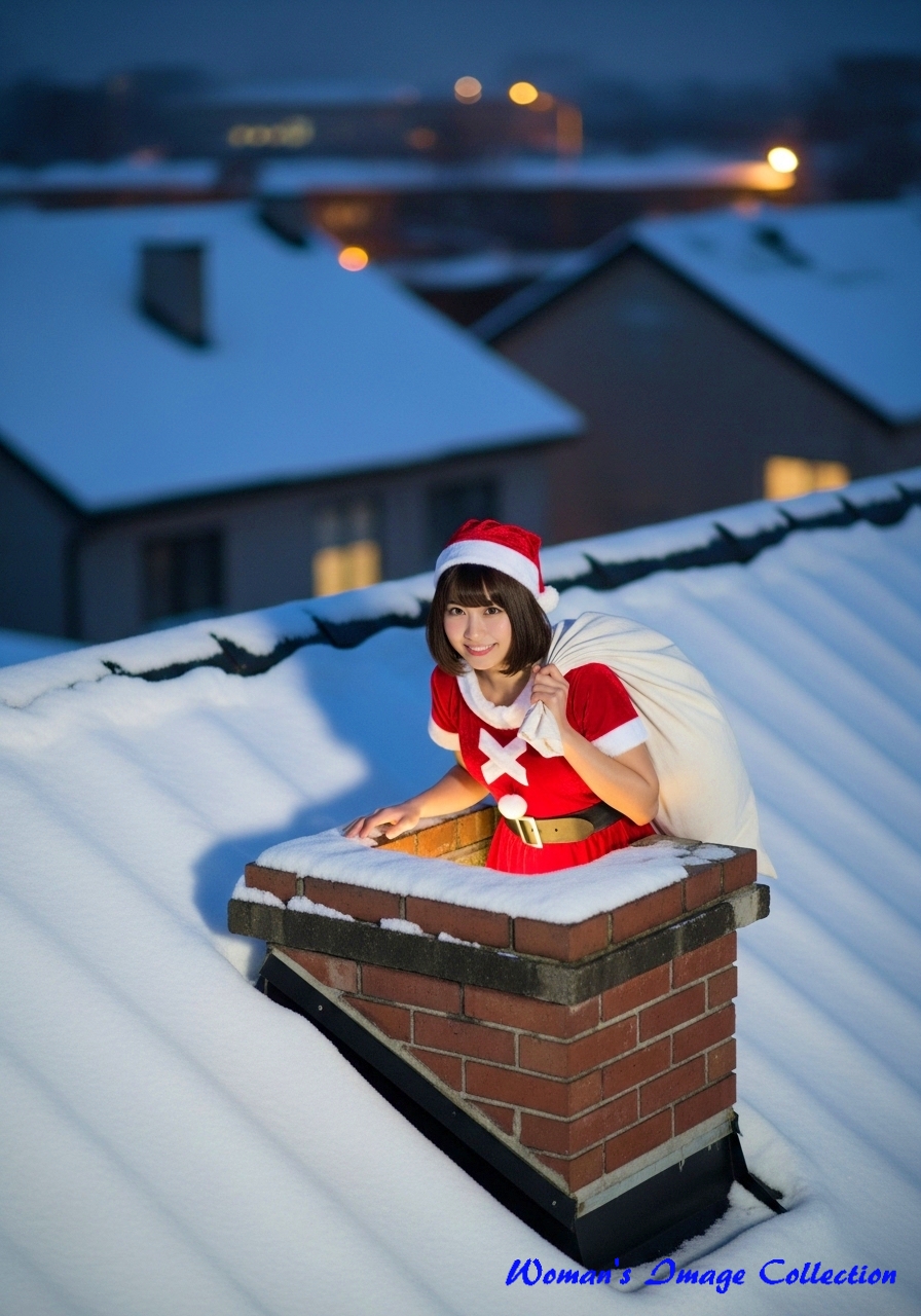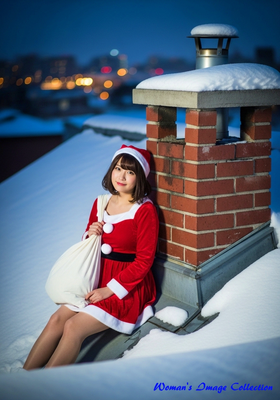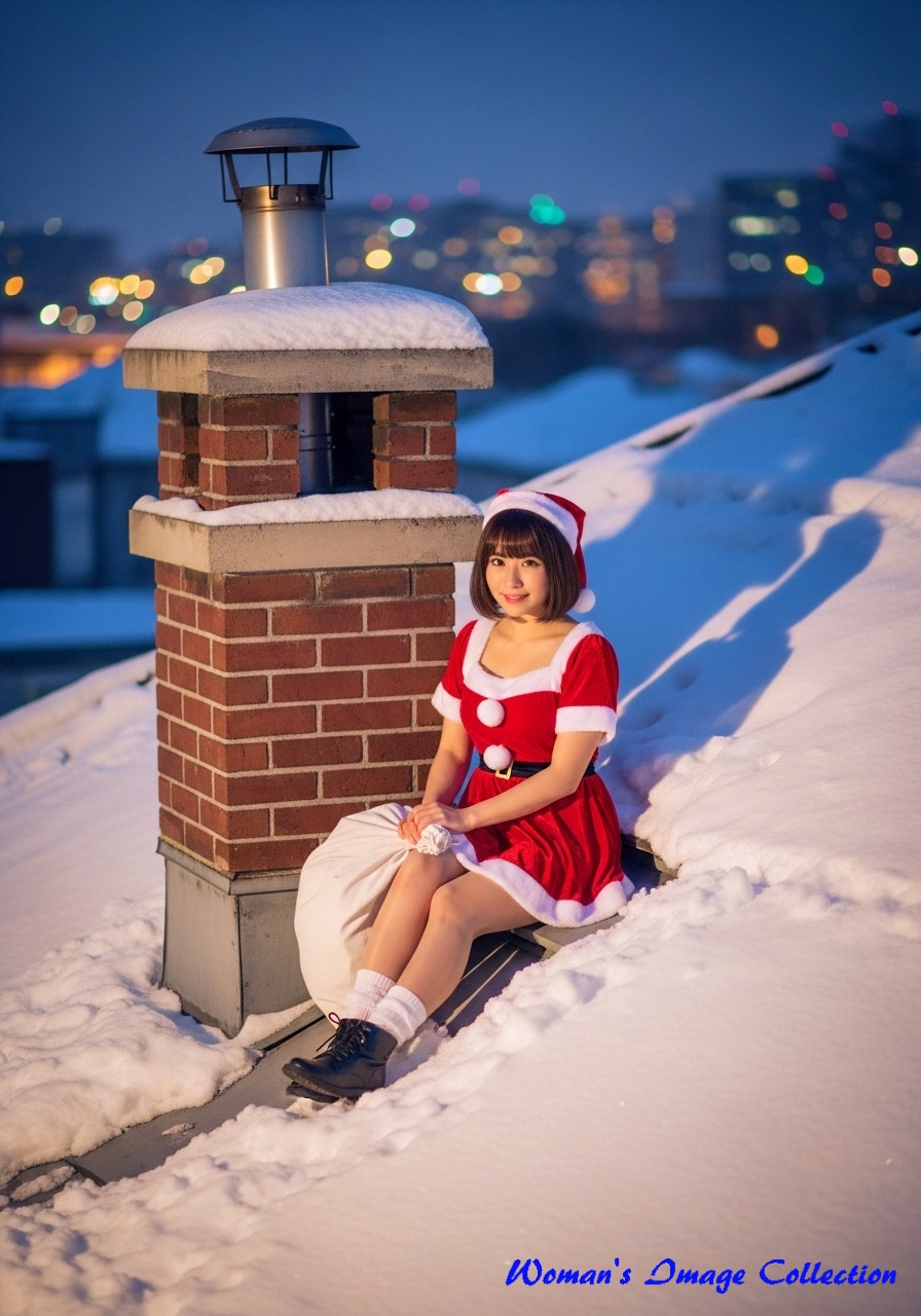 今回は12月も近いことから女性のサンタの画像です。衣装はサンタの衣装を手直ししたミニドレスという感じで、サンタといえば煙突なので雪の降る中、屋根と煙突に積もった雪を背景にしてみました。初めは、煙突の横に立たしたのですがイメージした絵ずらにならなかったので、煙突の横に座らせてみました。