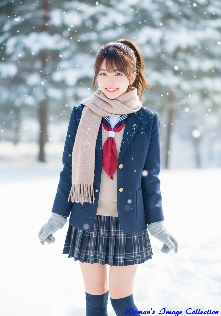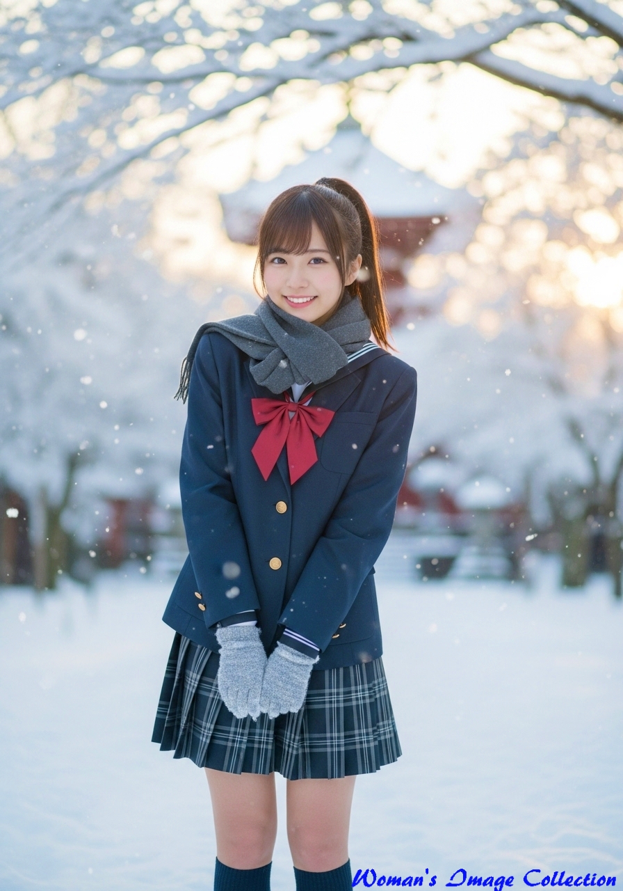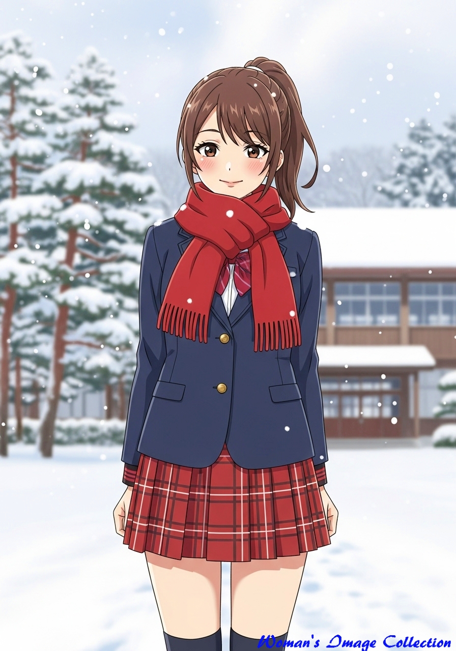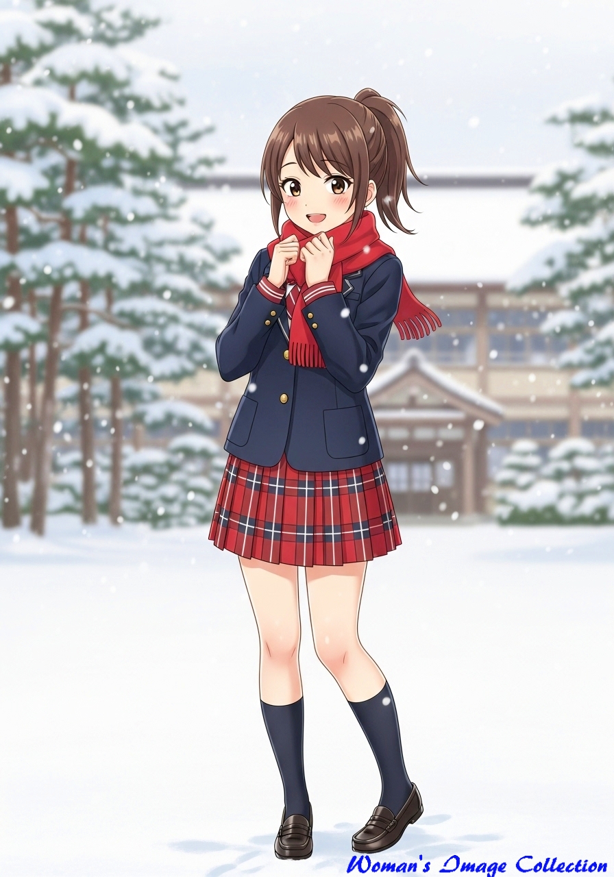 雪の積もった中に立つ日本人の女学生、健康的で明るい雰囲気、 茶色の髪、ポニーテール、アーモンド形の瞳、小さな鼻、