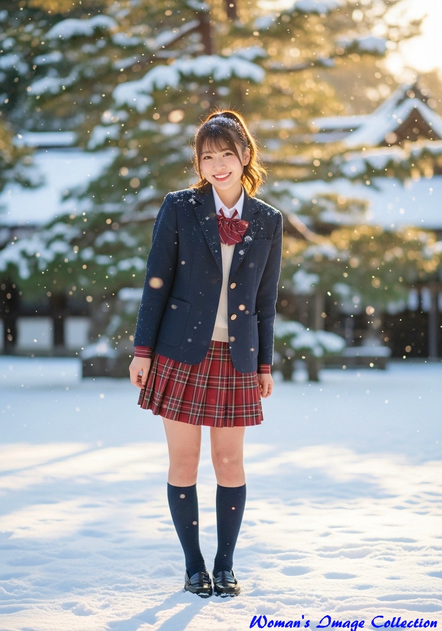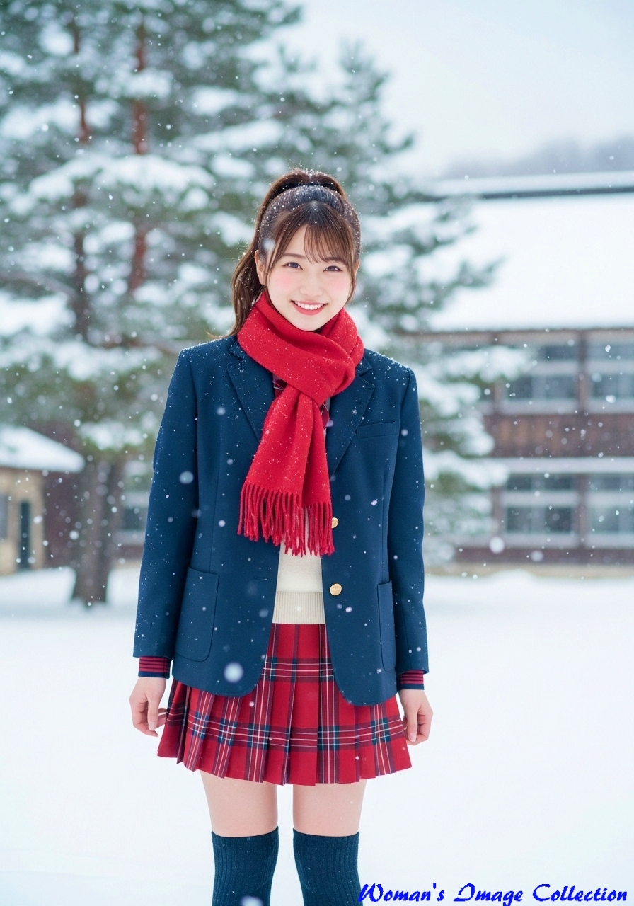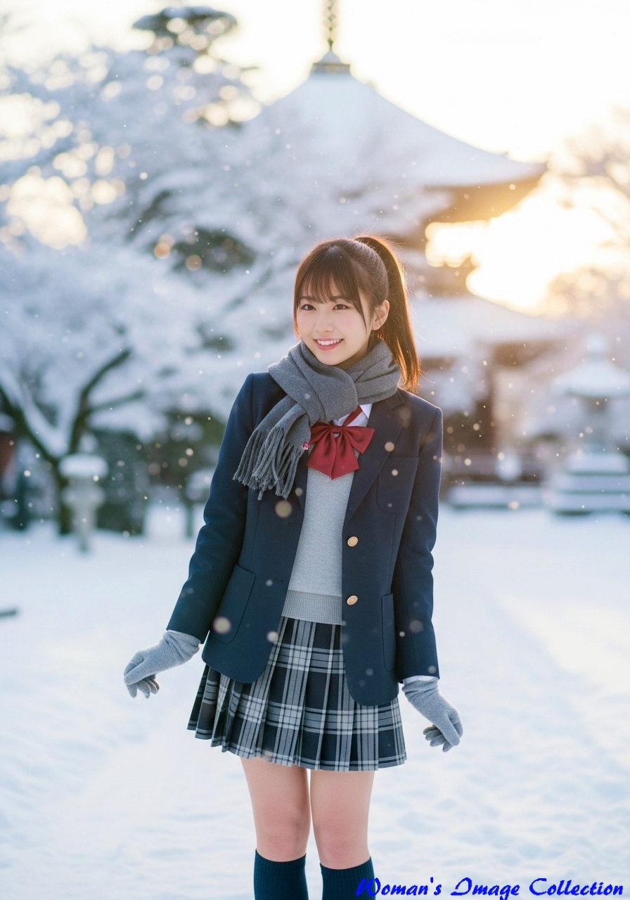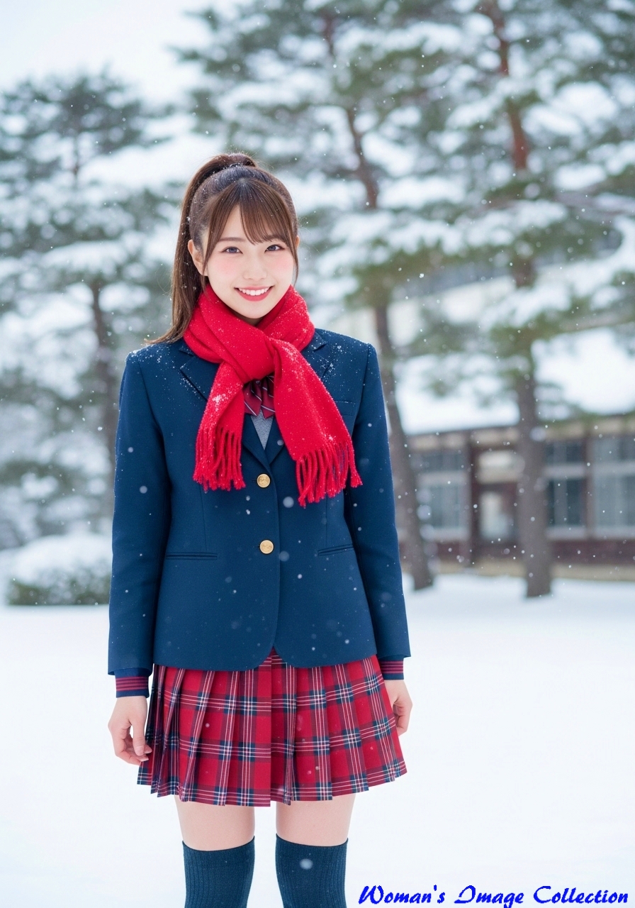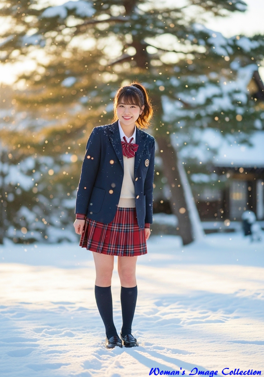 雪の積もった中に立つ日本人の女学生、健康的で明るい雰囲気、 茶色の髪、ポニーテール、アーモンド形の瞳、小さな鼻、
