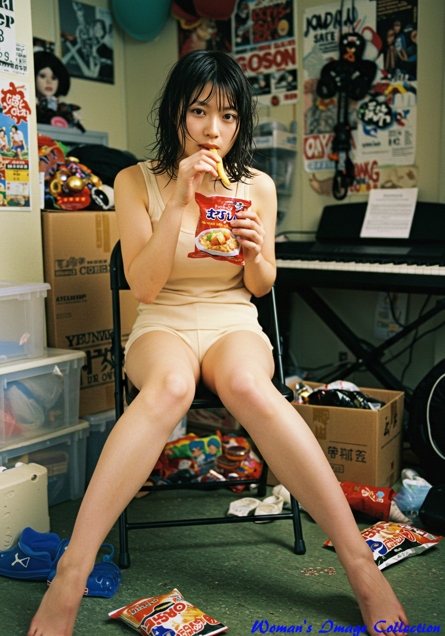 風呂上がりに、雑然とした部屋で、袋に入ったスナック菓子を食べながらリラックスする女性の画像生成用のプロンプトです。タンクトップにショーツといういでたちです。