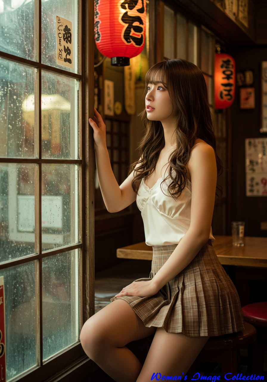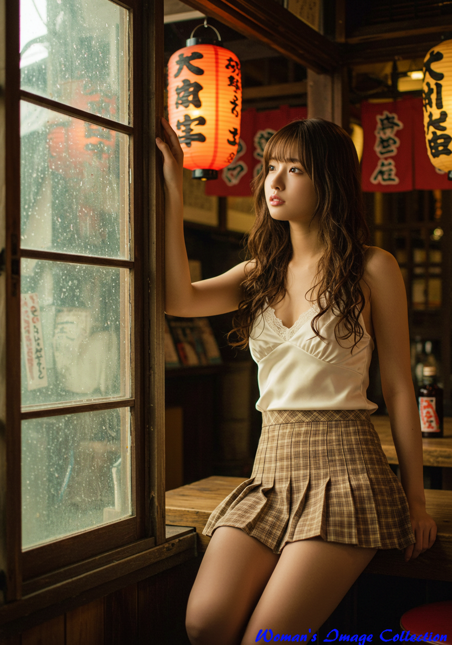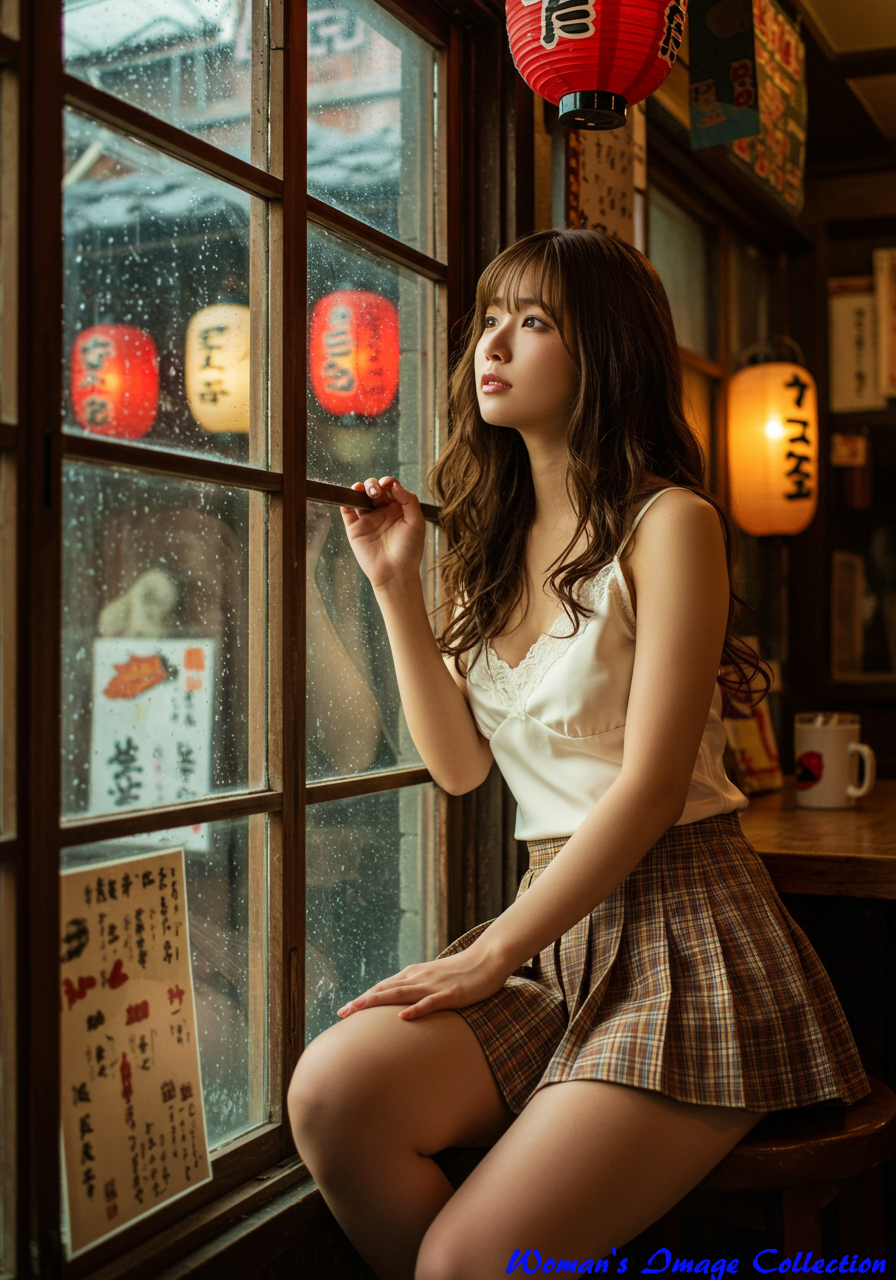 日本らしいノスタルジックな飲み屋街の居酒屋の窓際で佇み、外を眺める女性のプロンプト。