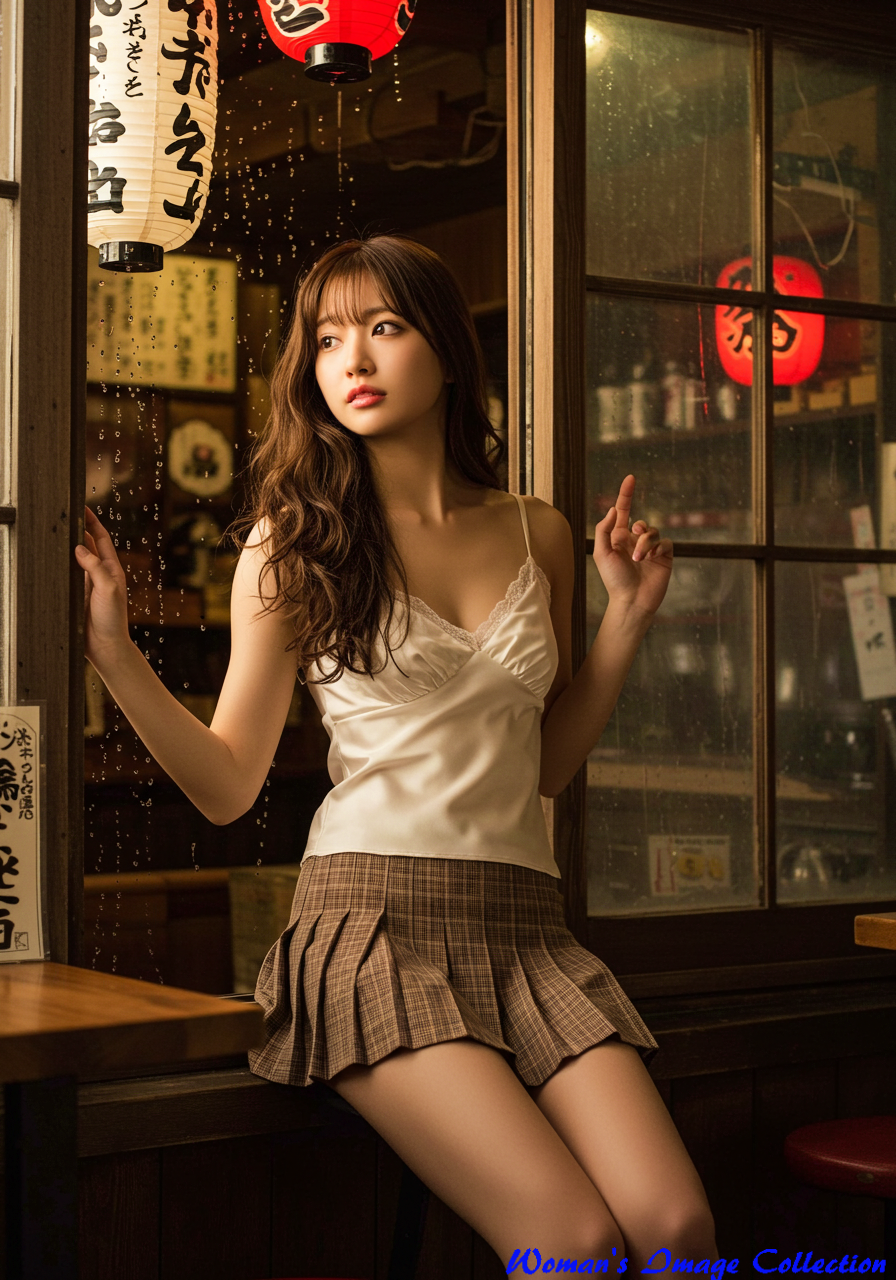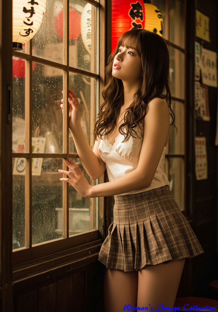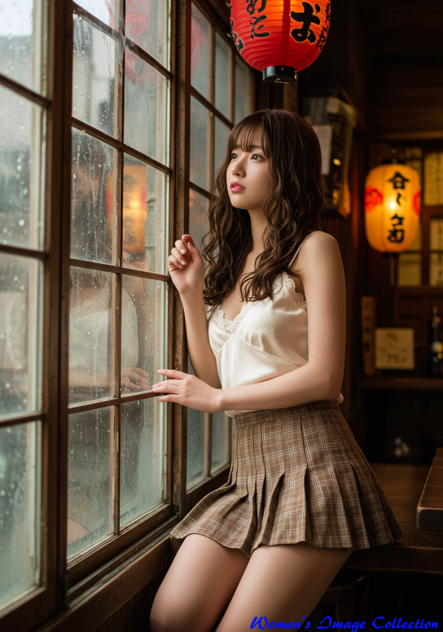 日本らしいノスタルジックな飲み屋街の居酒屋の窓際で佇み、外を眺める女性のプロンプト。