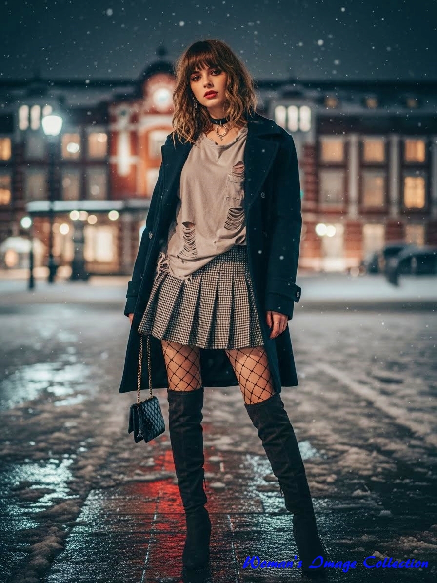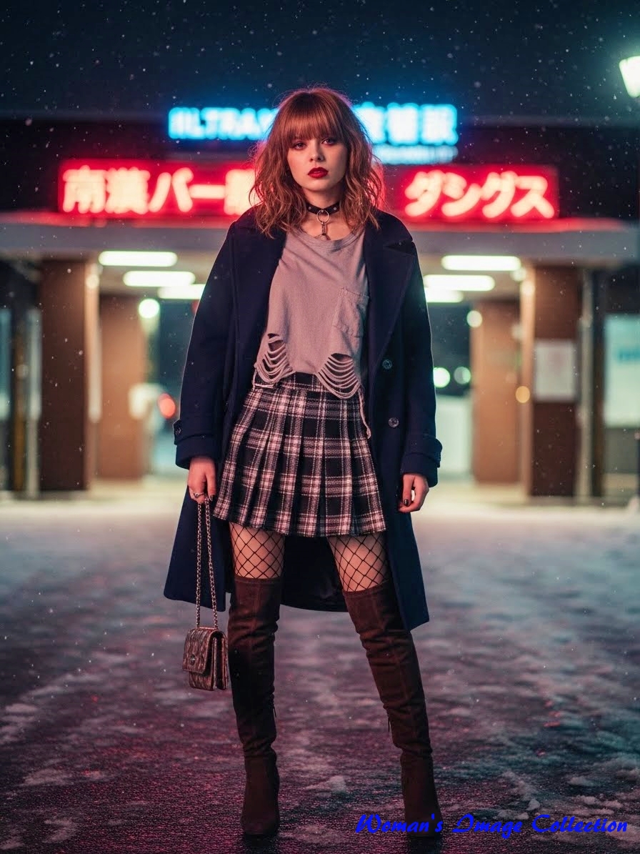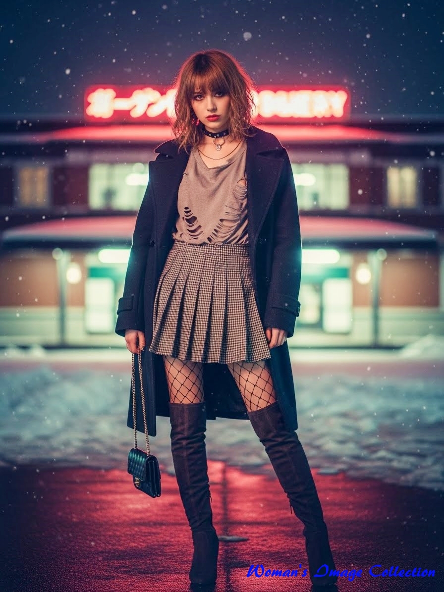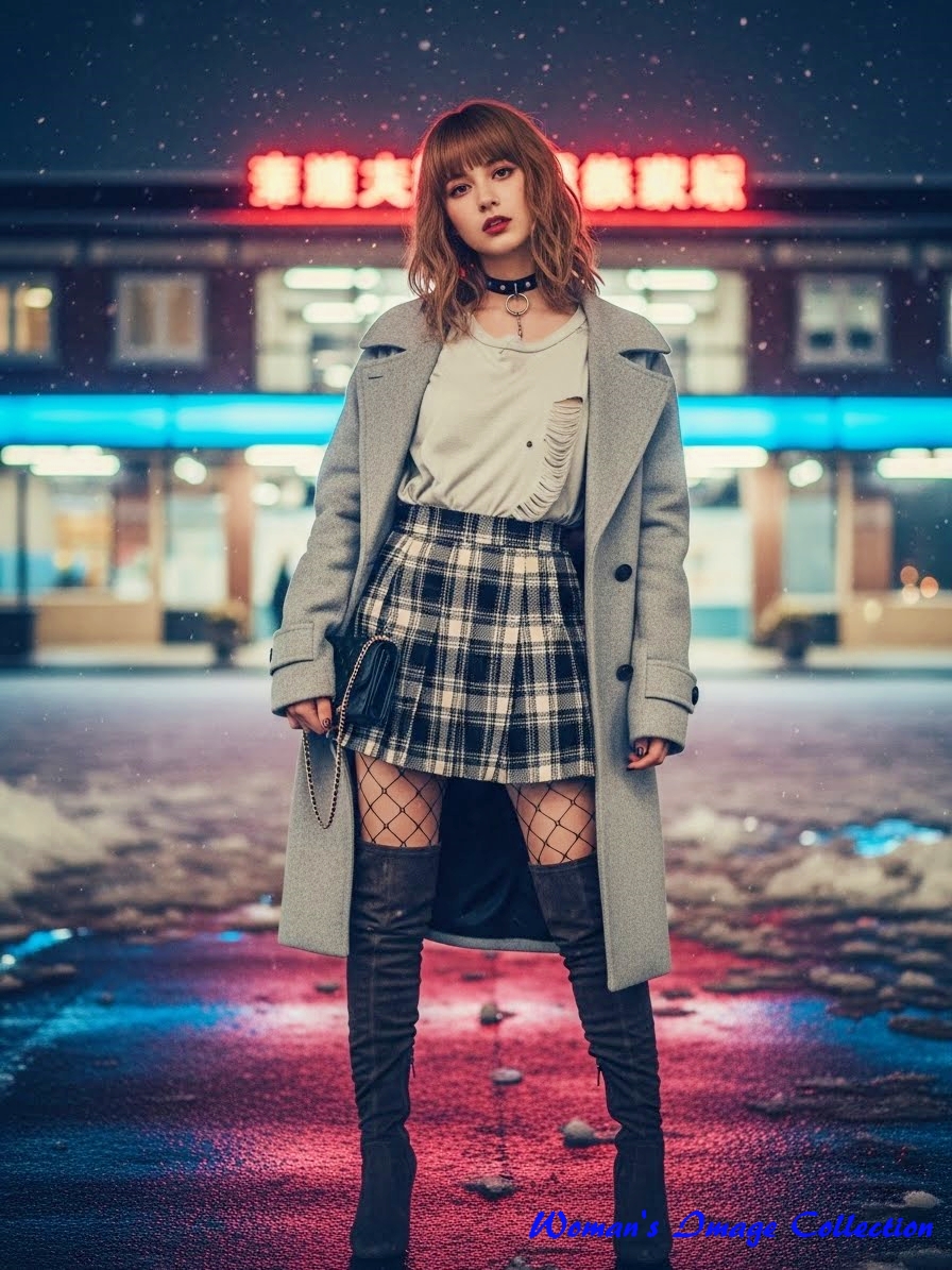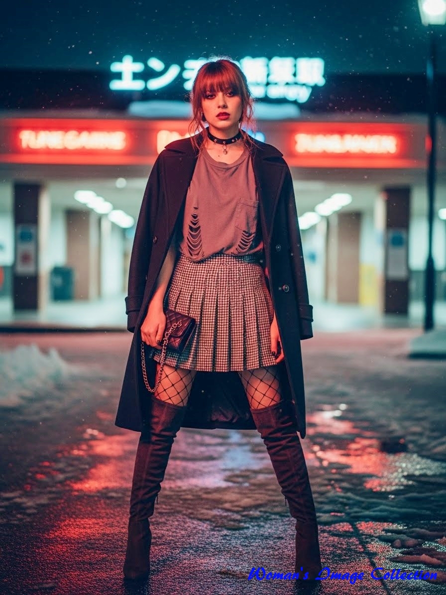 被写体 (10代後半の日本人女性、ダメージ加工のコットンTシャツとチェック柄のウールプリーツスカートを着用し、メルトンPコートとスエードのロングブーツを合わせ、チェーンウォレットと網タイツ、チョーカーを身に着けた若い女性, ほとんど目立たない自然なベースメイクと前髪ありのゆる巻きロングヘア),