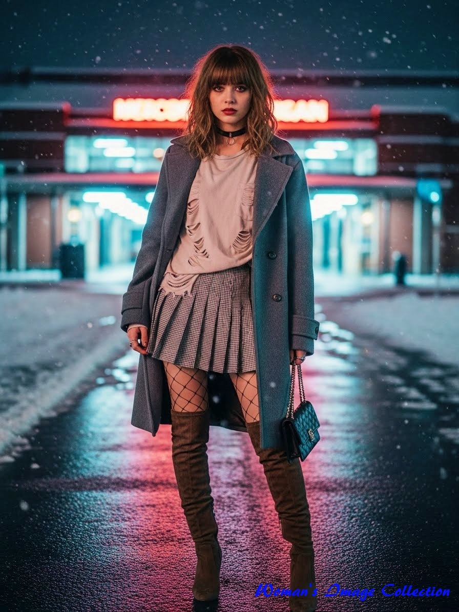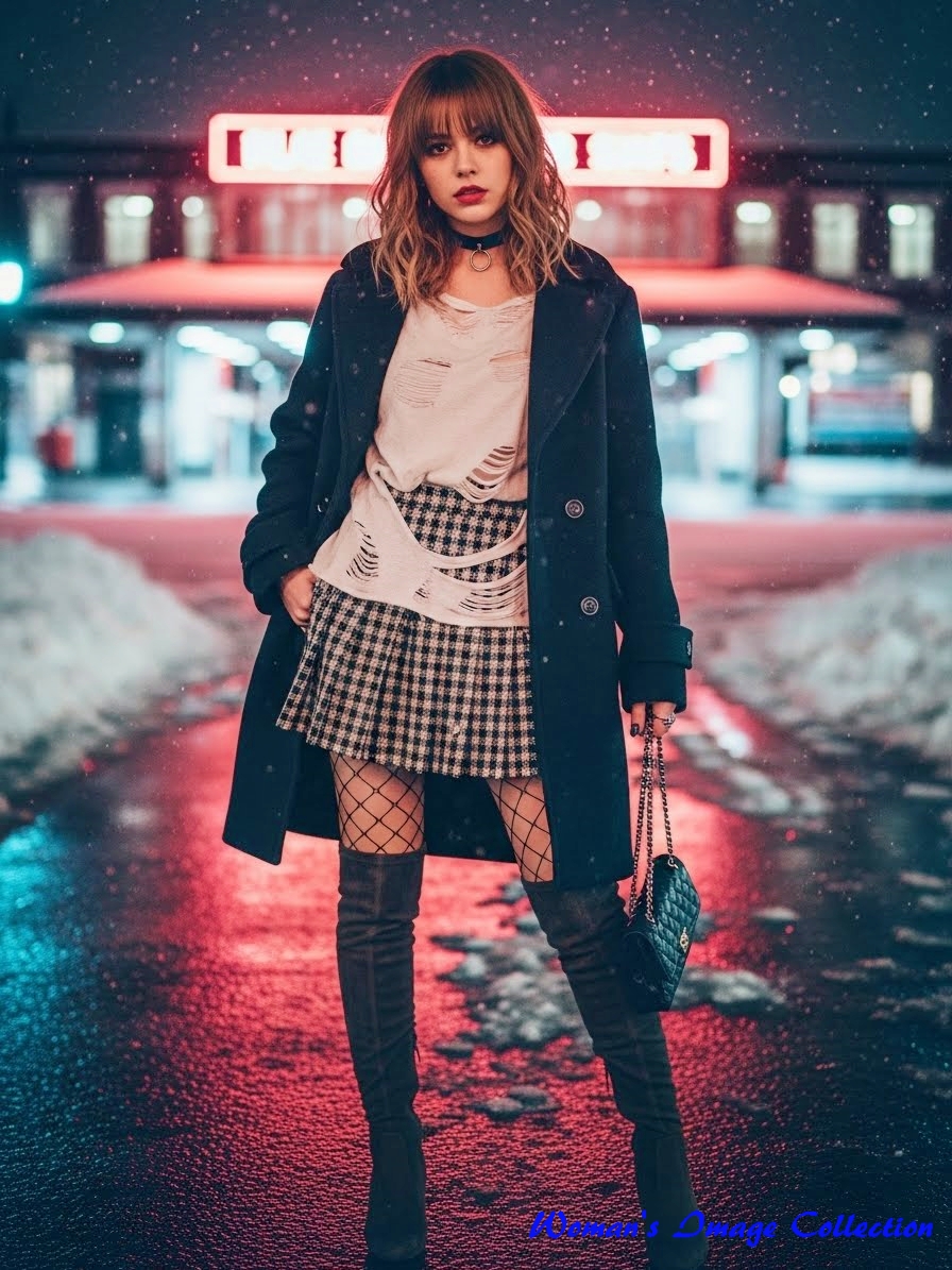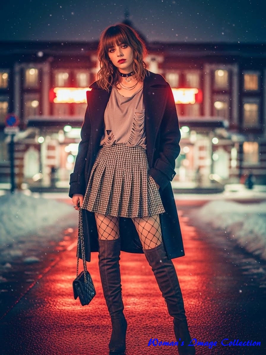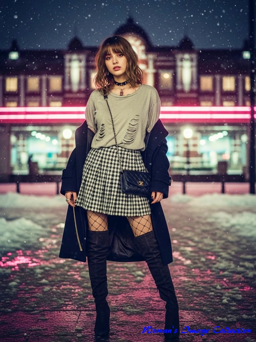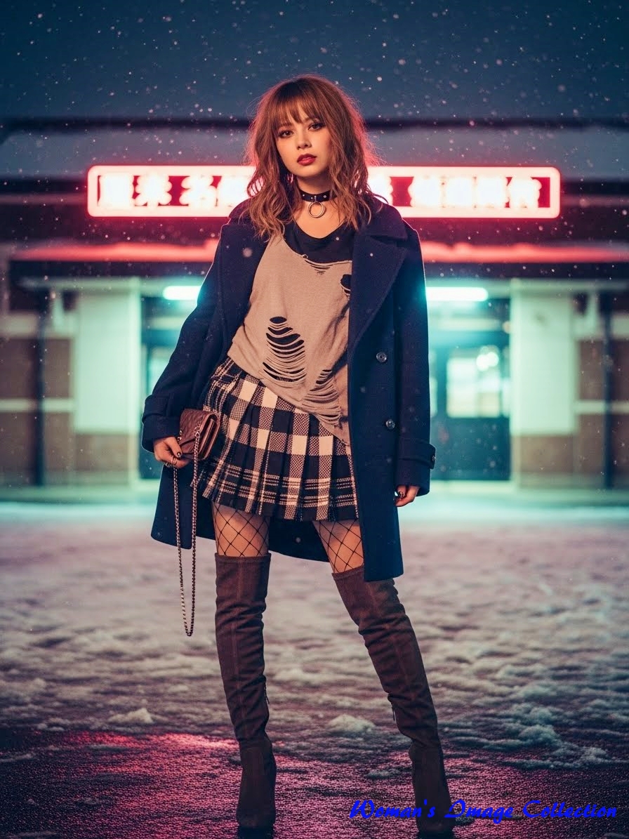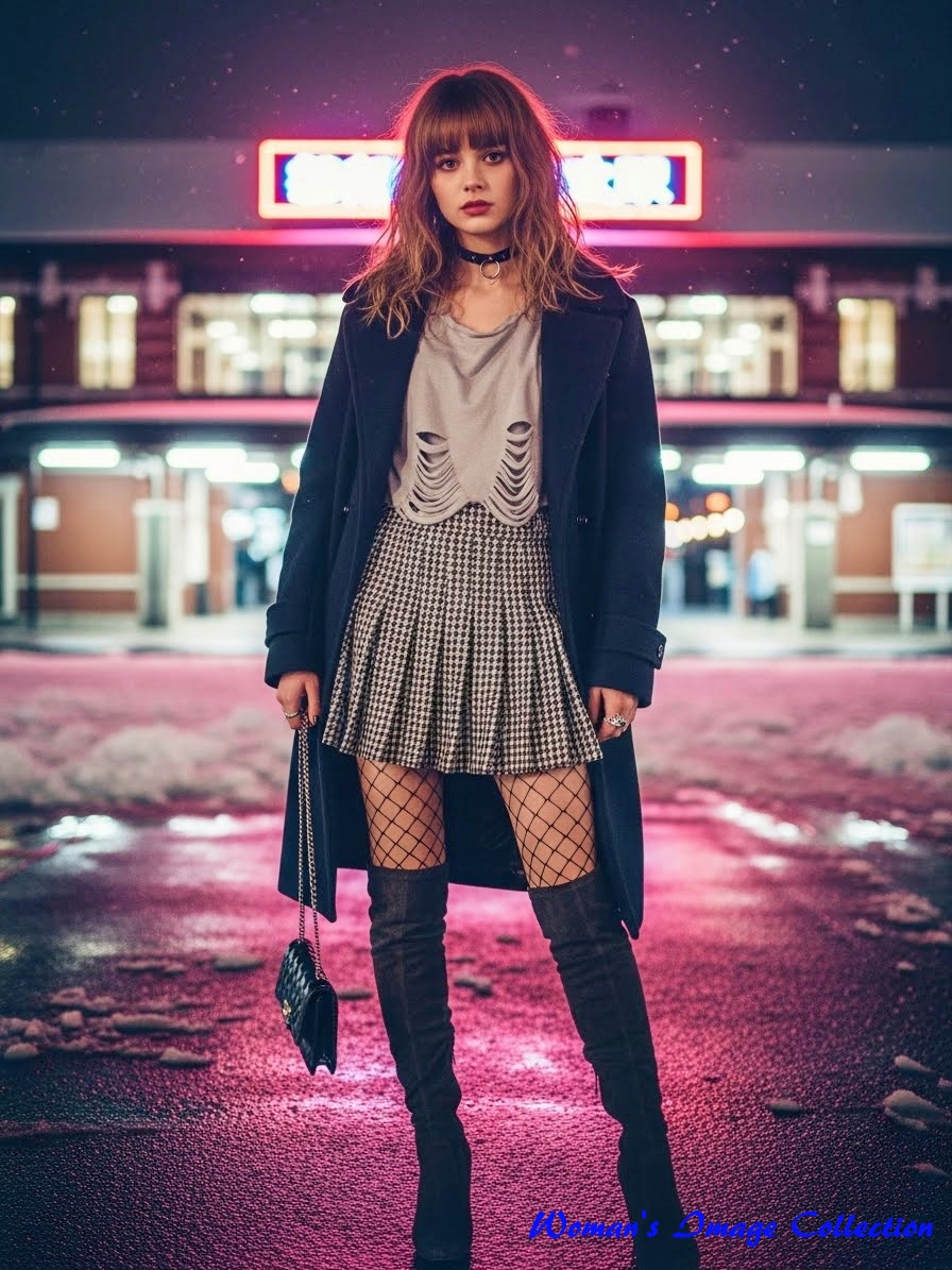 被写体 (10代後半の日本人女性、ダメージ加工のコットンTシャツとチェック柄のウールプリーツスカートを着用し、メルトンPコートとスエードのロングブーツを合わせ、チェーンウォレットと網タイツ、チョーカーを身に着けた若い女性, ほとんど目立たない自然なベースメイクと前髪ありのゆる巻きロングヘア),