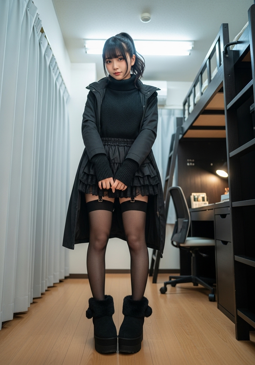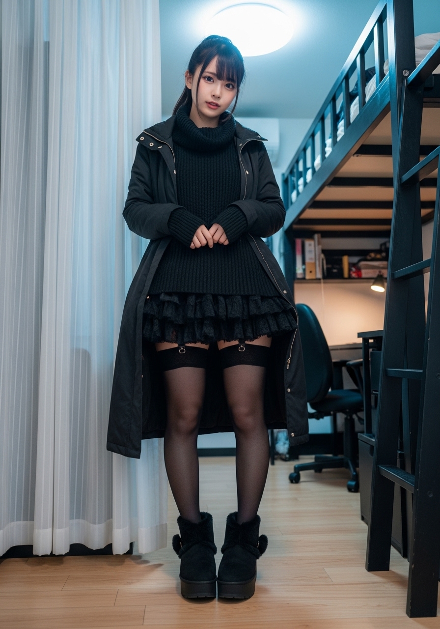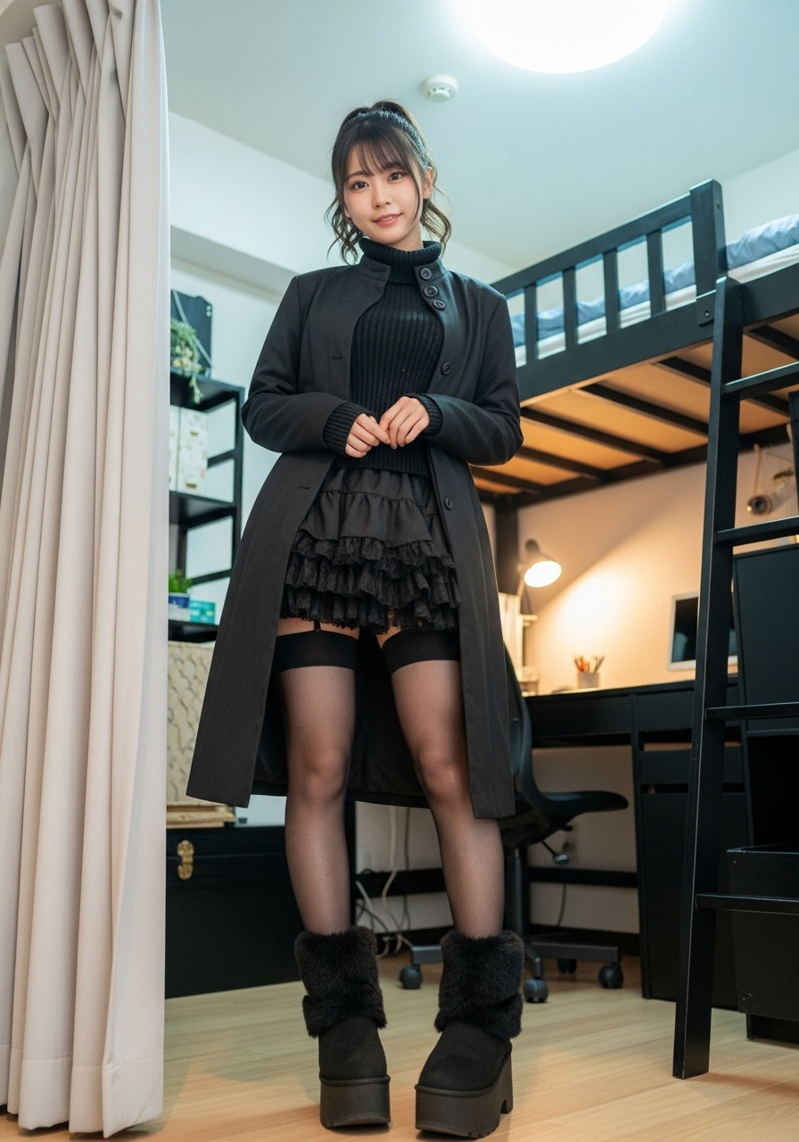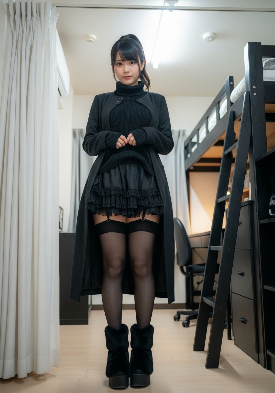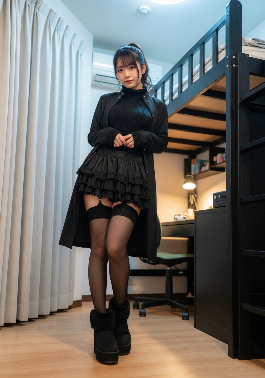 今回は全身を黒でまとめてみました。黒のタートルネックにロングジャケット、ペチコート、パンストにロングブーツの女性。ペチコートはスカートは履かずにペチコートだけにしてみました。背景もロフト形式のベッド。その下に勉強机と椅子を置いたプロンプトです。あとは依然使った同じような画像のプロンプトをベースにしています。