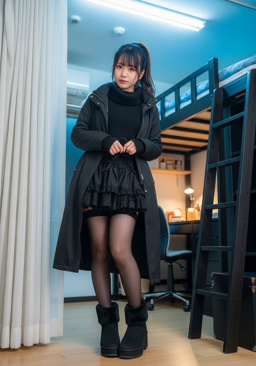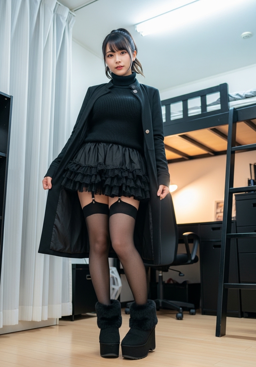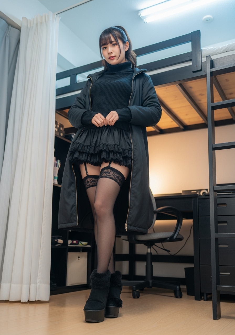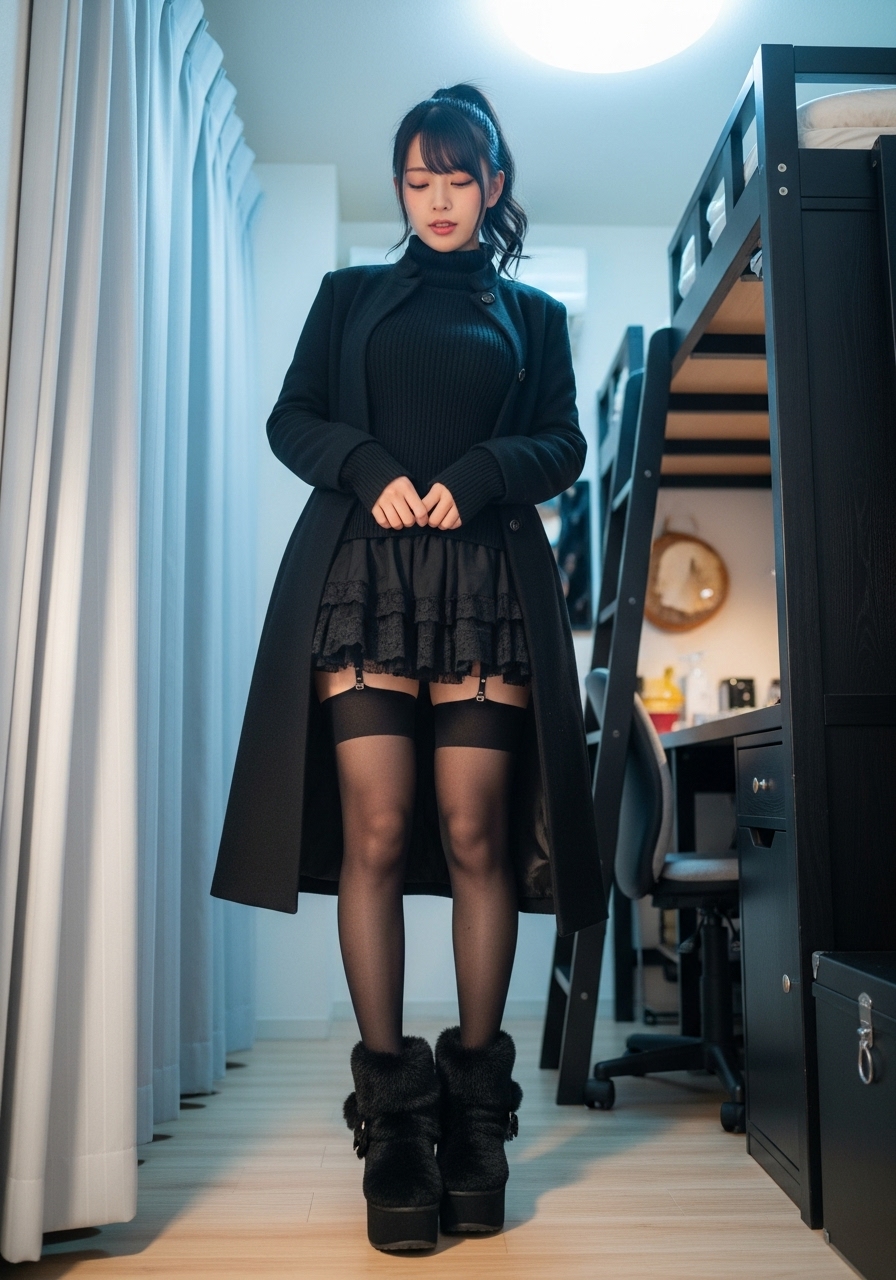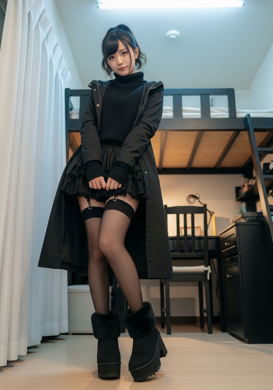 今回は全身を黒でまとめてみました。黒のタートルネックにロングジャケット、ペチコート、パンストにロングブーツの女性。ペチコートはスカートは履かずにペチコートだけにしてみました。背景もロフト形式のベッド。その下に勉強机と椅子を置いたプロンプトです。あとは依然使った同じような画像のプロンプトをベースにしています。