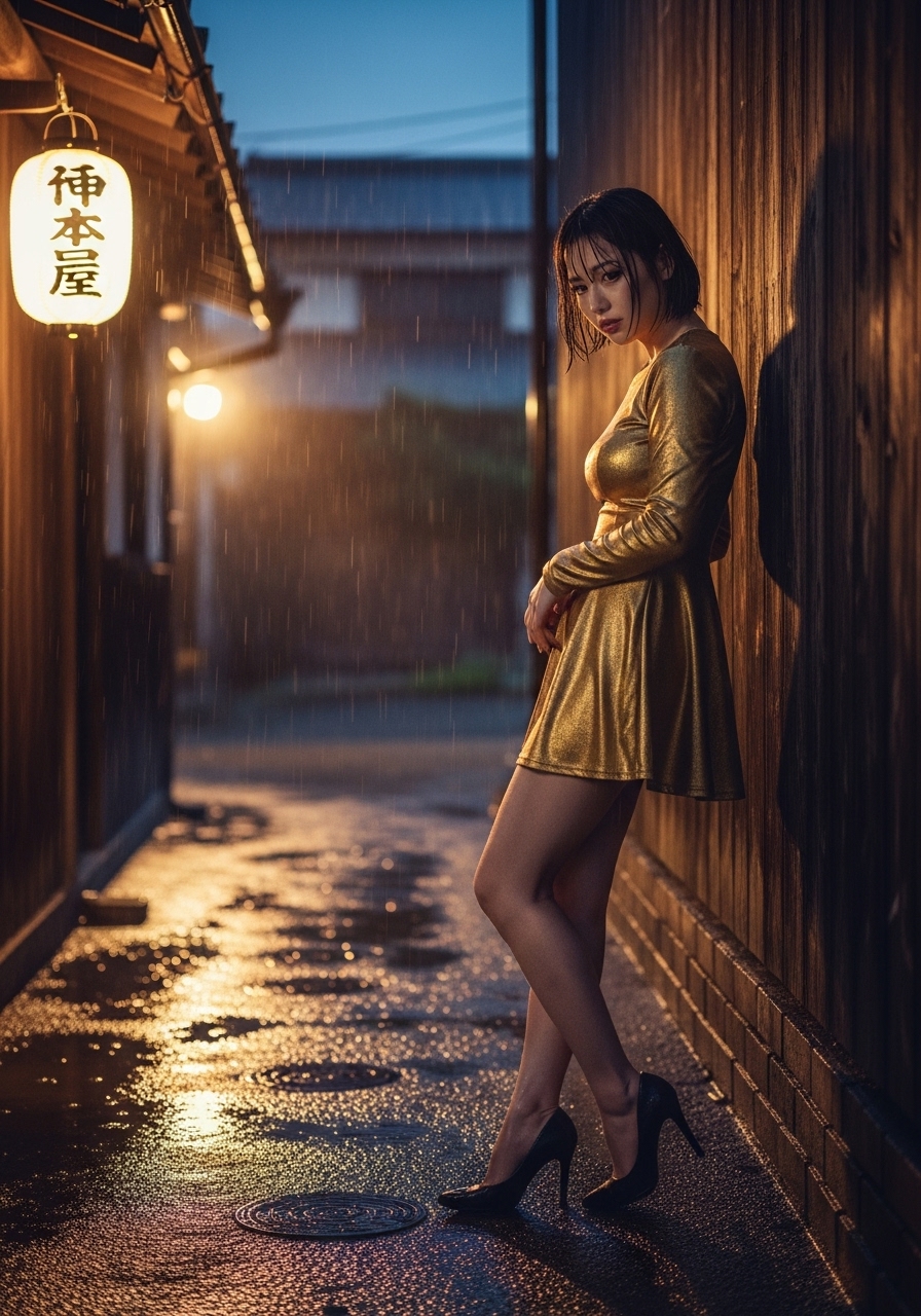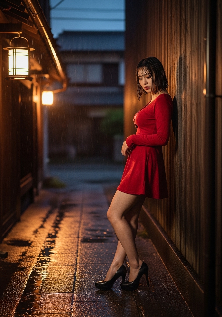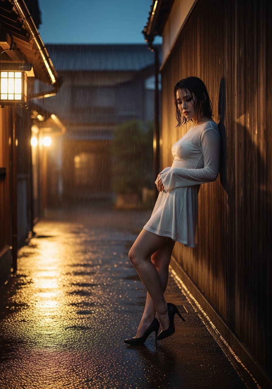 Lighting & Atmosphere: Lighting Type: 提灯からの暖かく弱い光と、雨に濡れた地面や板壁に反射する光。雨粒が光を筋状に反射し、ドラマチックな効果を生む。光と影のコントラストが極めて強い、映画のような照明