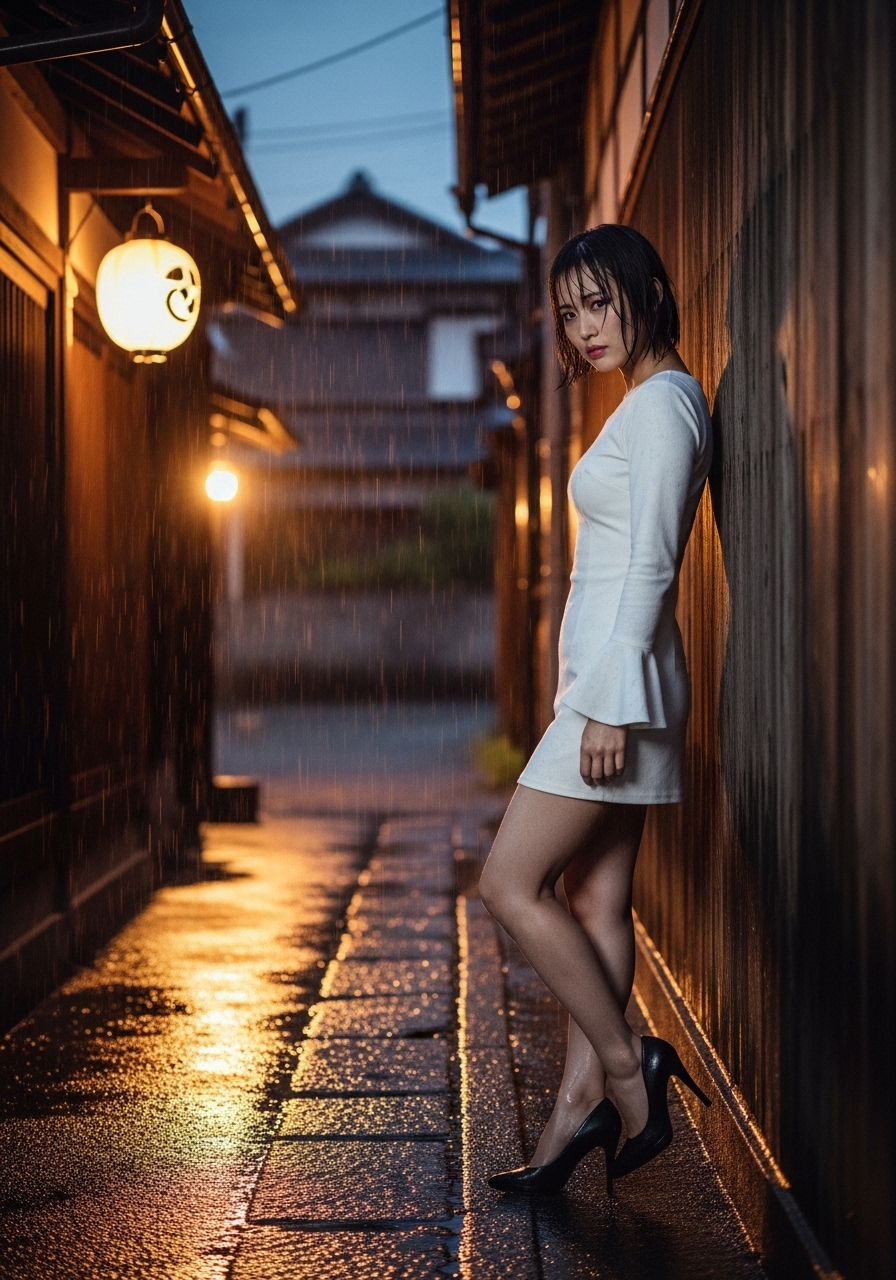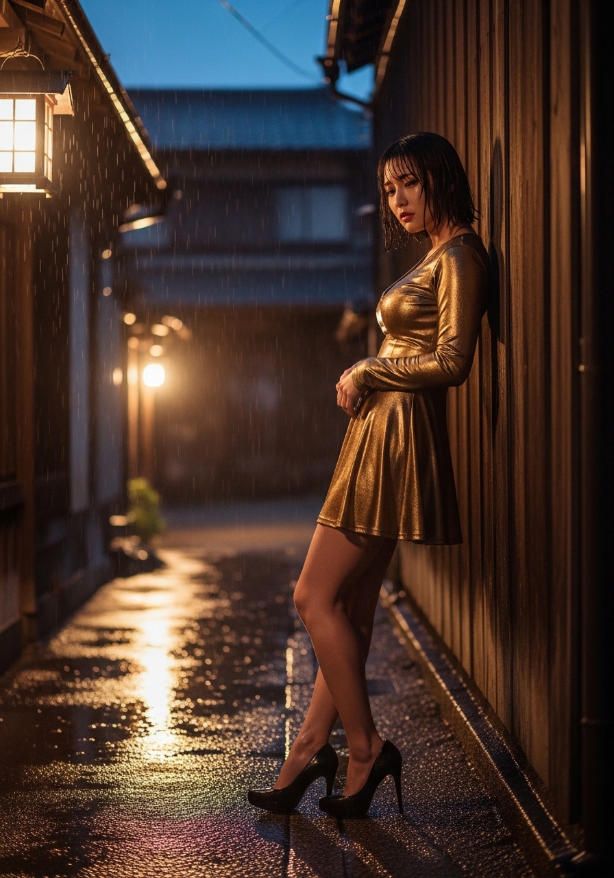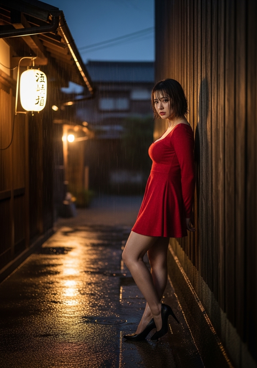 Lighting & Atmosphere: Lighting Type: 提灯からの暖かく弱い光と、雨に濡れた地面や板壁に反射する光。雨粒が光を筋状に反射し、ドラマチックな効果を生む。光と影のコントラストが極めて強い、映画のような照明