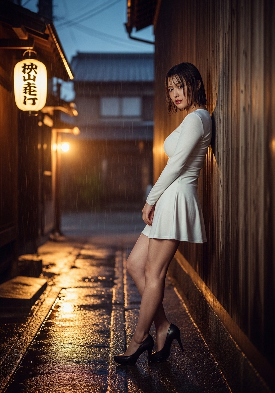 Composition & Angle: Shot Type: 全身ショット Angle: ローアングル。女性の脚の長さと全体のスタイルを最大限に強調する。カメラは地面に近い位置から見上げるように配置され、路地の奥行きとドラマチックな雰囲気を出す
