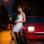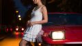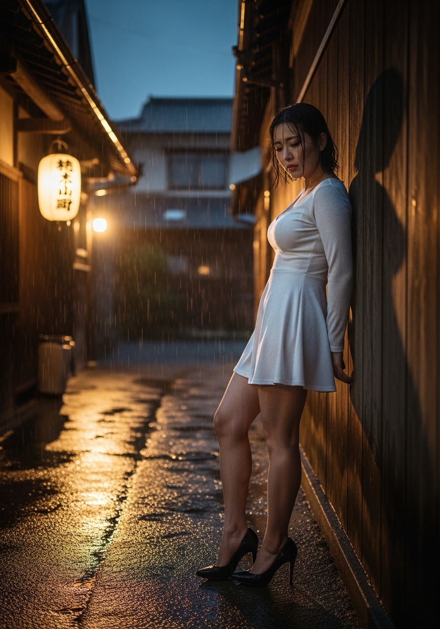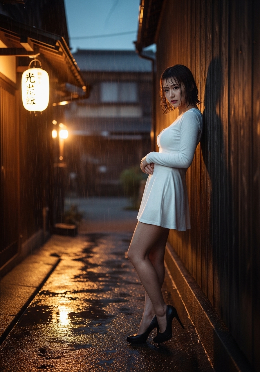 雨の中、板塀にもたれて立つミニドレスの女性のブロンプト。ミニドレスの色を白や赤、シアーにかえて作成してみました。