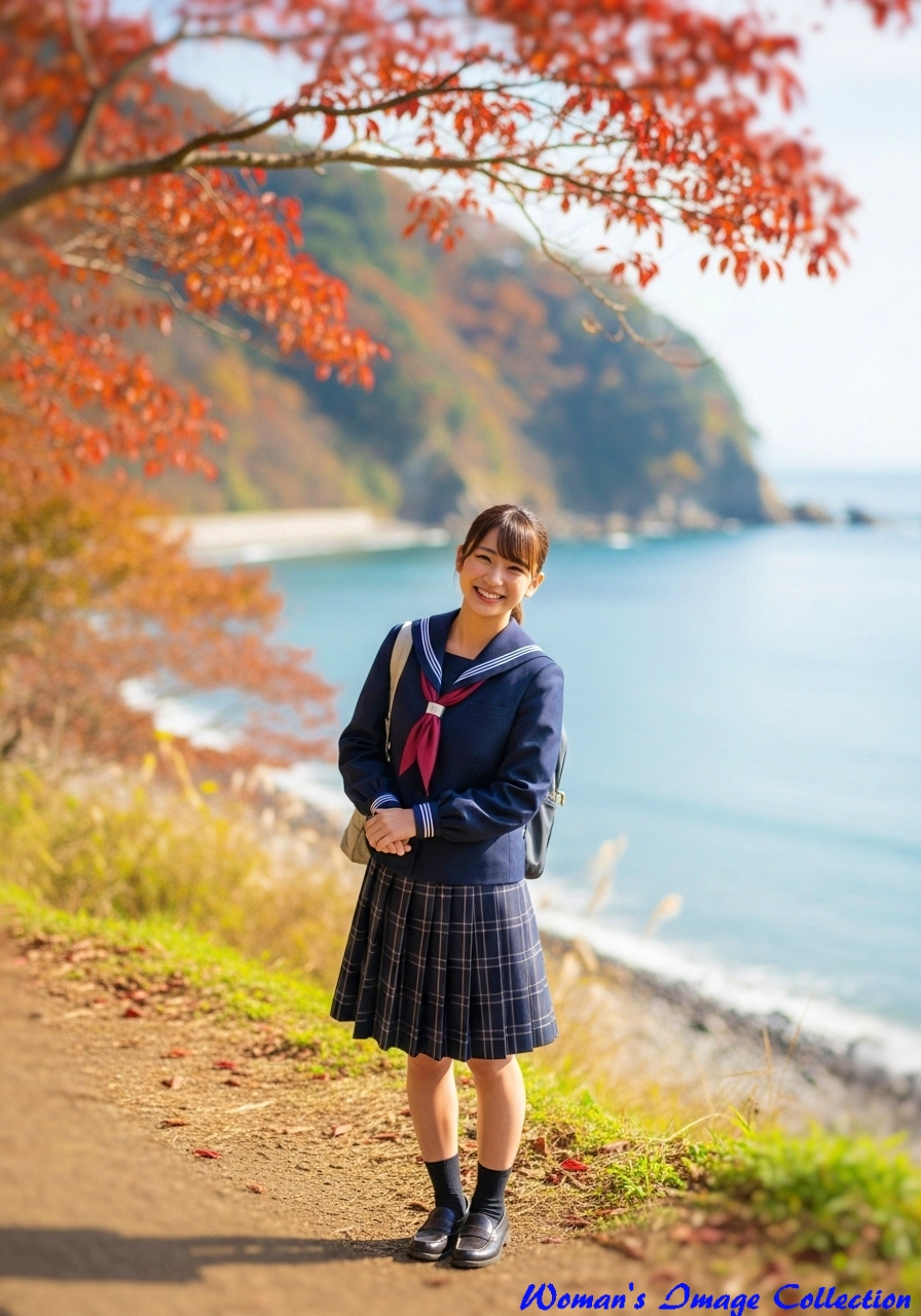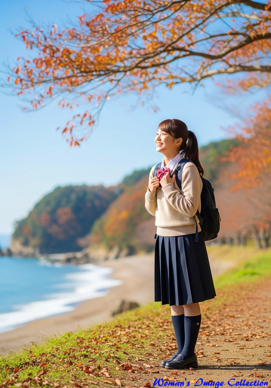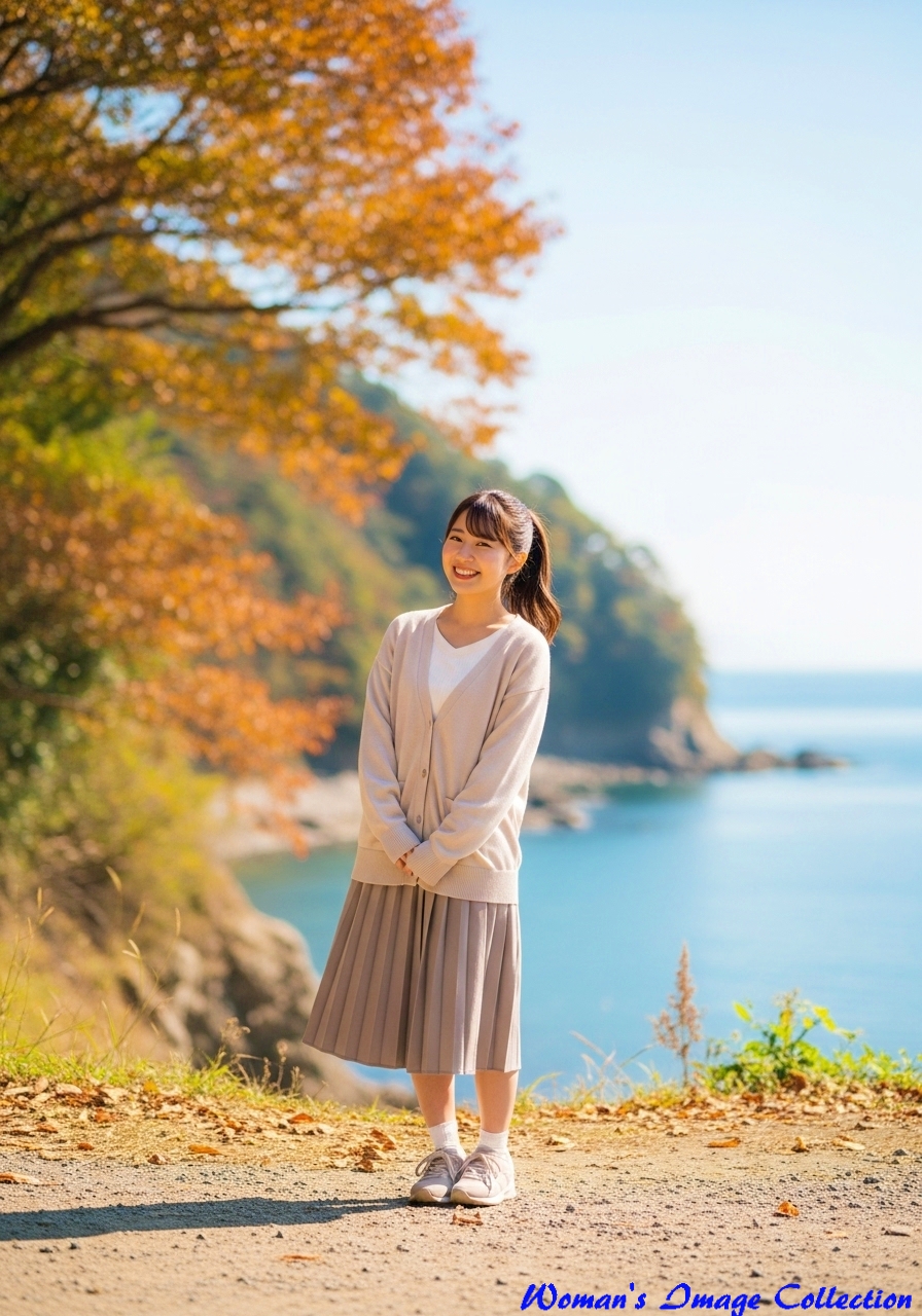 女学生を中心にチルトシフト効果を使って立体的に表現。健康的で明るい雰囲気、 茶色の髪、ポニーテール、アーモンド形の瞳、小さな鼻の日本人女学生。秋を感じる風景が美しい海岸線を訪問して楽しそうに笑っている。靴までの全身写真