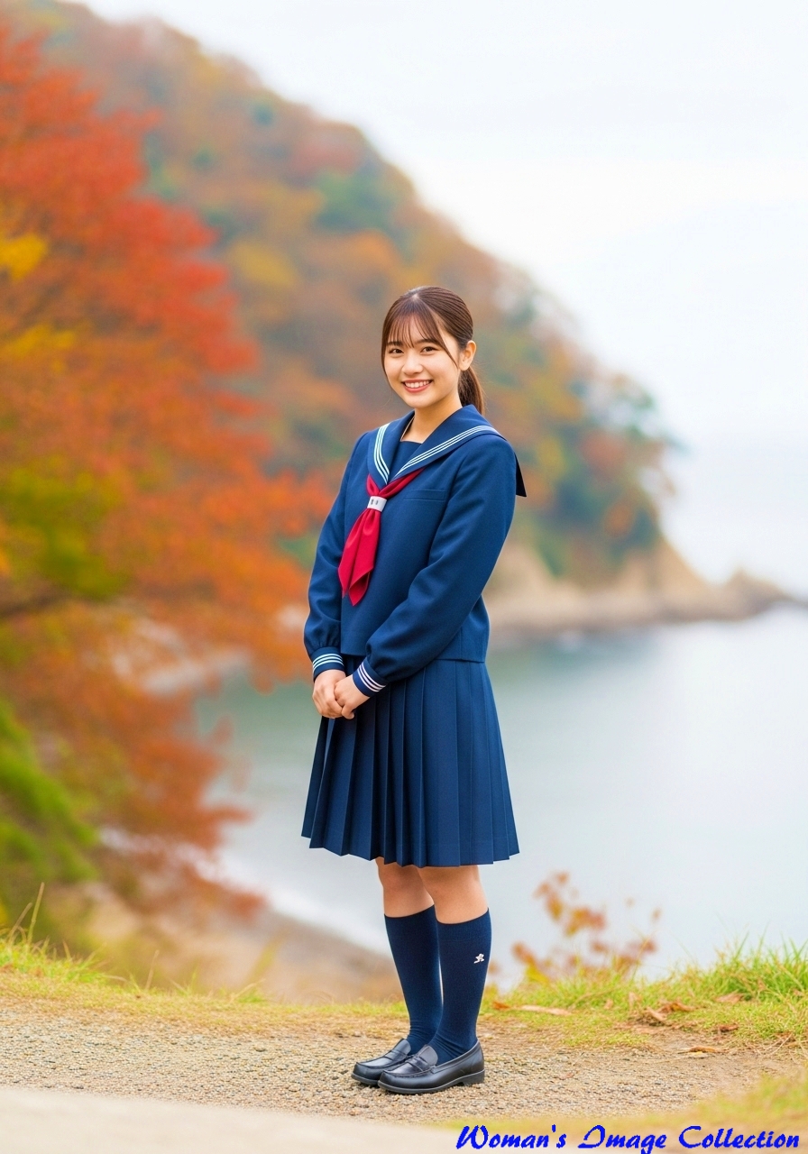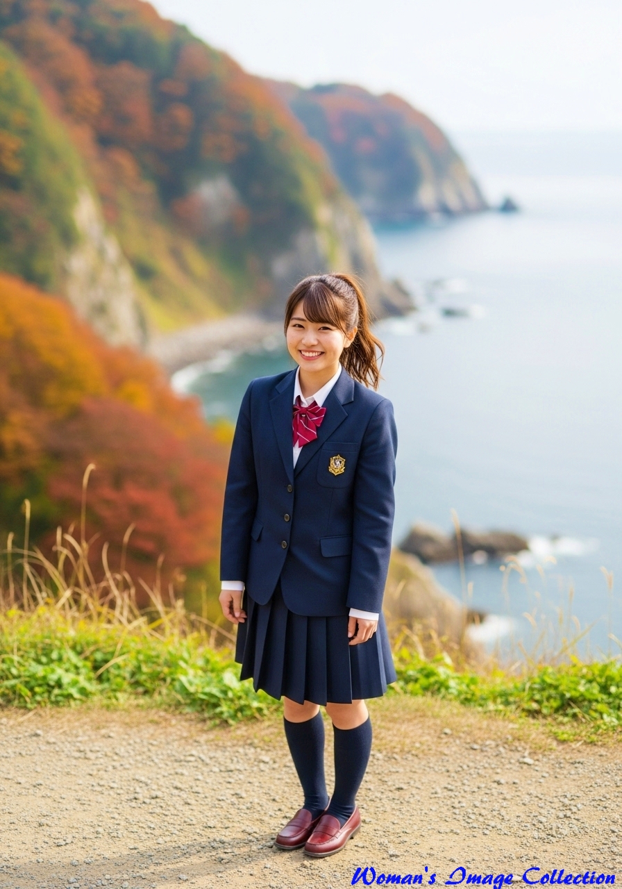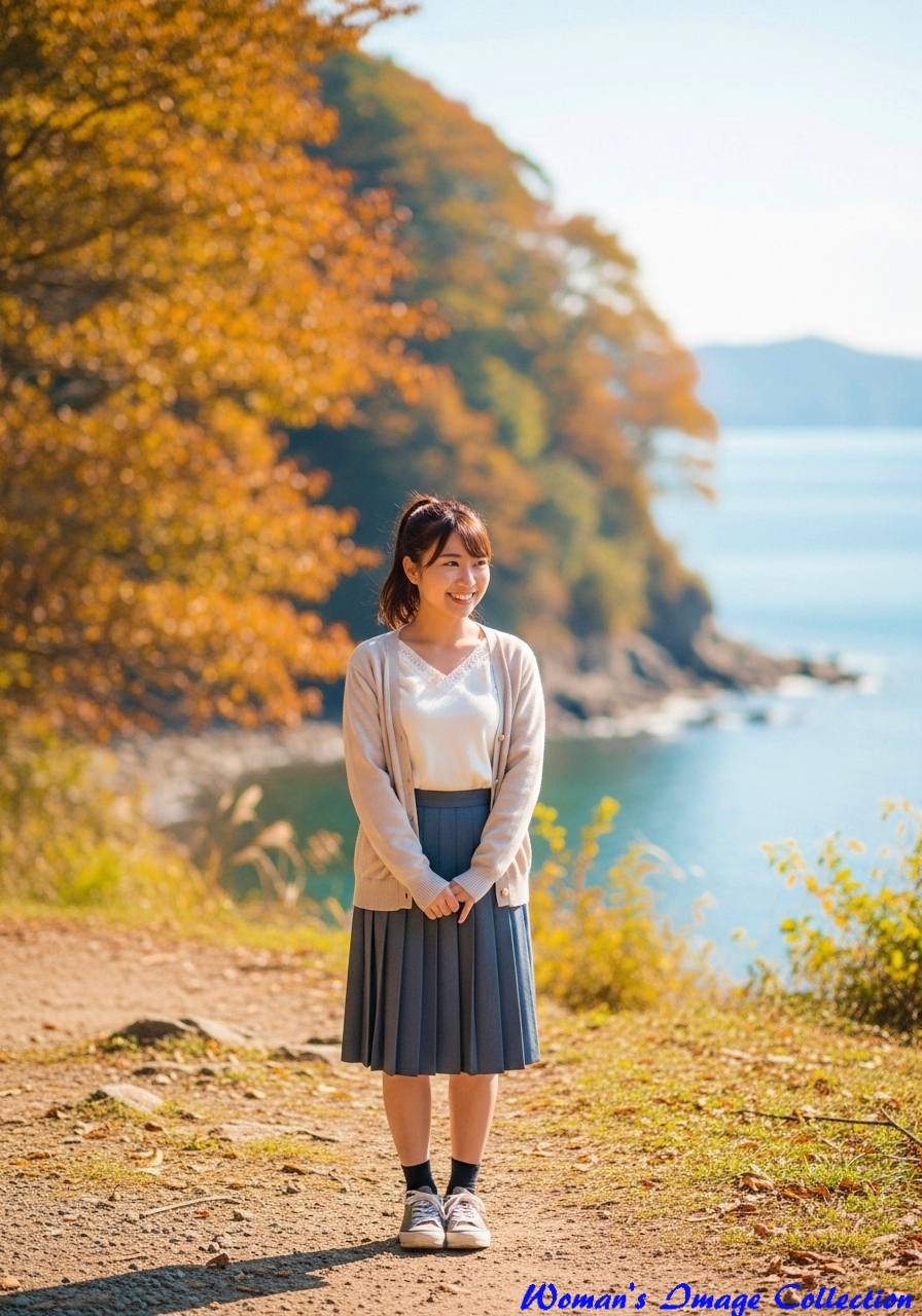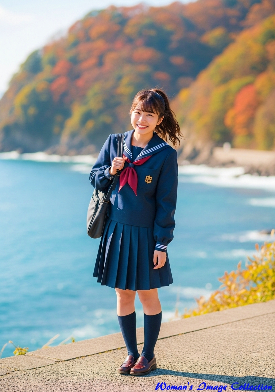 女学生を中心にチルトシフト効果を使って立体的に表現。健康的で明るい雰囲気、 茶色の髪、ポニーテール、アーモンド形の瞳、小さな鼻の日本人女学生。秋を感じる風景が美しい海岸線を訪問して楽しそうに笑っている。靴までの全身写真