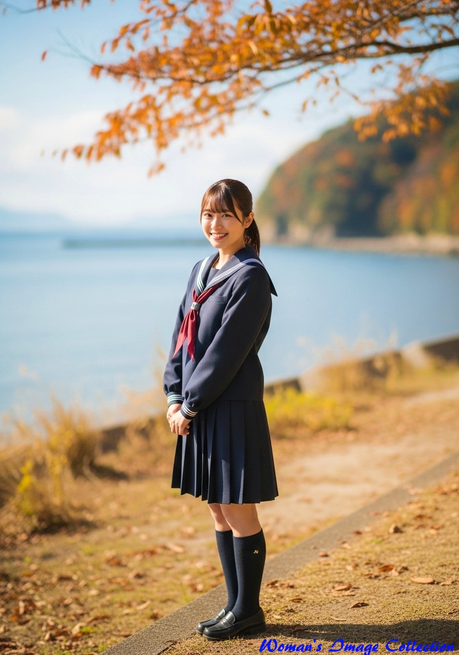 女学生を中心にチルトシフト効果を使って立体的に表現。健康的で明るい雰囲気、 茶色の髪、ポニーテール、アーモンド形の瞳、小さな鼻の日本人女学生。秋を感じる風景が美しい海岸線を訪問して楽しそうに笑っている。靴までの全身写真