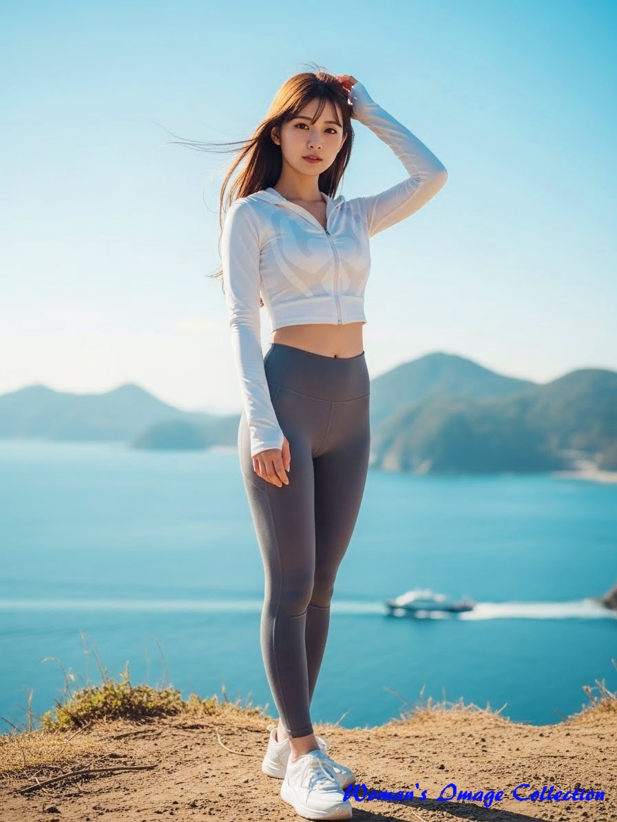 今回は、白の長袖のジップアップスポーツウェアと灰色のレギンスの女性が