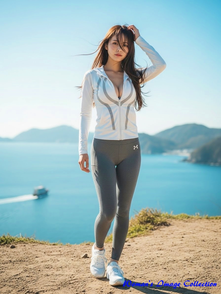 服装 (胸元を強調するデザインの白の長袖のジップアップスポーツウェア, 灰色のレギンス, 白いスニーカー),