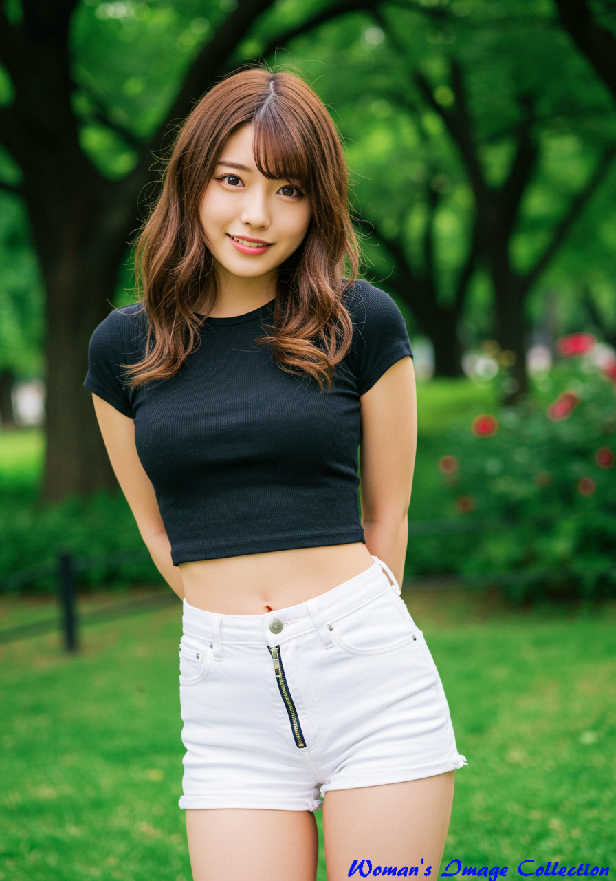 キャミソールとミニスカとの上にキャメル色のライダースジャケット、ニーハイブーツの女性のプロンプト。秋の紅葉の中に立たせて、赤系の服を着せてみました。秋らしいいいい感じが出ていると思います。このプロンプトは下のプロンプトの右上にある「□」をク...