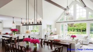 今回は、上の画像の部屋のプロンプトに女性を立たせてみました。部屋は、白をベースとして、広々としたオープンプランのリビングダイニングとキッチン。高い勾配天井と梁、巨大な窓から差し込む自然光、ダークウッドのダイニングテーブルと椅子、豪華なピンク...