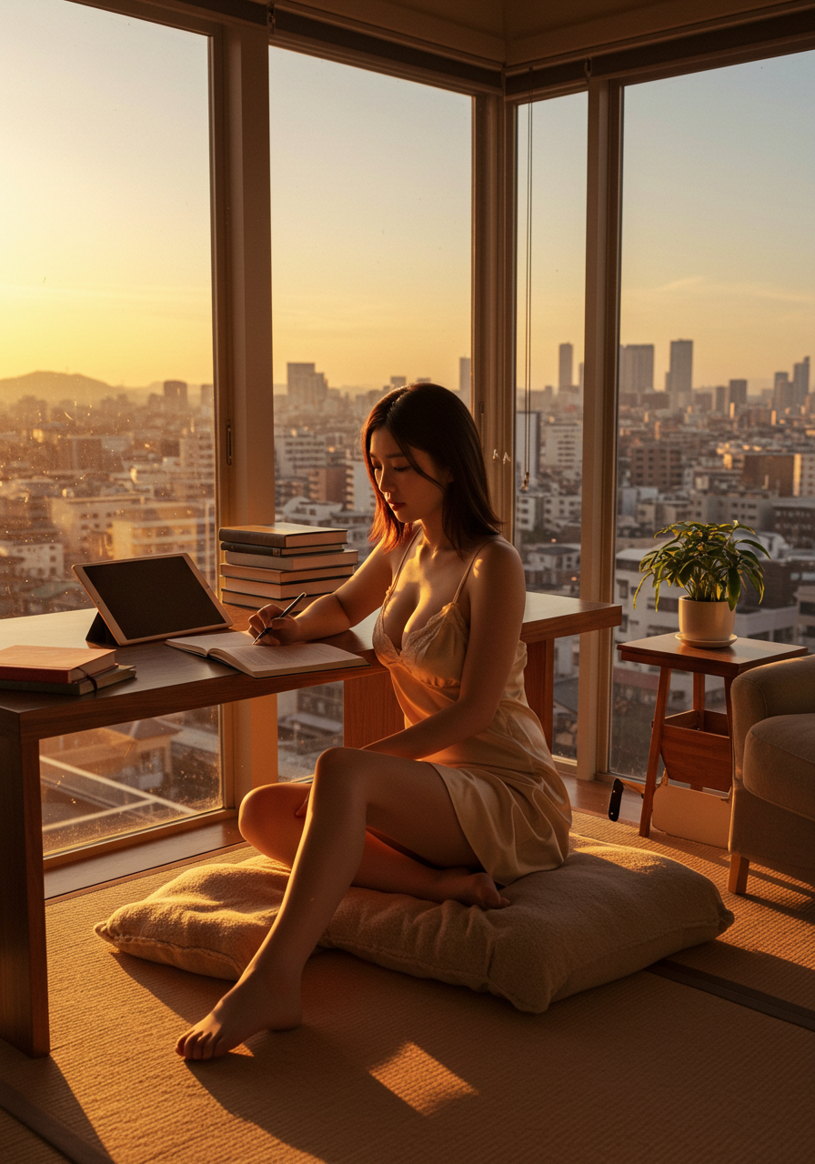 キャミソールドレスの女性が、足を少し上げて、木製の壁に寄りかかっている画像のプロンプト。このプロンプトで画像を生成すると、脚が変な方向に曲がっている画像が若干作成されます。このプロンプトは下のプロンプトの右上にある「□」をクリックすることで...