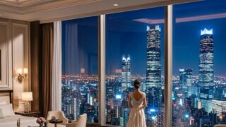 imageFX    高級ホテルで窓の外の夜景を見ているドレスの女性の姿のプロンプト