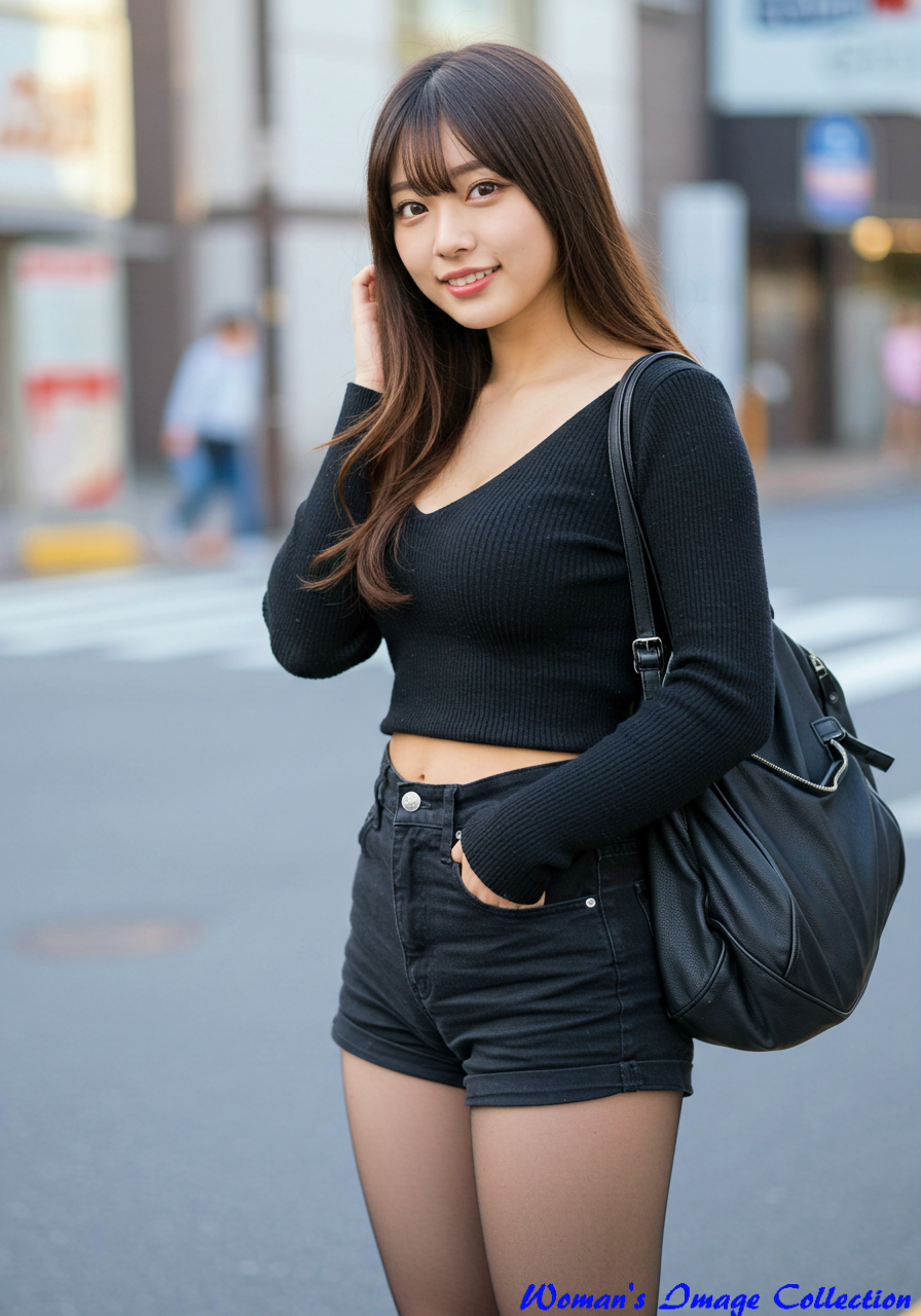 A voluptuous Japanese woman with a gal-style look, vary tall and very long legs ,skinny woman, the great long large breast. This full-length portrait of a cute Japanese actress in her twenties with a long-cut features a round face and an attractive, natural smile. She is wearing a black sweater top, and Low-rise black hemp shorts, Black stockings that would be perfect for the cover of a fashion magazine. pose in the tokyo street. black bag.
