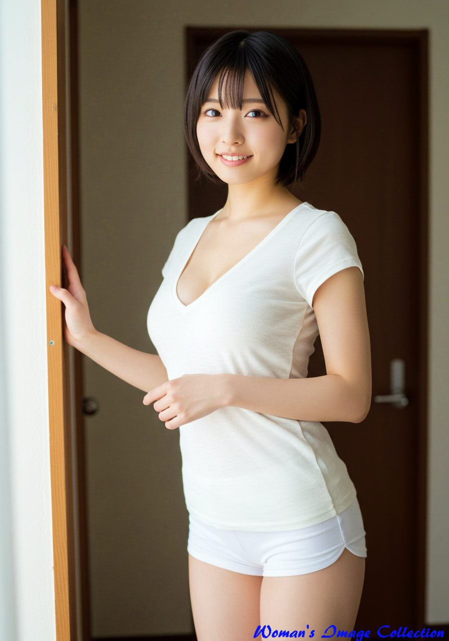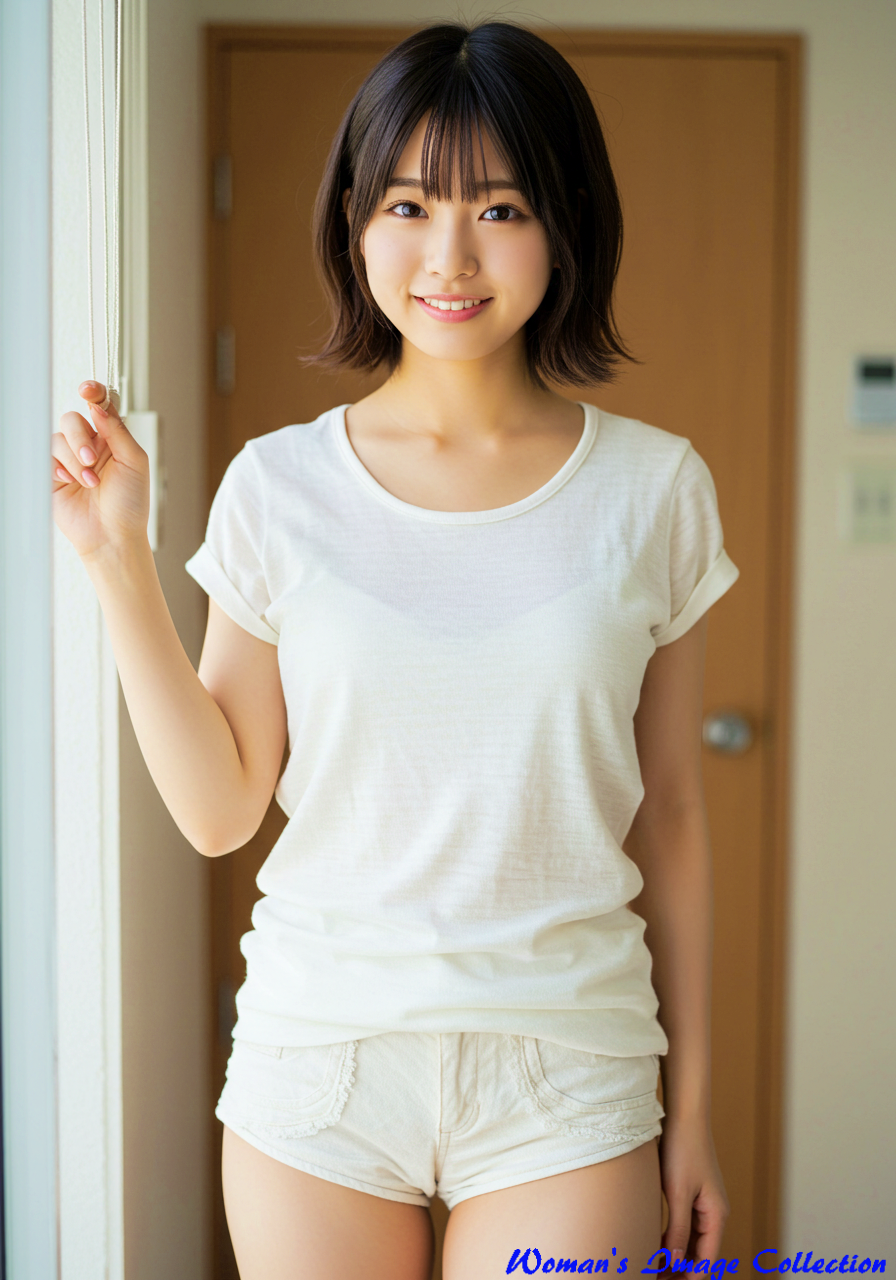 A voluptuous japanese girl, vary tall and very long legs ,skinny woman, the great long large breast. This full-length portrait of a cute Japanese actress in her twenties with a Pixie-cut features a round face and an attractive, natural smile. She is wearing white hemp T-shirt dress and Low-rise white hemp shorts that would be perfect for the cover of a fashion magazine. Cute poses in the girls rooms.