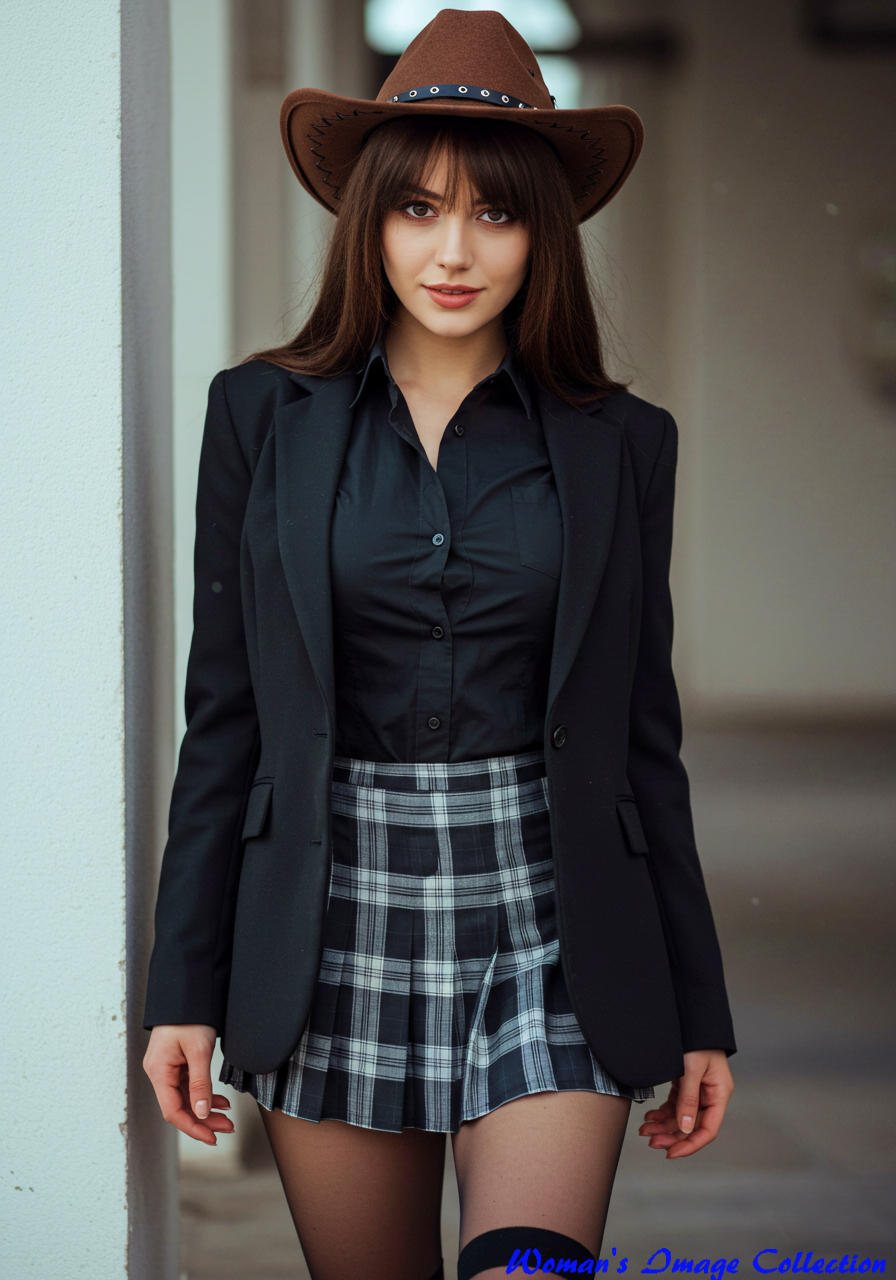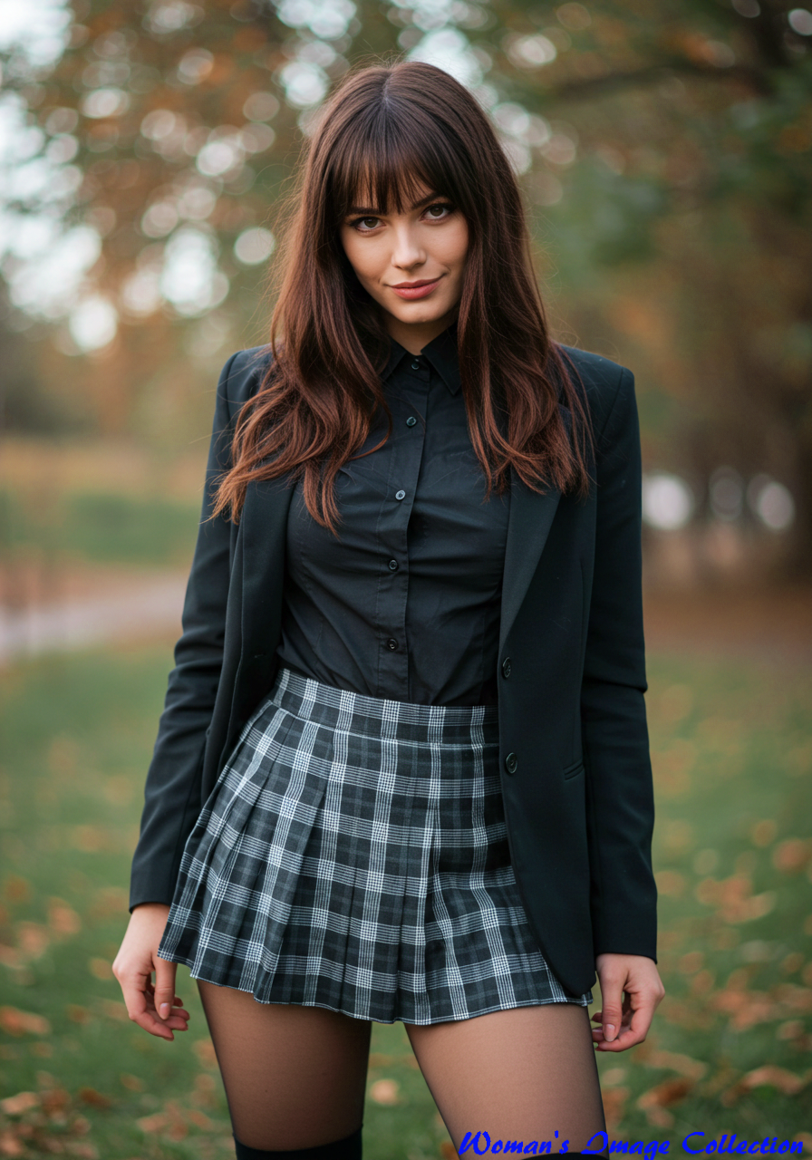 ブレザーと襟付きシャツ、プリーツショートミニスカートを着た女性を作成しました。