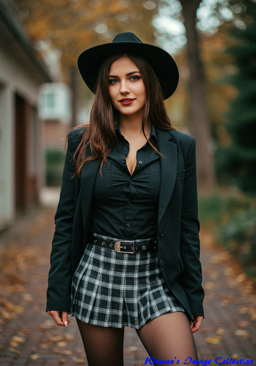 ,(Black hemmed long blazer, Black collared shirt with two-dark-color checked pleated short miniskirt outside)
