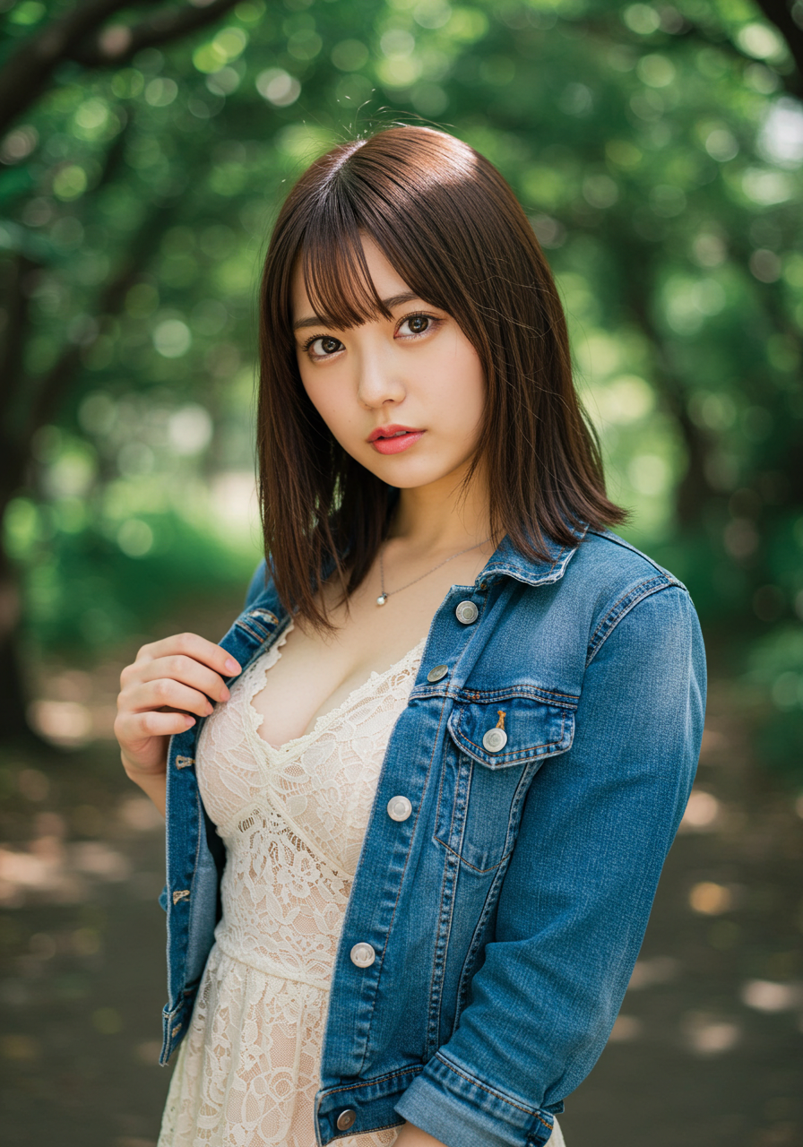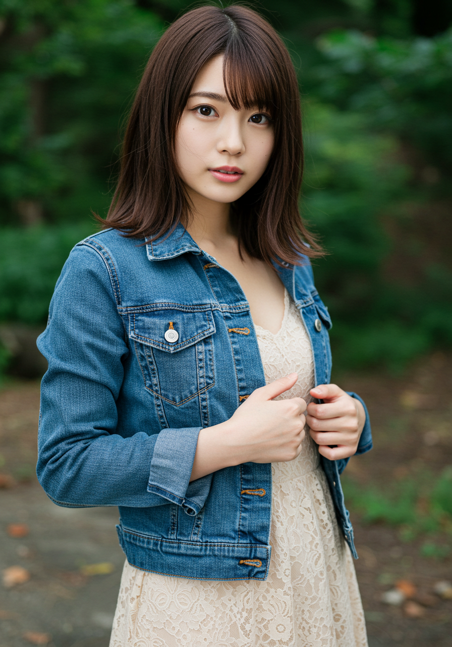 ドレスを着ている画像になりました。日本語のプロンプトで生成してみると下のようにドレスの上にジージャンを着ている画像になりました。