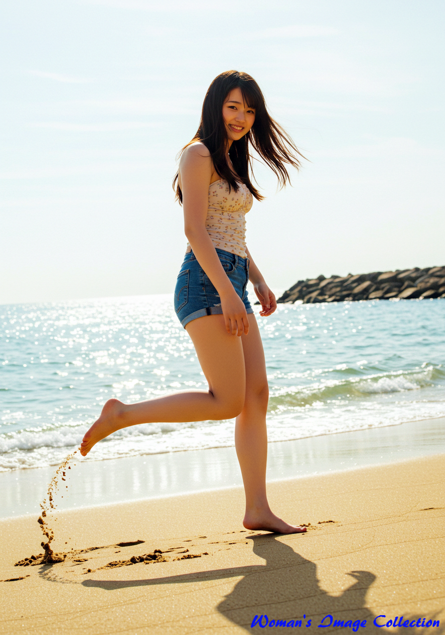 日差しが眩しくて、砂浜がぽかぽかしてて、目の前には広がる青い海と、真っ青な空。そんな完璧な夏の風景の中で、元気にジャンプしてる女の子を見たら、それだけでなんだかこっちまでテンションが上がってまうんです。
