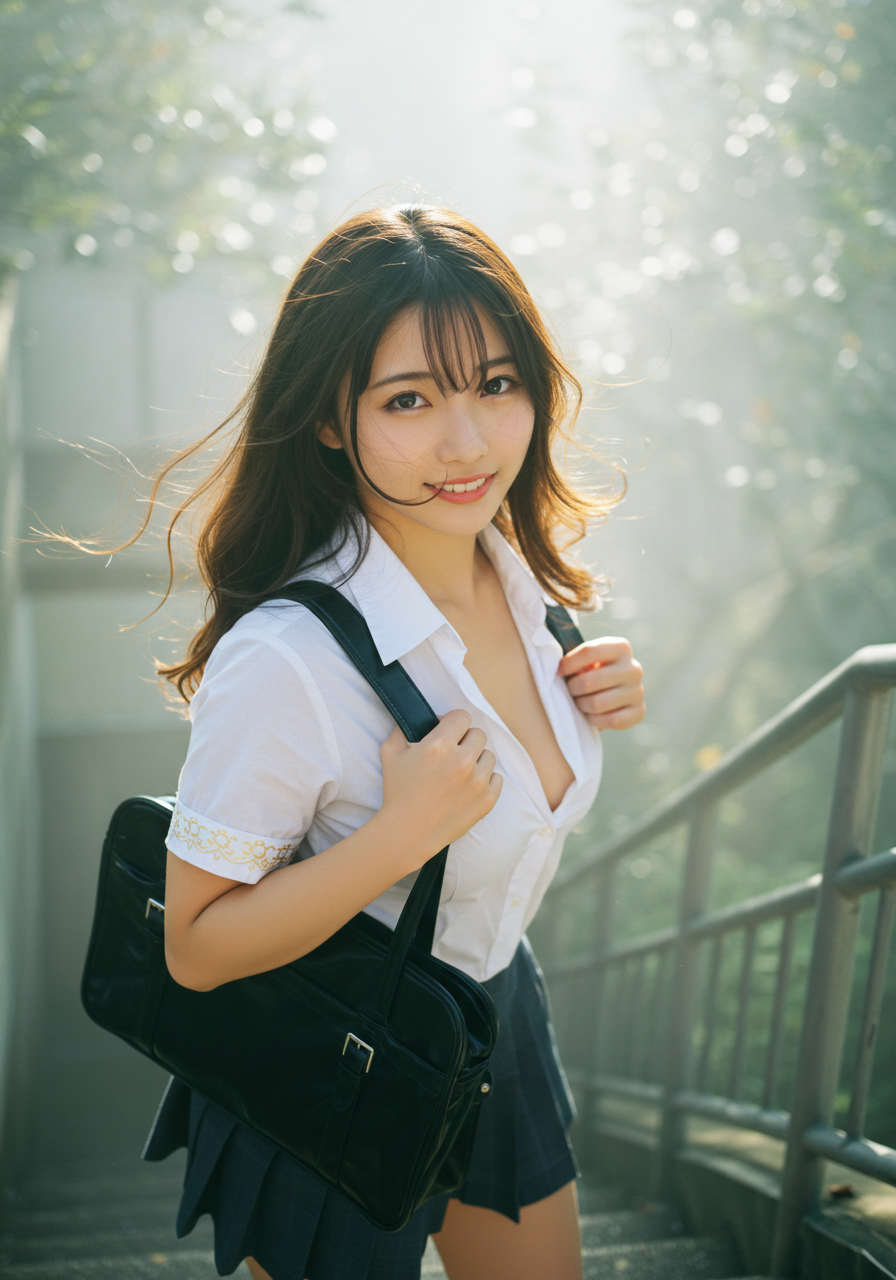 写真全体を覆う明るい光は、未来への希望を象徴しているかのようだ。しかし、その光の中にも、ほんのわずかな陰影が見え隠れする。それは、人生における喜びと悲しみ、希望と不安といった、相反する感情の存在を示唆しているのかもしれない。彼女は、その両方を抱えながら、未来へと歩んでいくのだろう。