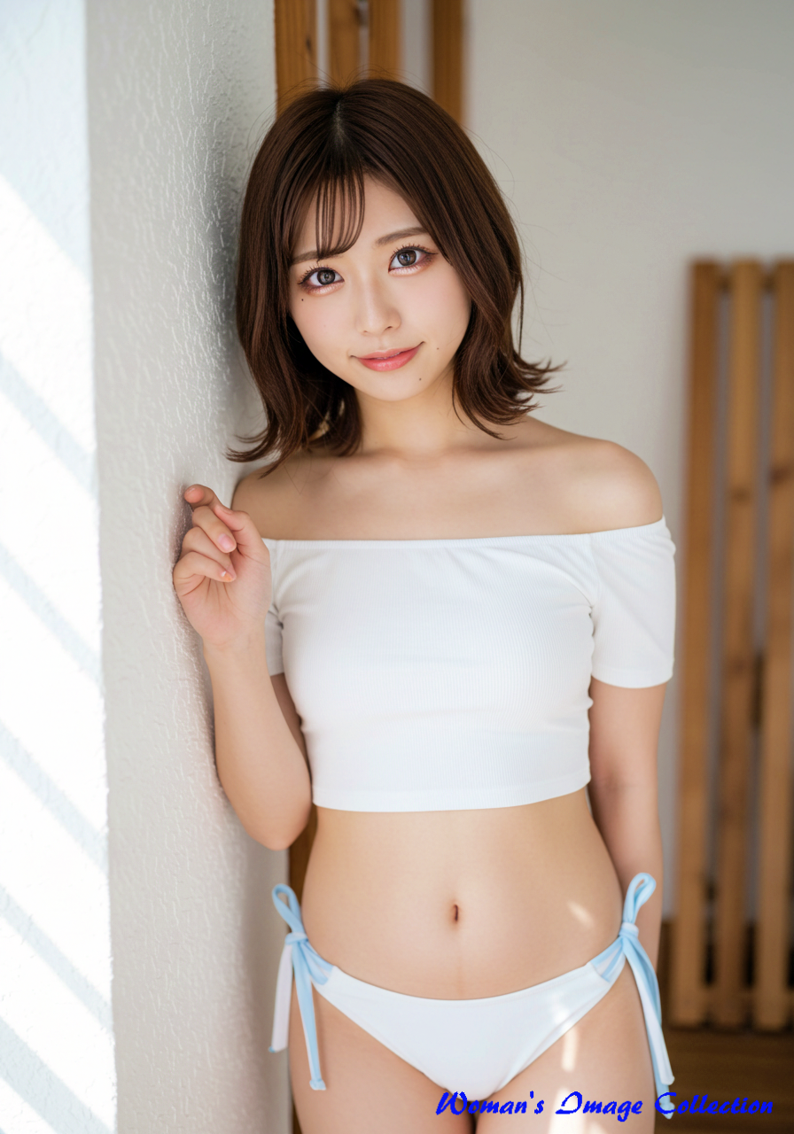 “A young japanese woman with brown hair and light makeup is standing indoors, leaning against a white textured wall. She is looking directly at the camera with a gentle expression. She wears a white off-the-shoulder crop top and a white bikini bottom with light blue ribbon details. Her body language is relaxed and natural. The lighting is soft and natural, coming from a window, creating a clean, bright, and slightly dreamy atmosphere. In the background, there are some wooden panels or slats, adding a warm texture to the clean background. High quality, realistic, natural lighting.”