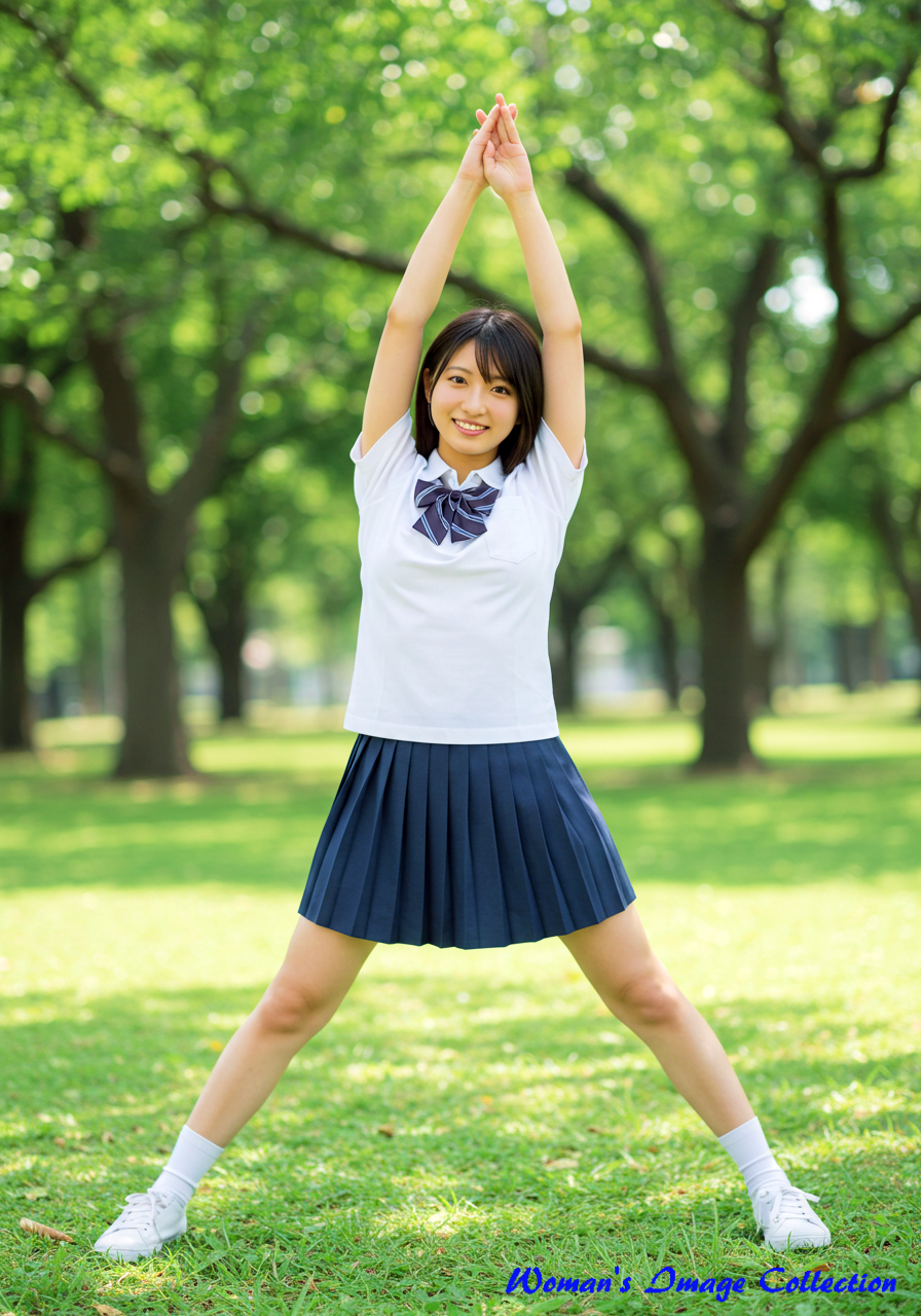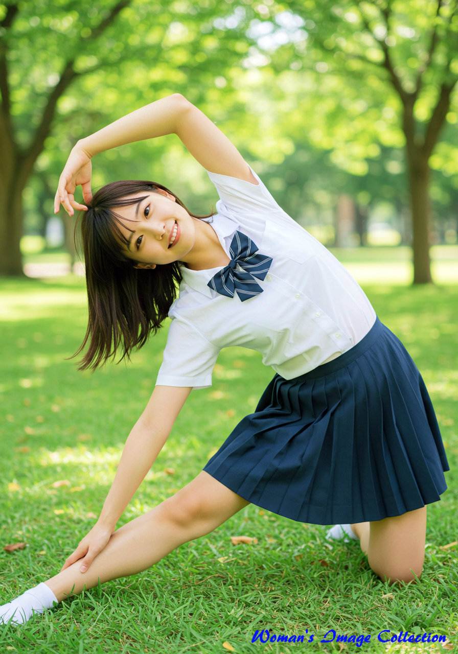 (A Japanese girl, in her summer uniform, doing yoga stretches in a quiet park, green grass and trees.)