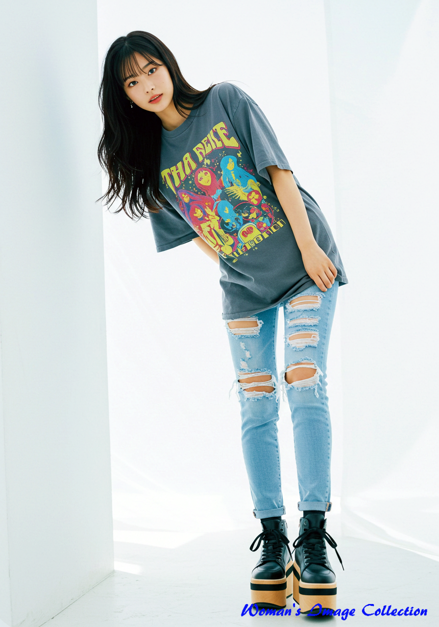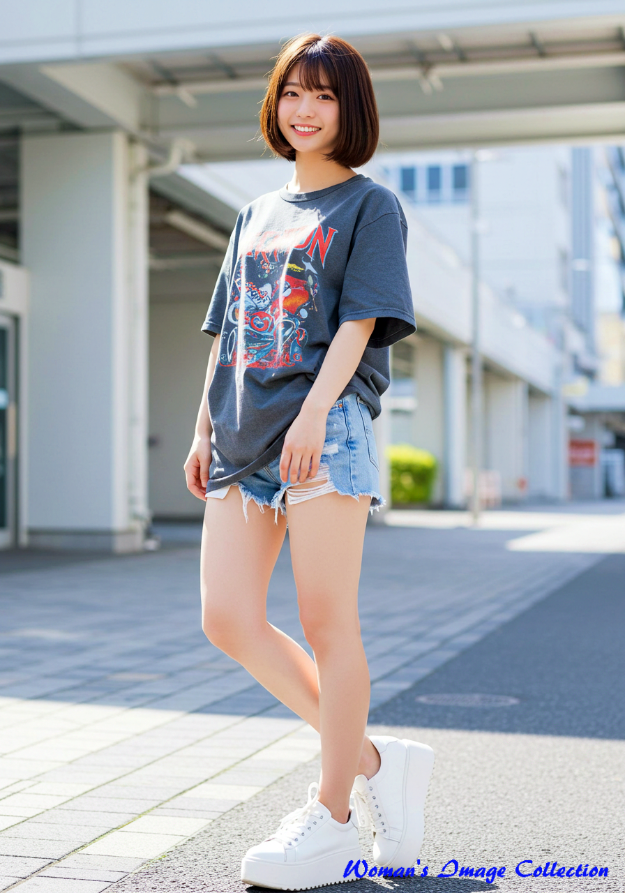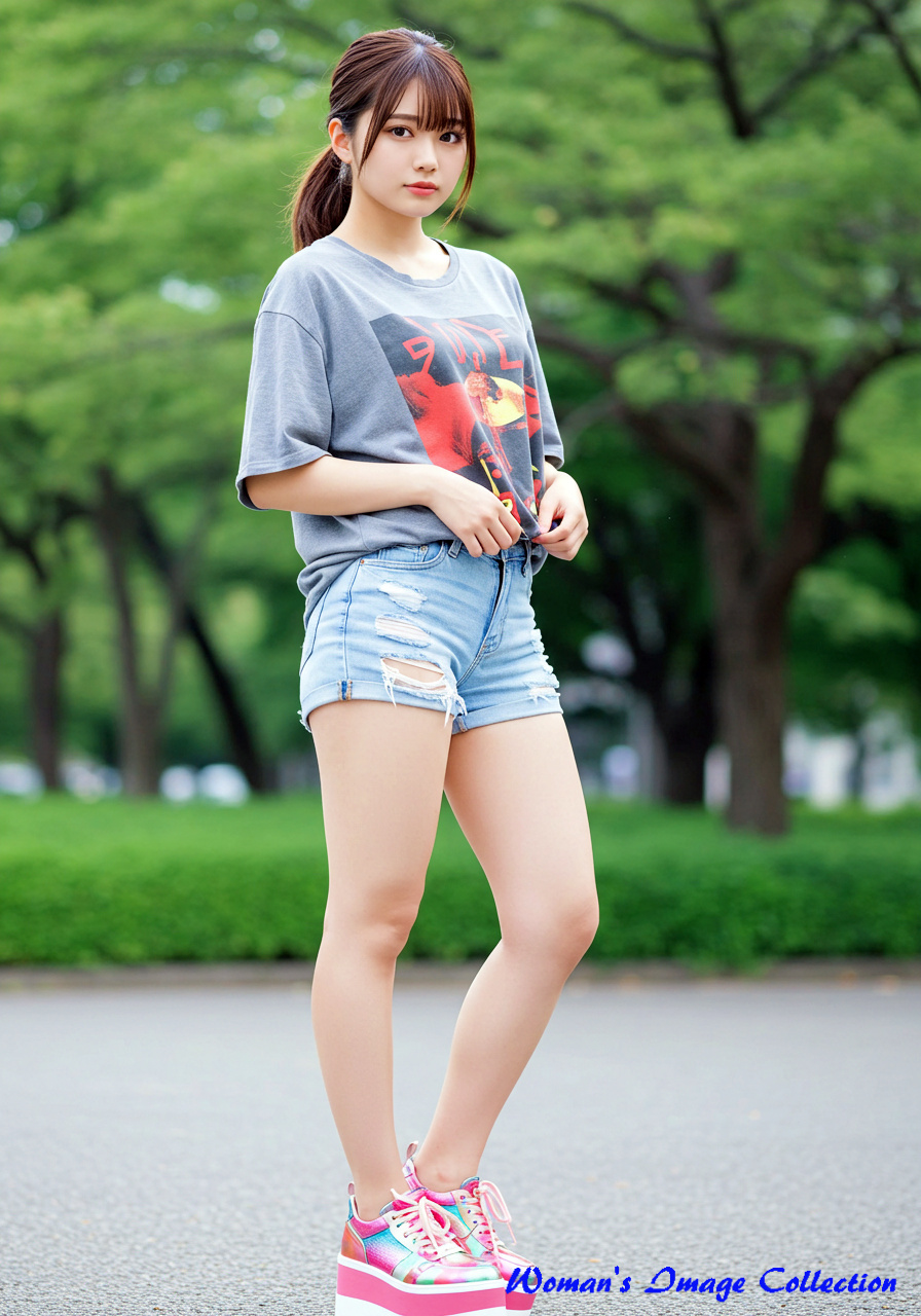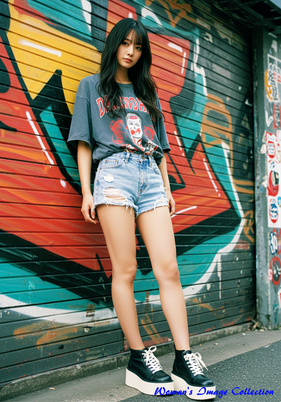 ライトウォッシュの破れたデニムショートパンツ、オーバーサイズのグラフィックTシャツ、そしてプラットフォームスニーカーを履いたおしゃれな日本人の女の子。