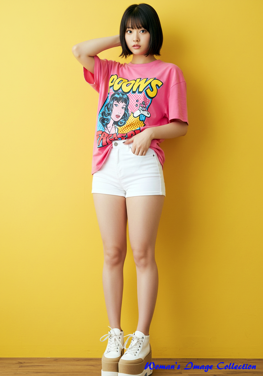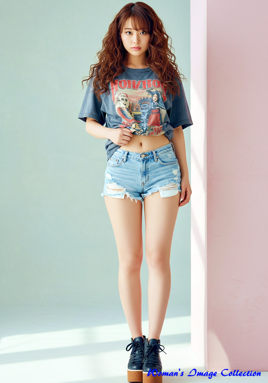 彼女が身につけているのは、黒いTシャツと、ダメージ加工が施されたデニムのショートパンツだ。Tシャツには、日本の漫画やアニメを思わせるような、鮮やかなキャラクターのイラストがプリントされており、彼女のサブカルチャーへの愛着をうかがわせる。ショートパンツの切りっぱなしの裾や、破れたようなダメージ加工が、彼女のワイルドな魅力を際立たせている。