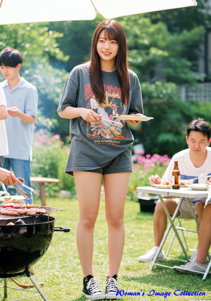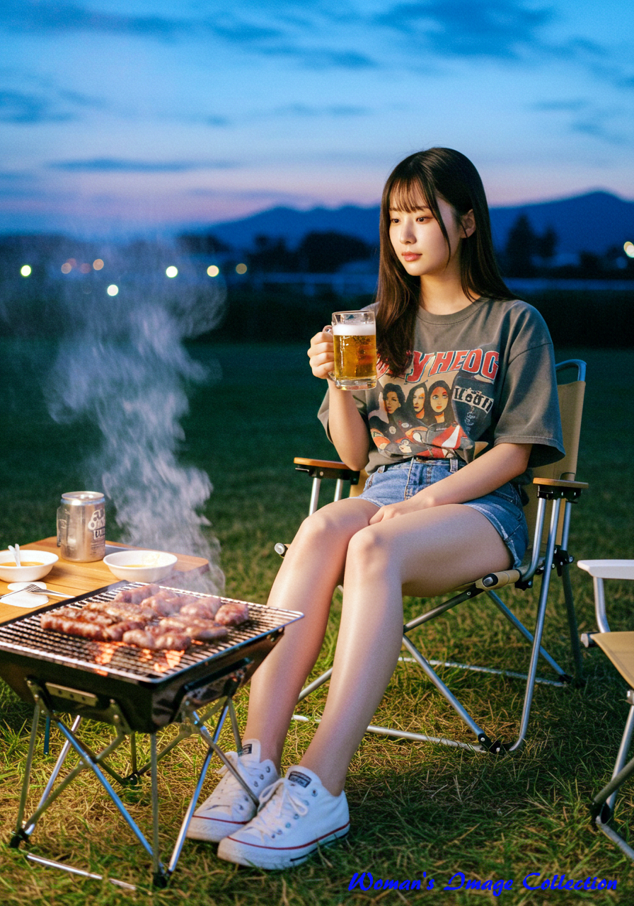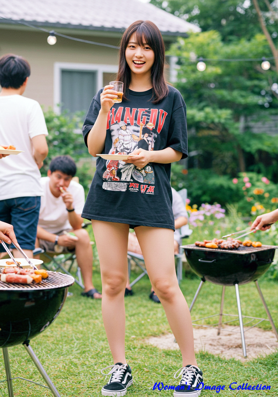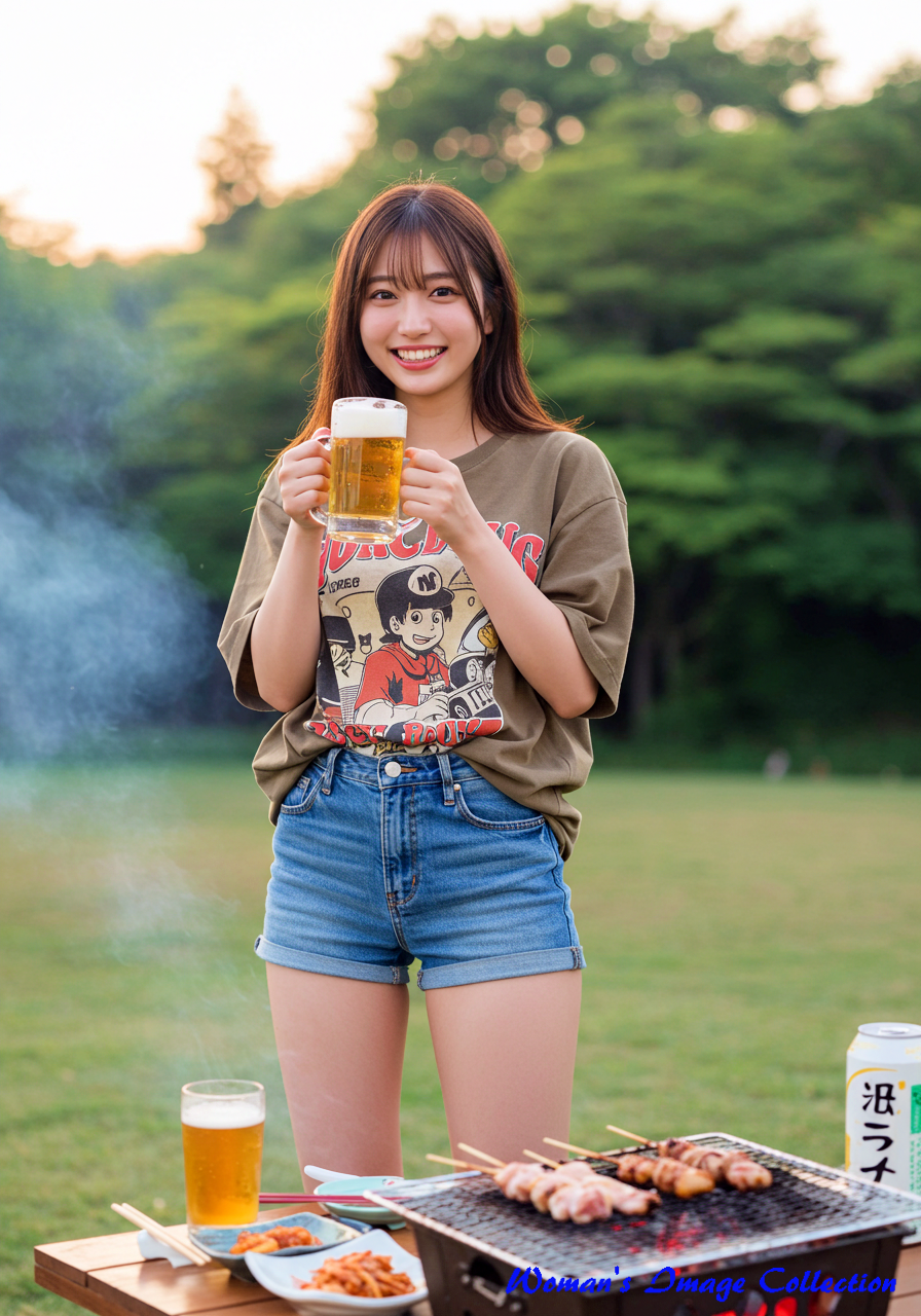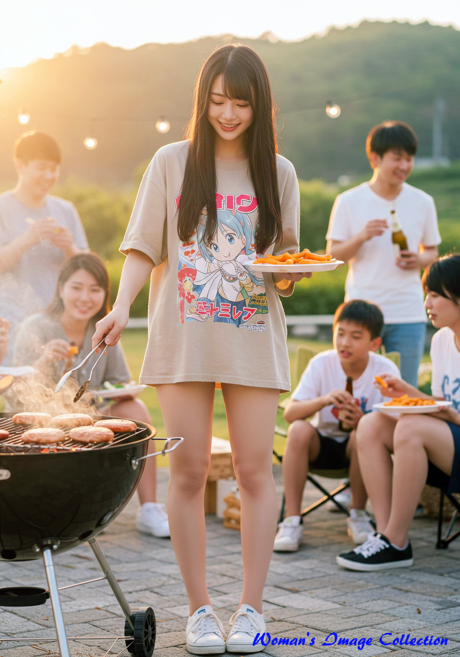 その写真を見たとき、私は夏の夕暮れ時に漂う、甘く、懐かしい香りを思い出した。それは、炭火で焼ける肉の匂い、夕日に染まる木々の匂い、そして、ビールがグラスの中で弾ける音。この写真に写る彼女は、そんな夏の記憶の真ん中に立ち、心からその瞬間を楽しんでいるかのようだ。