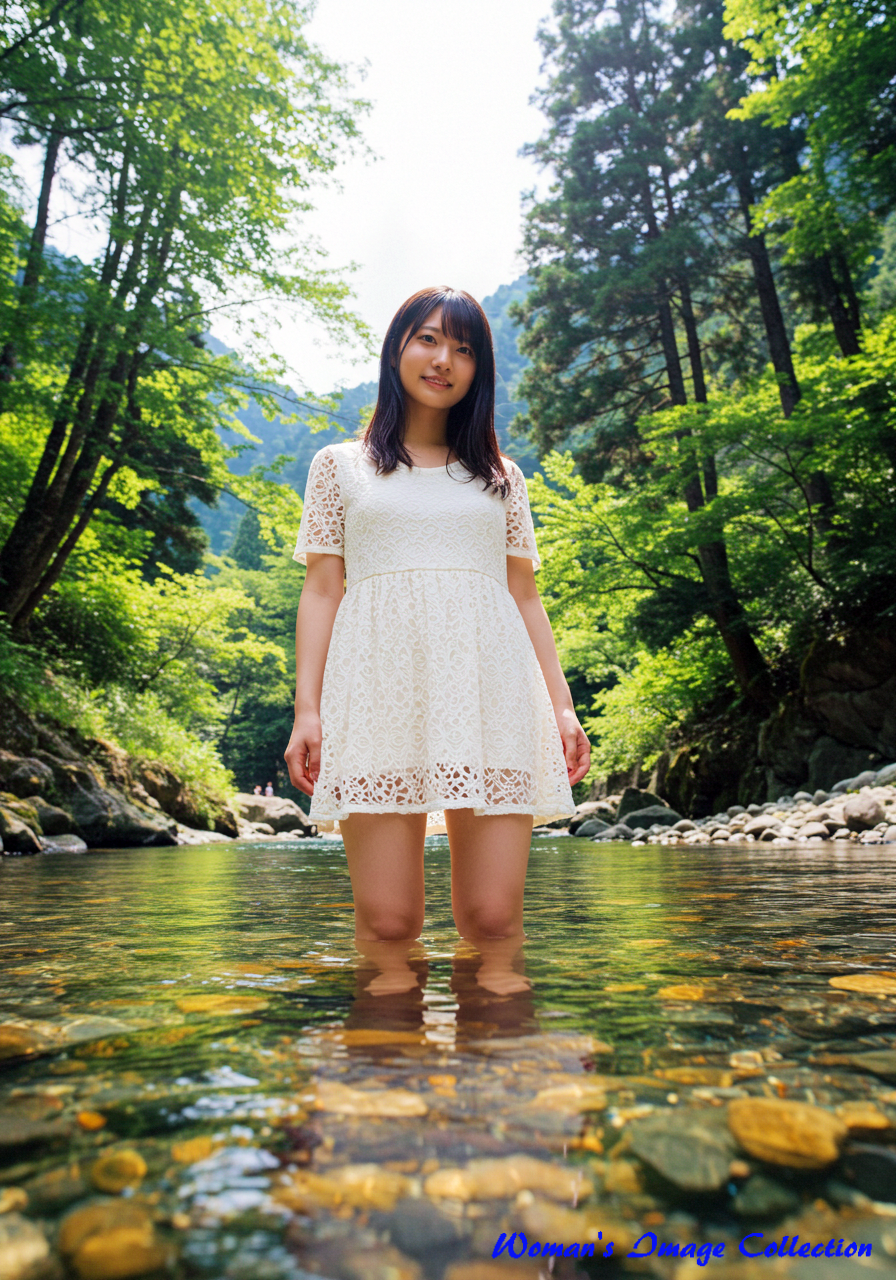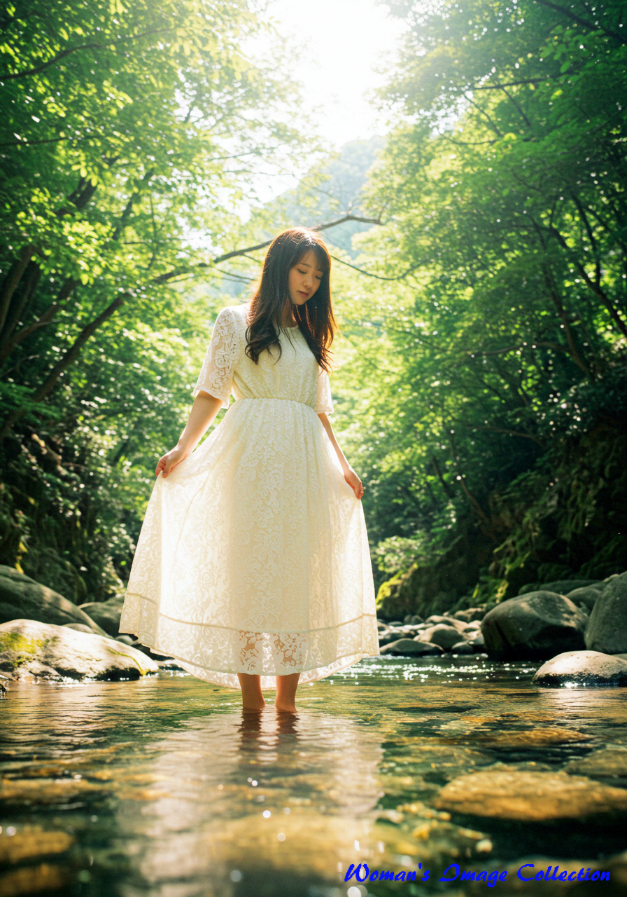 彼女の足元は、清らかな川の水に浸かっている。その水面には、太陽の光が反射してきらめき、そのきらめきが、彼女の周りに柔らかな光のドットを作り出している。川底の石や、水草が、この写真の持つ静けさに、かすかな動きを加え、見る者の想像力を掻き立てる。背後に広がる青々とした木々と、山の稜線が、彼女の存在を、より一層、際立たせている。